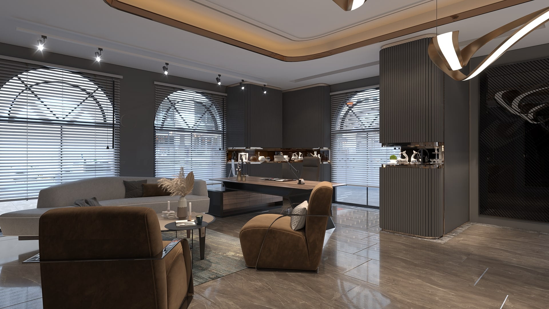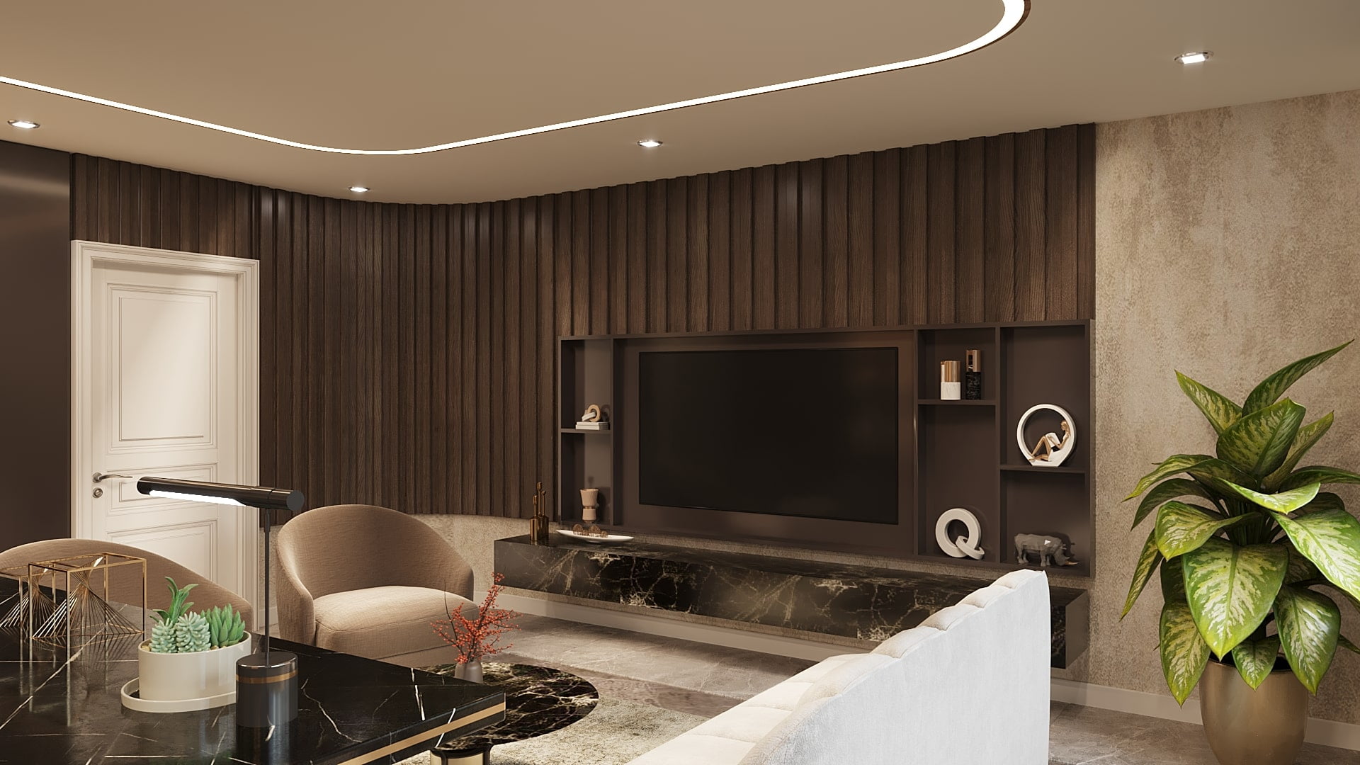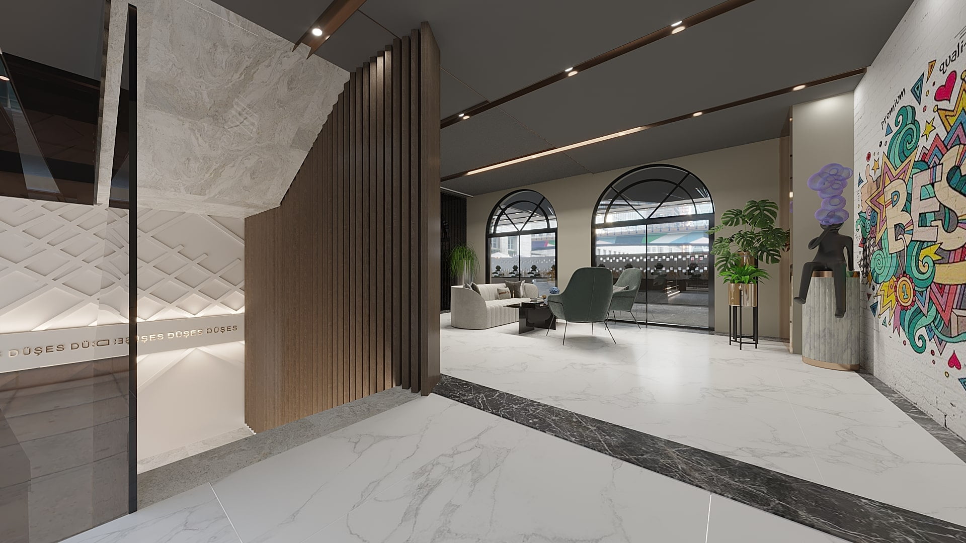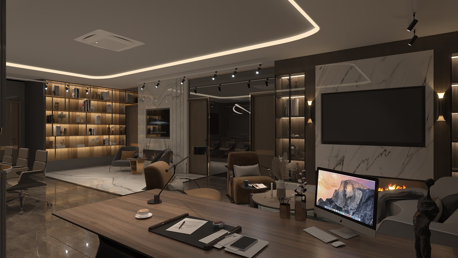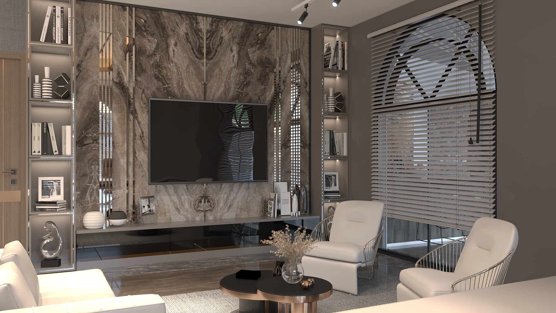 Bu proje için sadelik ve şıklığın uyumu yakalanarak kullanıcıların beklentilerini ve görsel zevklerini karşılayan tasarımlar geliştirildi. Salon ve yemek alanını ayıran şık şömine tasarımıyla ahşabın doğal sıcaklığı, mermerin zarif dokusuyla birleştirildi ve duvar dekorasyonlarıyla mekâna kimliği kazandırıldı. Cam vitrindeki Led ışık detayları ile modern dokunuşlar yapıldı.