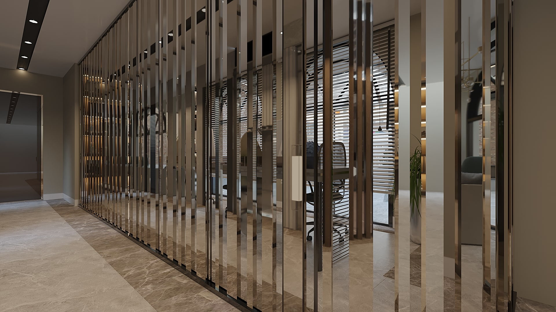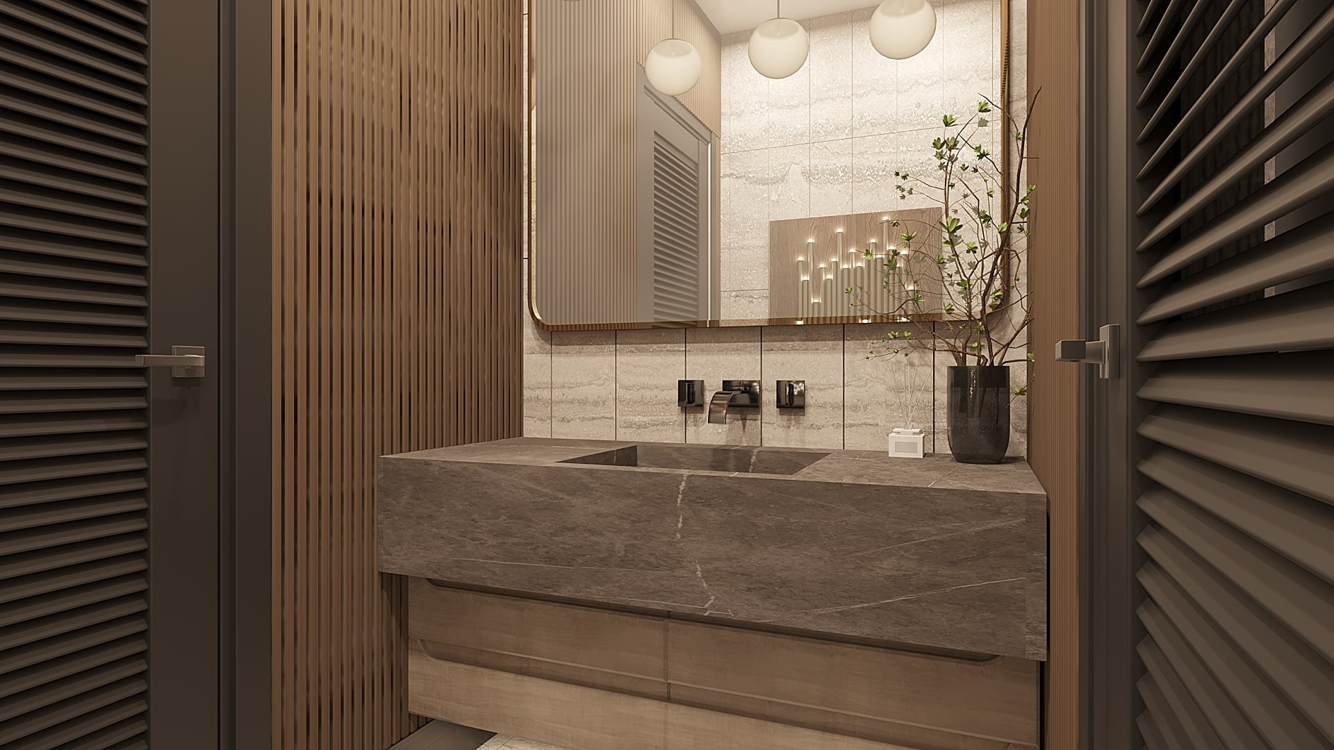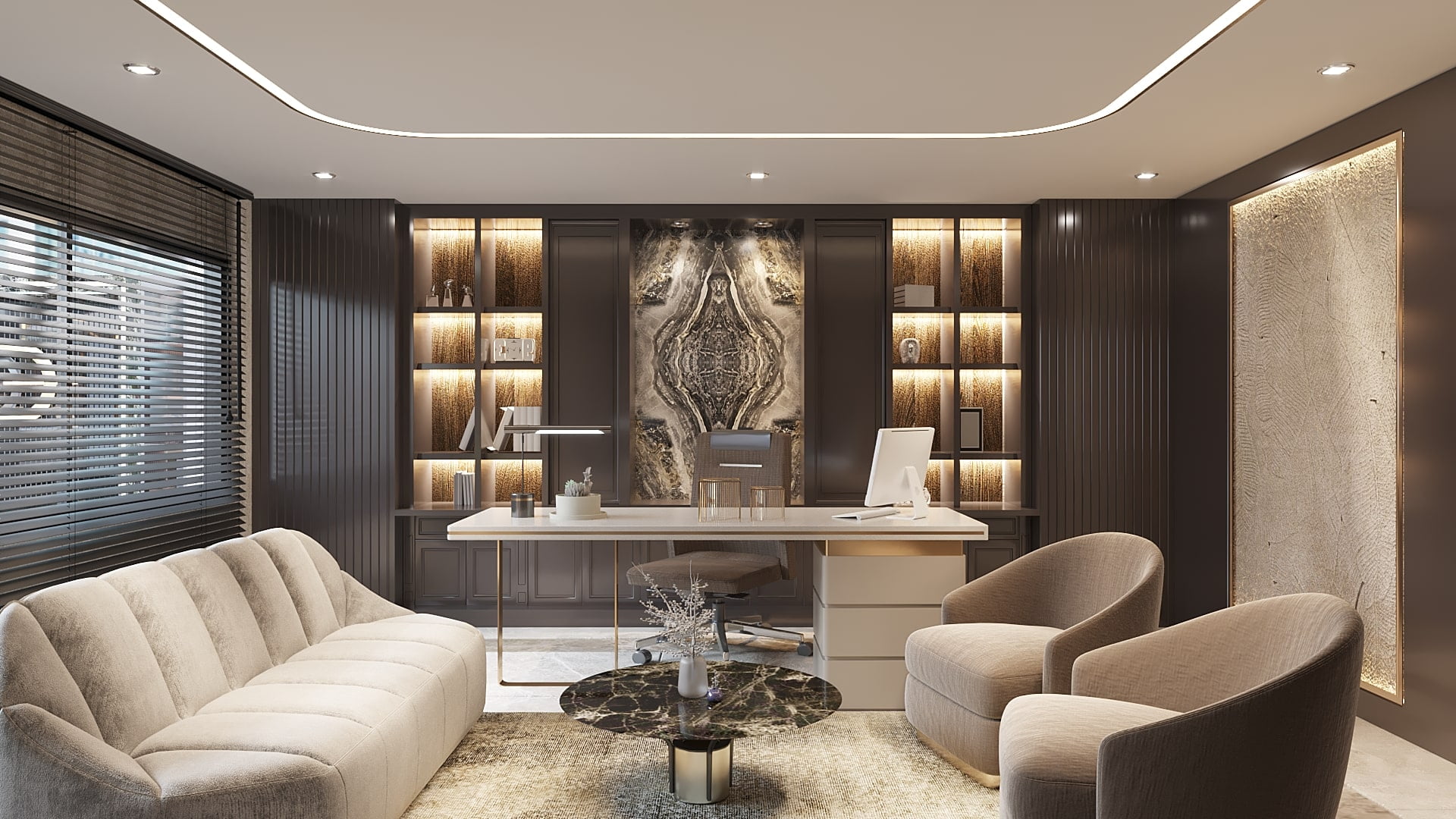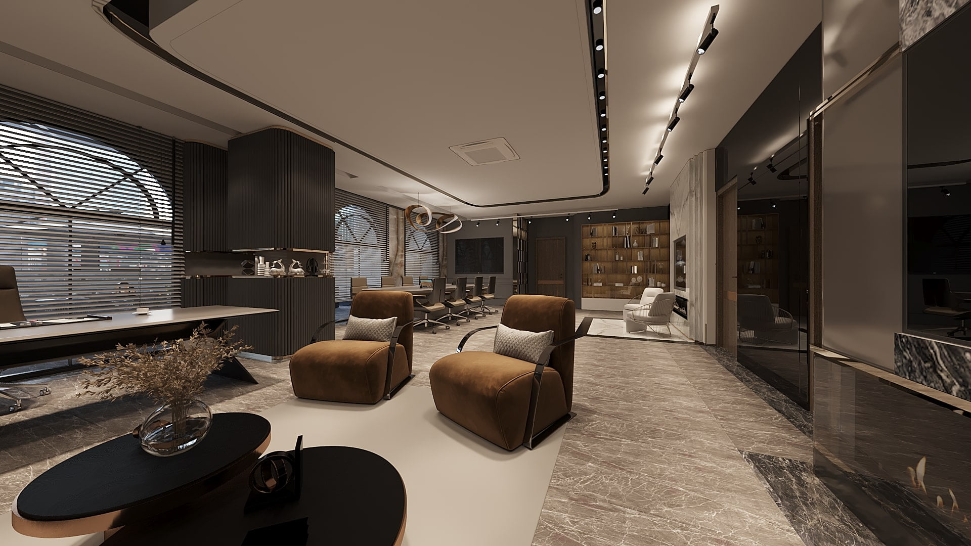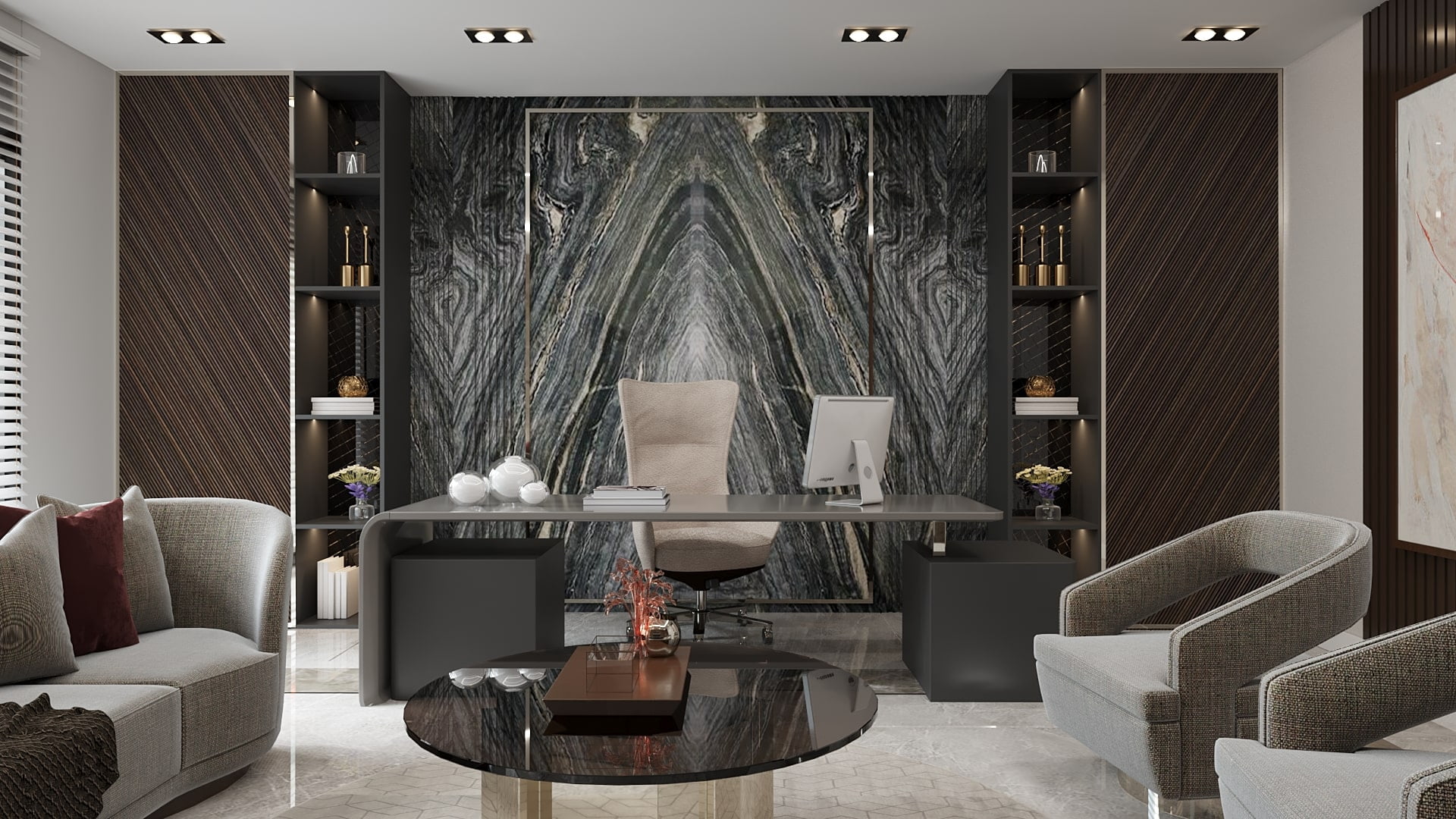 Bu proje için sadelik ve şıklığın uyumu yakalanarak kullanıcıların beklentilerini ve görsel zevklerini karşılayan tasarımlar geliştirildi. Salon ve yemek alanını ayıran şık şömine tasarımıyla ahşabın doğal sıcaklığı, mermerin zarif dokusuyla birleştirildi ve duvar dekorasyonlarıyla mekâna kimliği kazandırıldı. Cam vitrindeki Led ışık detayları ile modern dokunuşlar yapıldı.