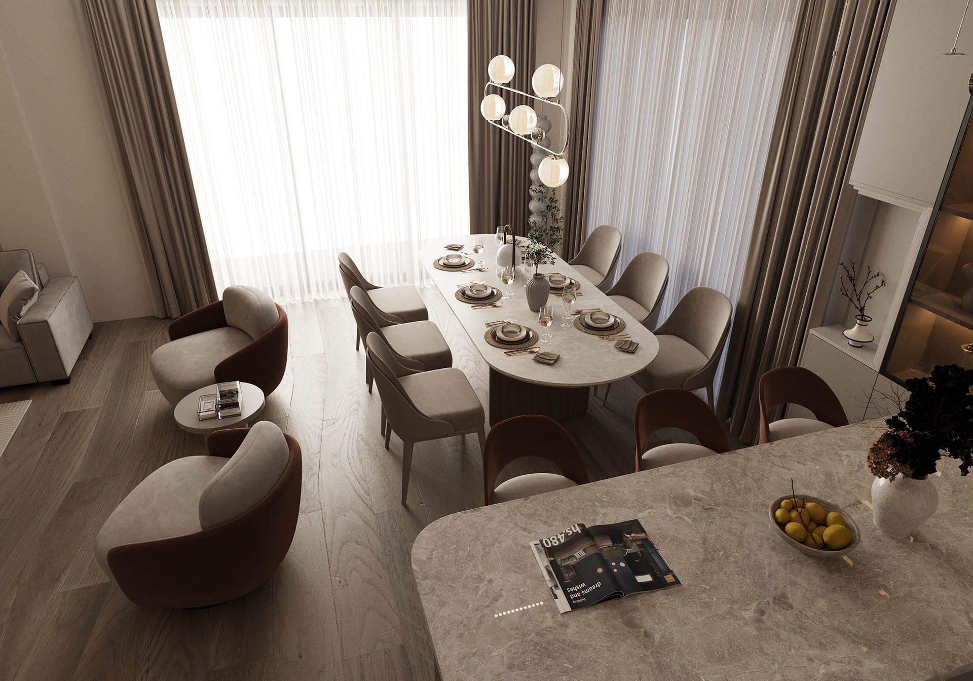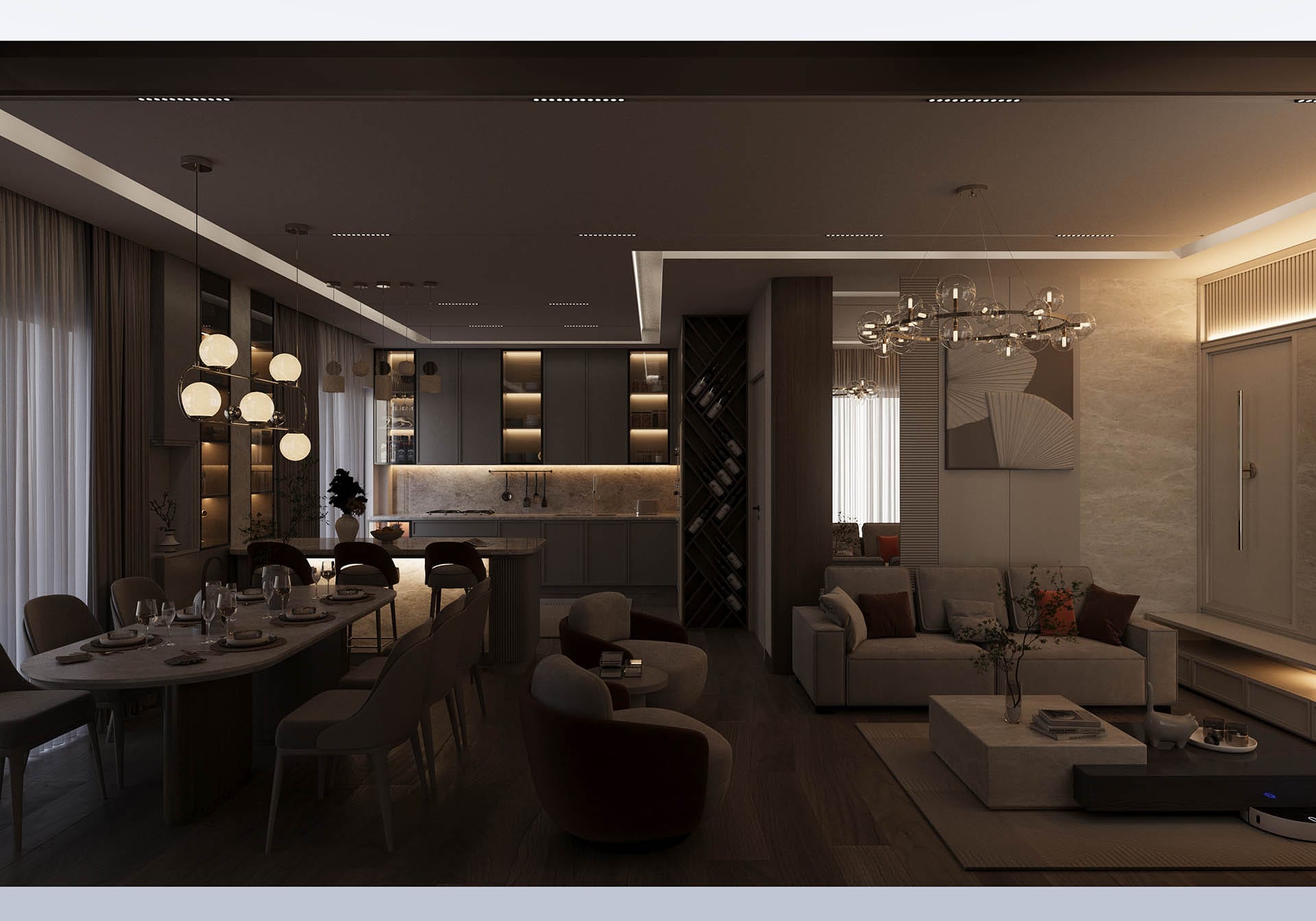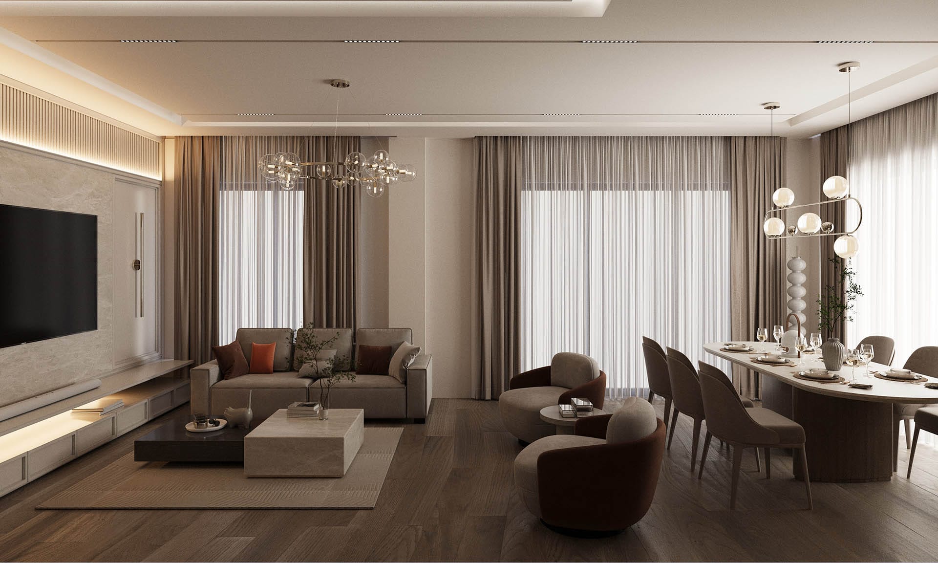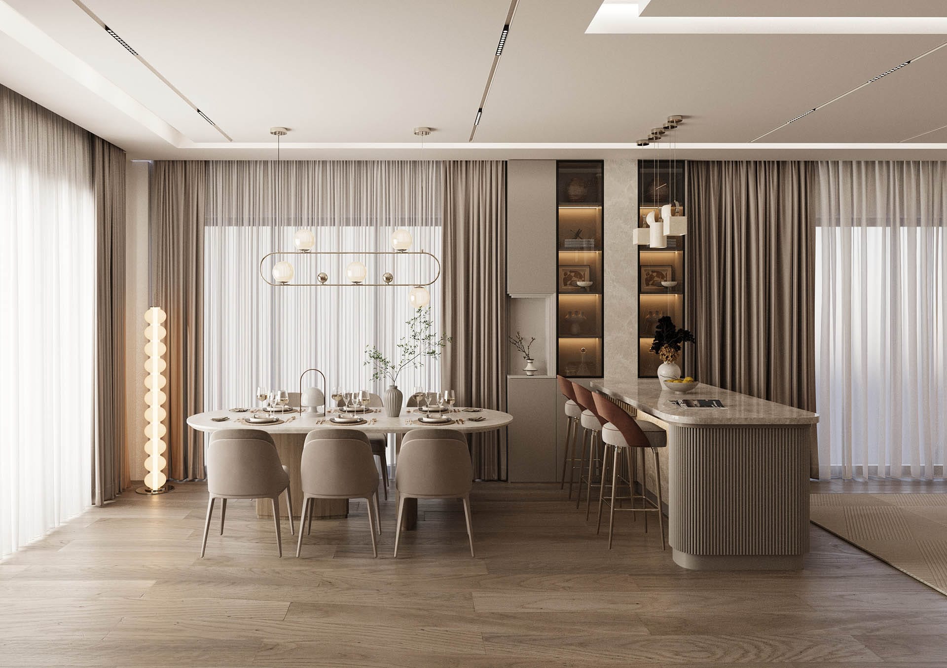 Edirne’de konumlanan bu villa projesinin modern çizgilerle zamansız bir şıklığı bir araya getiren bütüncül bir iç mekân anlayışıyla tasarlandığı görülmektedir. Projede açık renk paleti, doğal dokular ve yumuşak geçişler ön planda tutularak ferah ve dengeli yaşam alanları oluşturulmuştur. Salon ve yemek alanında kullanılan geniş cam yüzeyler, mekâna maksimum gün ışığı alırken, perdeler ve aydınlatma detaylarıyla sıcak ve davetkâr bir atmosfer desteklenmiştir. Yemek masası ve mutfak adası arasındaki ilişki, sosyal kullanımı güçlendiren akıcı bir planlama sunmaktadır.