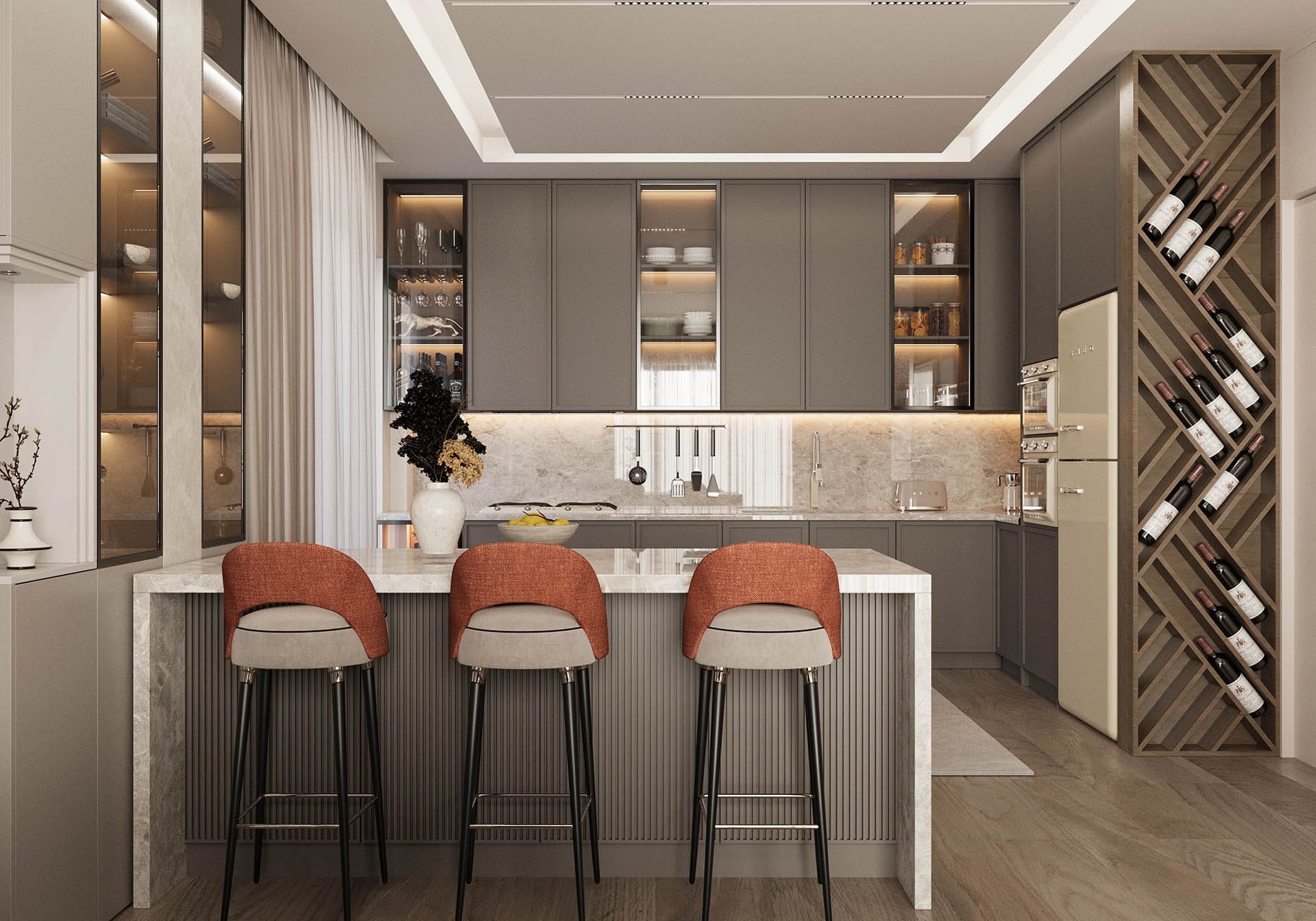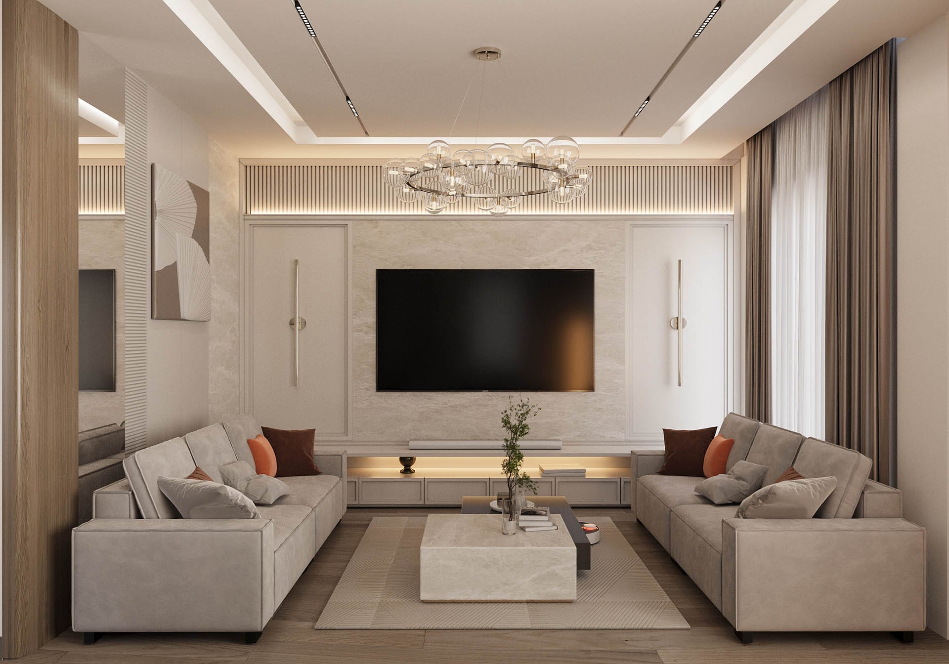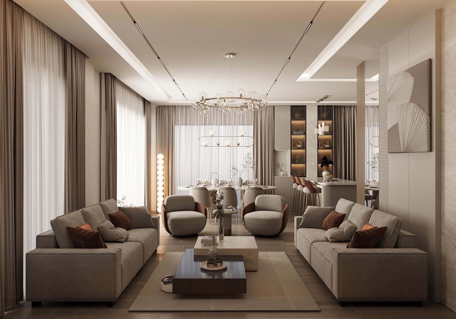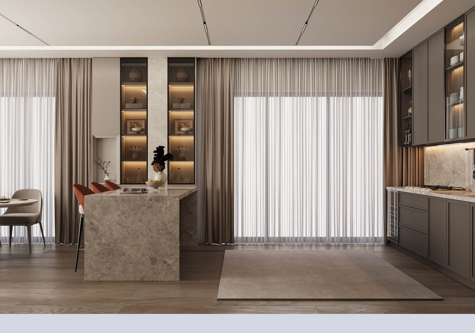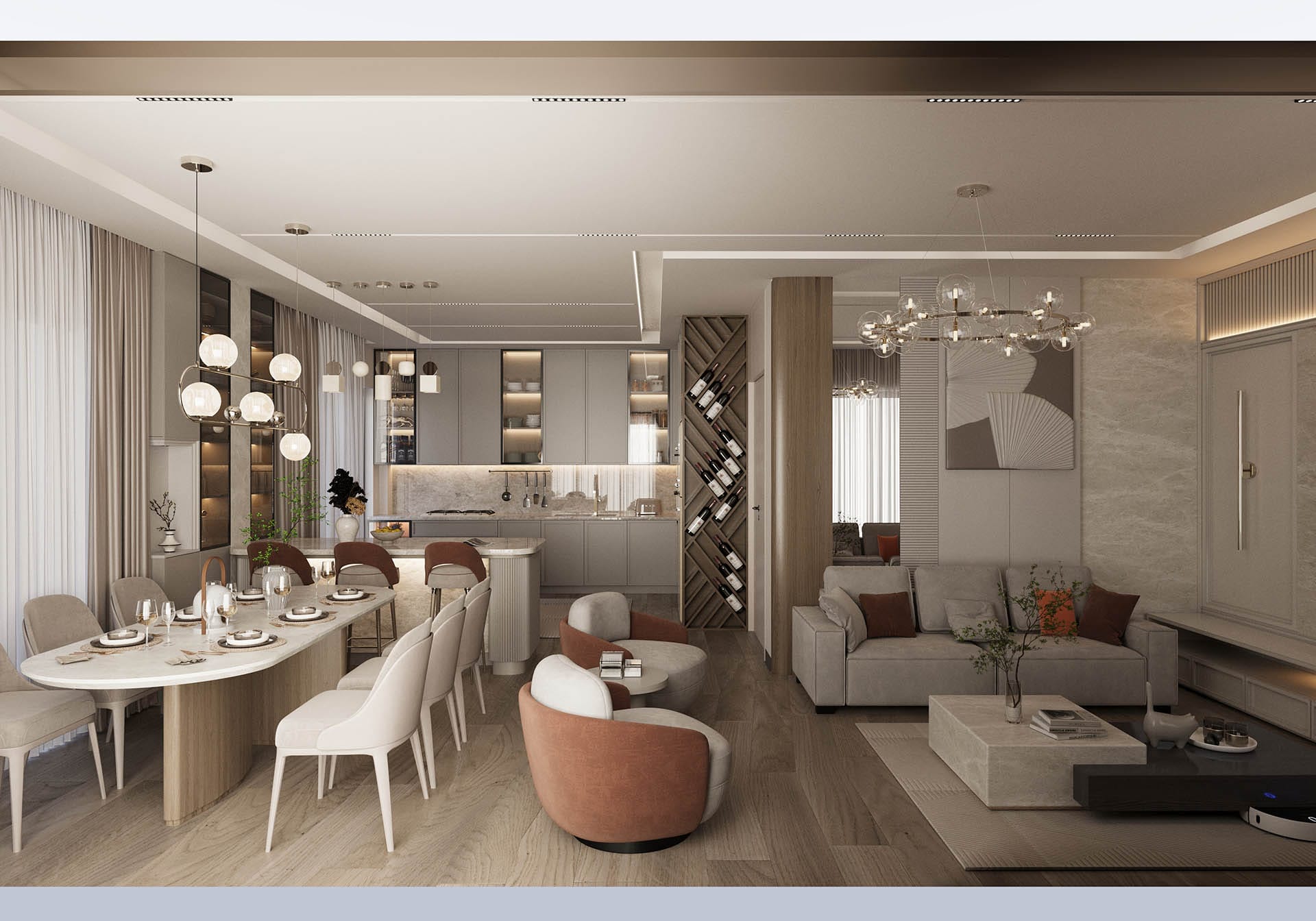Edirne’de konumlanan bu villa projesinin modern çizgilerle zamansız bir şıklığı bir araya getiren bütüncül bir iç mekân anlayışıyla tasarlandığı görülmektedir. Projede açık renk paleti, doğal dokular ve yumuşak geçişler ön planda tutularak ferah ve dengeli yaşam alanları oluşturulmuştur. Salon ve yemek alanında kullanılan geniş cam yüzeyler, mekâna maksimum gün ışığı alırken, perdeler ve aydınlatma detaylarıyla sıcak ve davetkâr bir atmosfer desteklenmiştir. Yemek masası ve mutfak adası arasındaki ilişki, sosyal kullanımı güçlendiren akıcı bir planlama sunmaktadır.