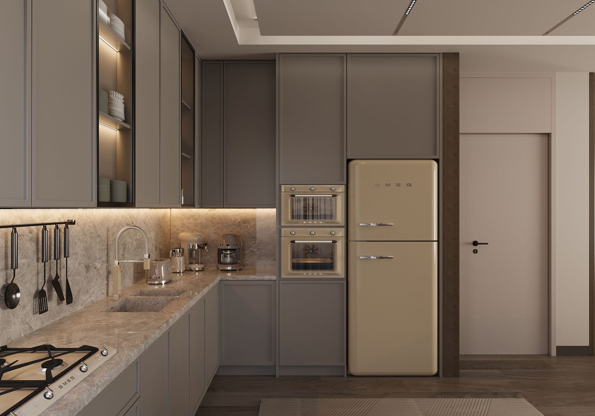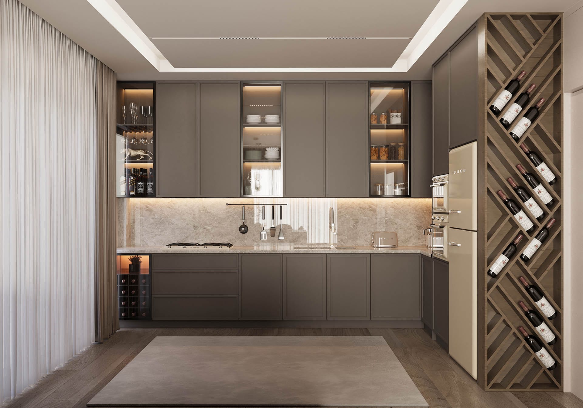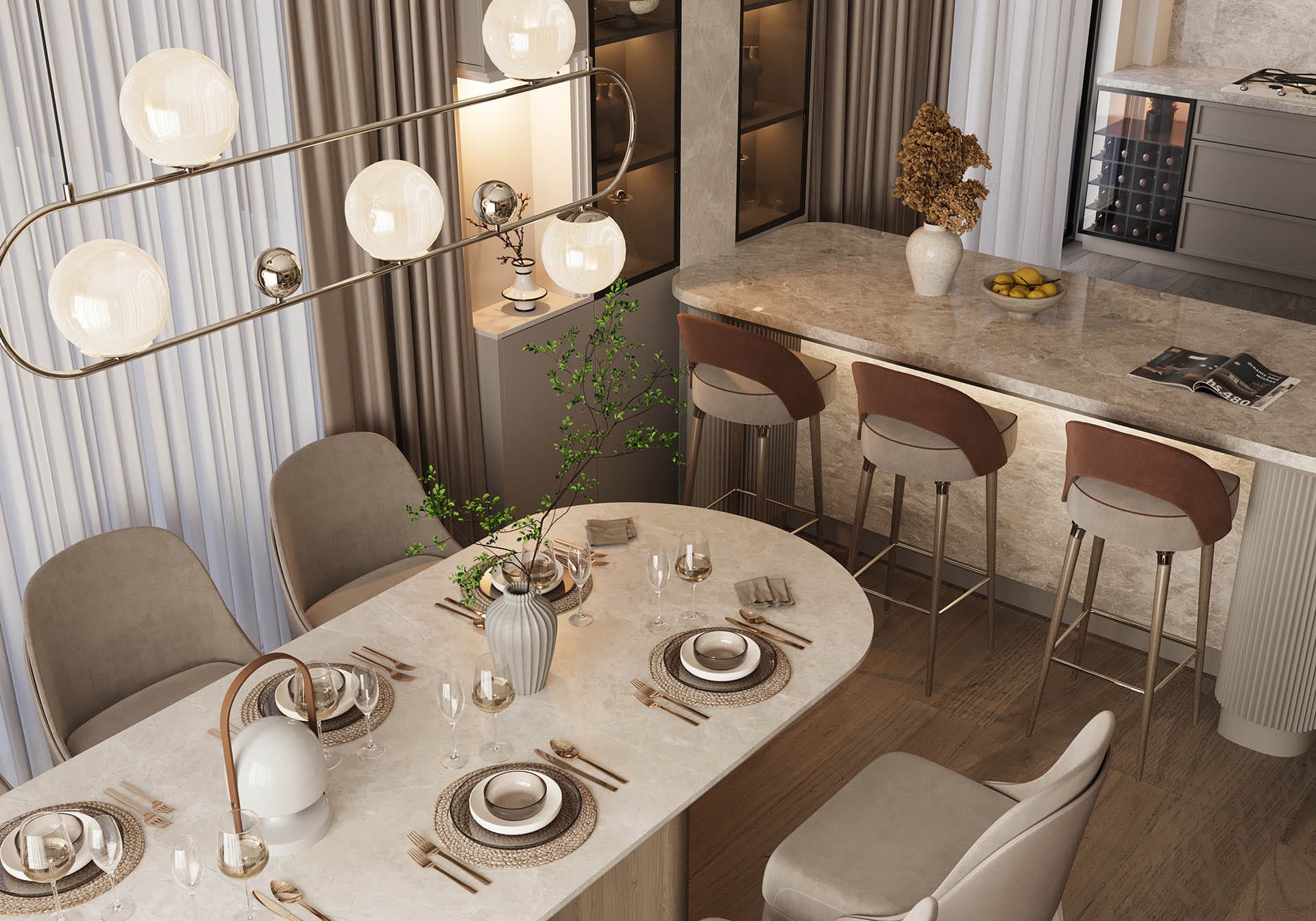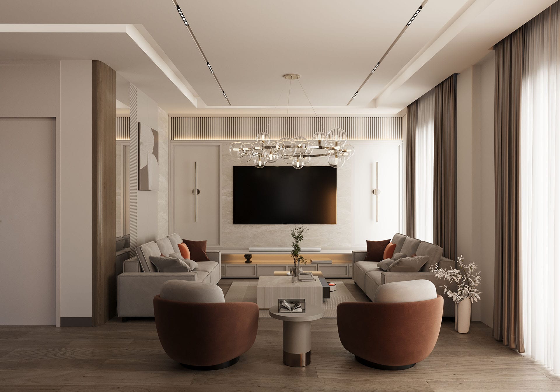 Edirne’de konumlanan bu villa projesinin modern çizgilerle zamansız bir şıklığı bir araya getiren bütüncül bir iç mekân anlayışıyla tasarlandığı görülmektedir. Projede açık renk paleti, doğal dokular ve yumuşak geçişler ön planda tutularak ferah ve dengeli yaşam alanları oluşturulmuştur. Salon ve yemek alanında kullanılan geniş cam yüzeyler, mekâna maksimum gün ışığı alırken, perdeler ve aydınlatma detaylarıyla sıcak ve davetkâr bir atmosfer desteklenmiştir. Yemek masası ve mutfak adası arasındaki ilişki, sosyal kullanımı güçlendiren akıcı bir planlama sunmaktadır.