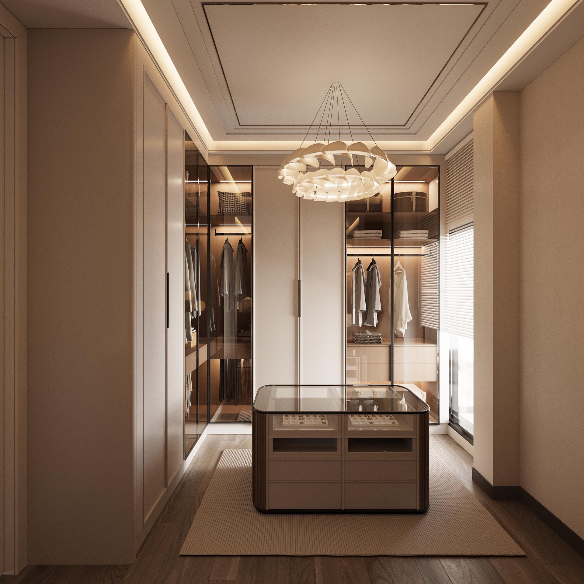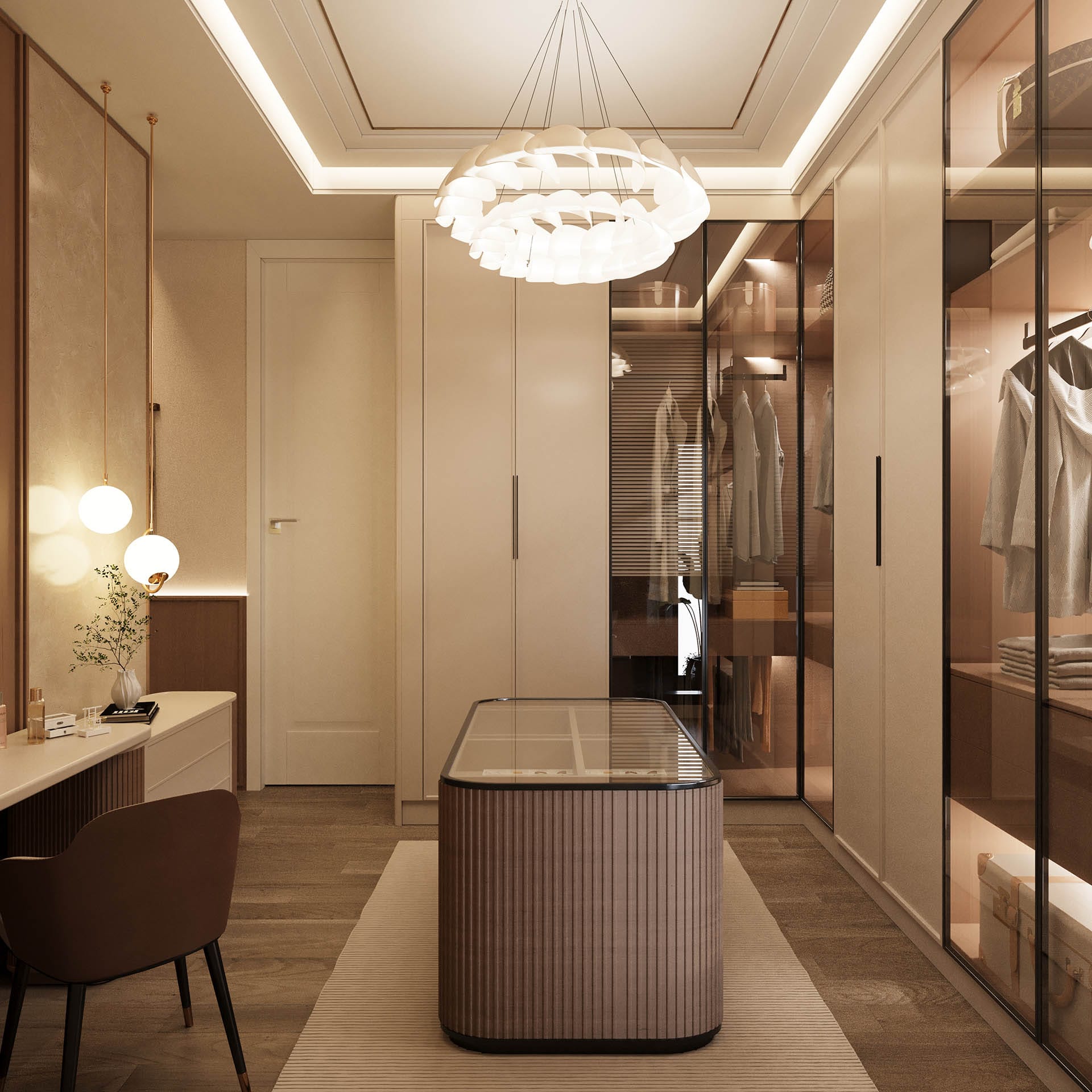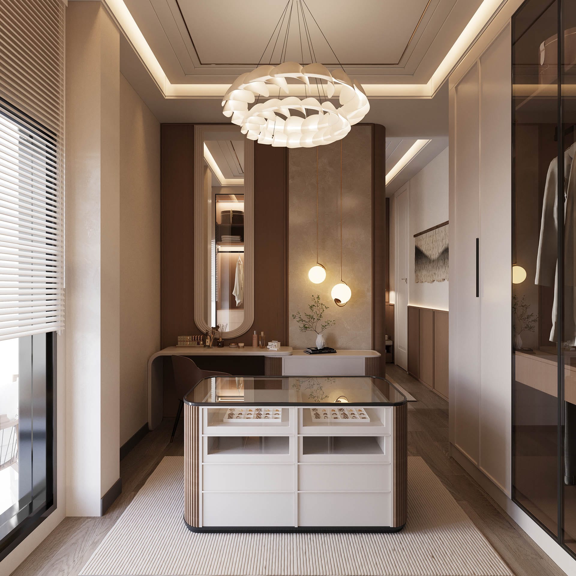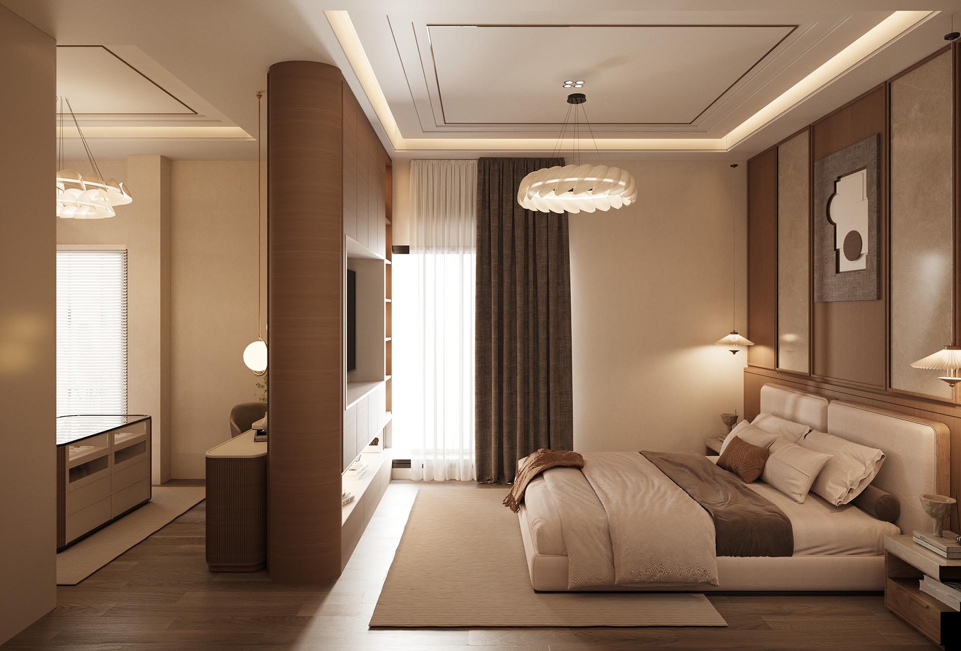Ebeveyn yatak odasında doğal ahşap tonları, dokulu duvar panelleri ve sade mobilya seçimleri ile sakinleştirici bir etki hedeflenmiştir. Giyinme ve makyaj alanında kullanılan mermer görünümlü yüzeyler, cam vitrinler ve simetrik yerleşim, mekâna sofistike bir görünüm kazandırmaktadır. Genel olarak projede; malzeme kalitesi, detaylı işçilik ve modern tasarım dili bir araya getirilerek, hem estetik hem de konforlu bir villa yaşamı kurgulanmıştır.