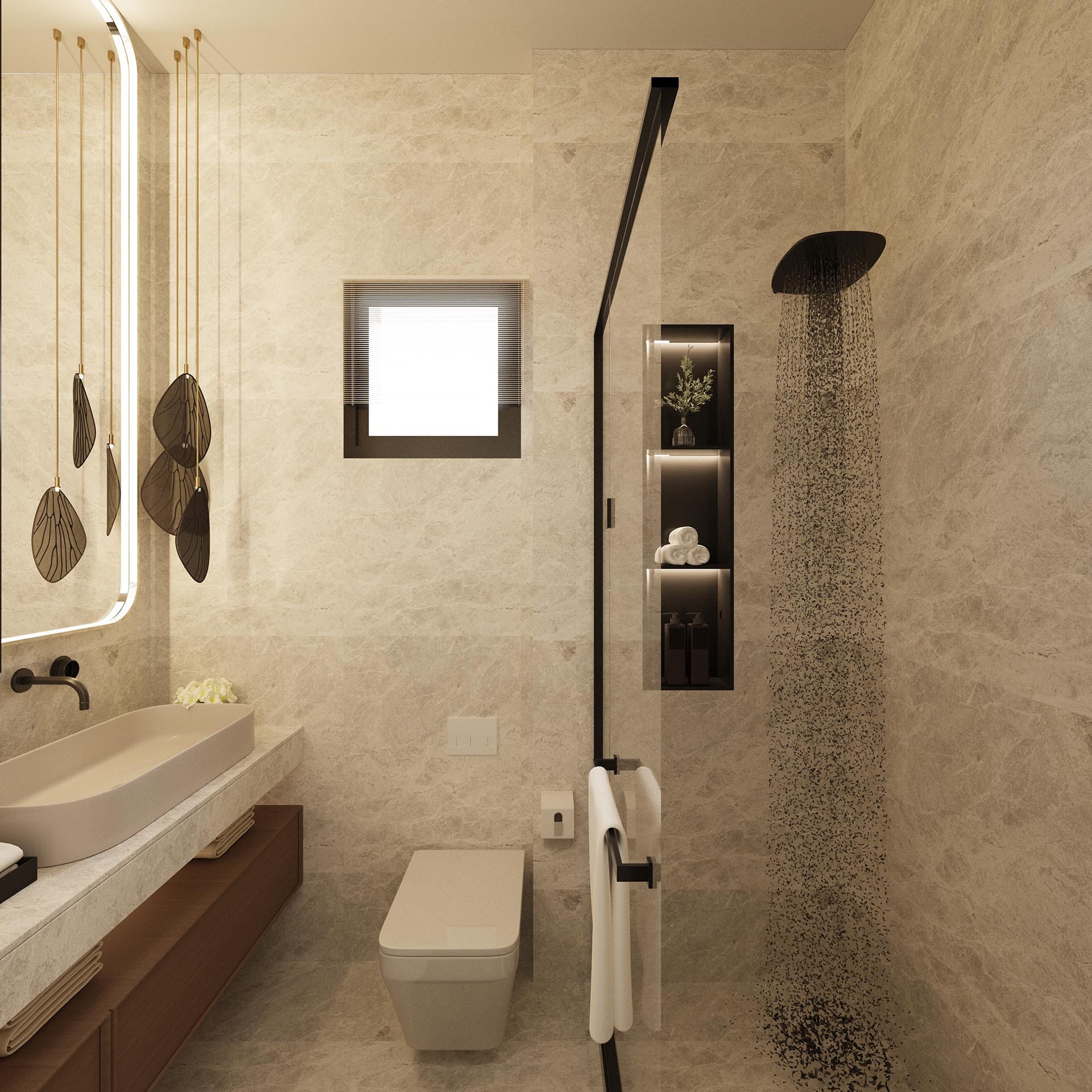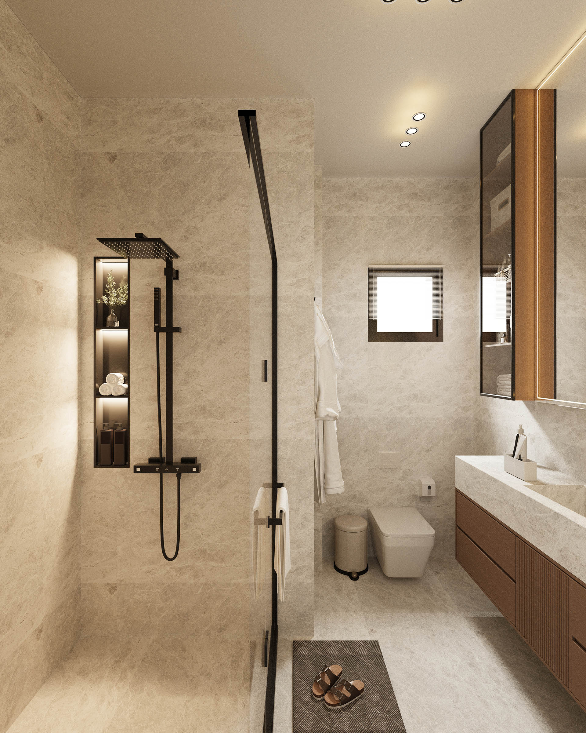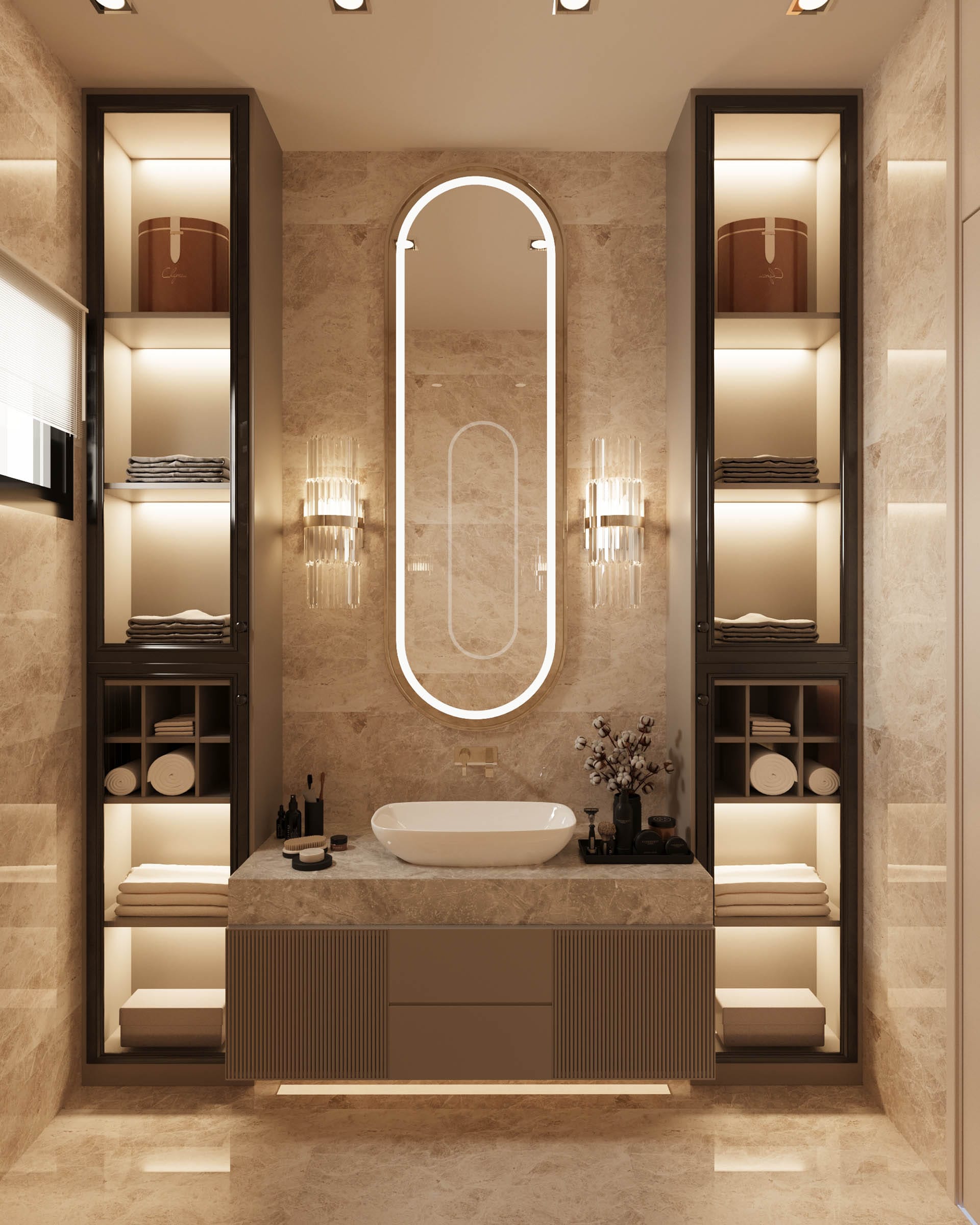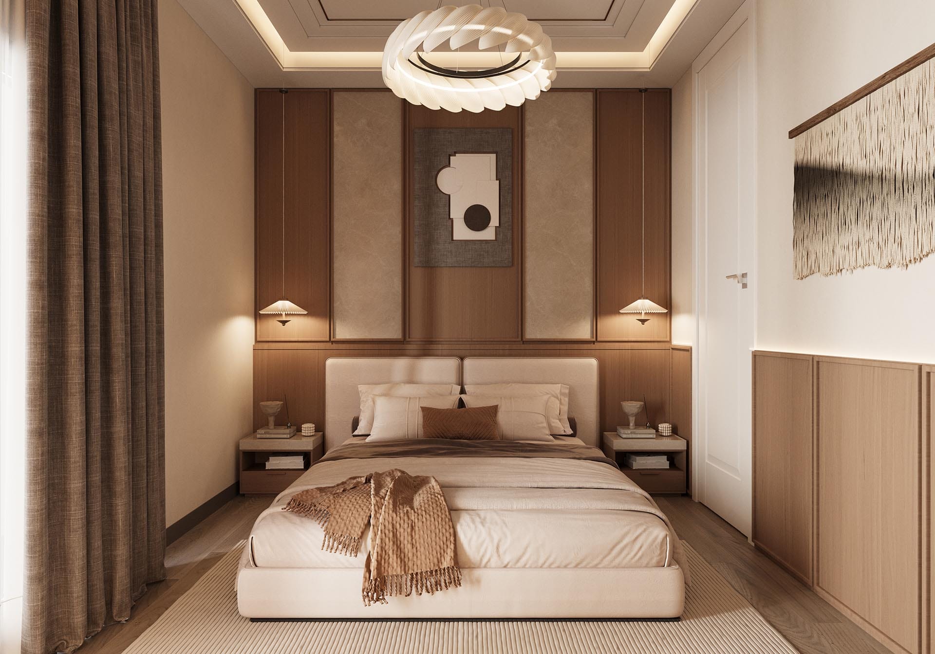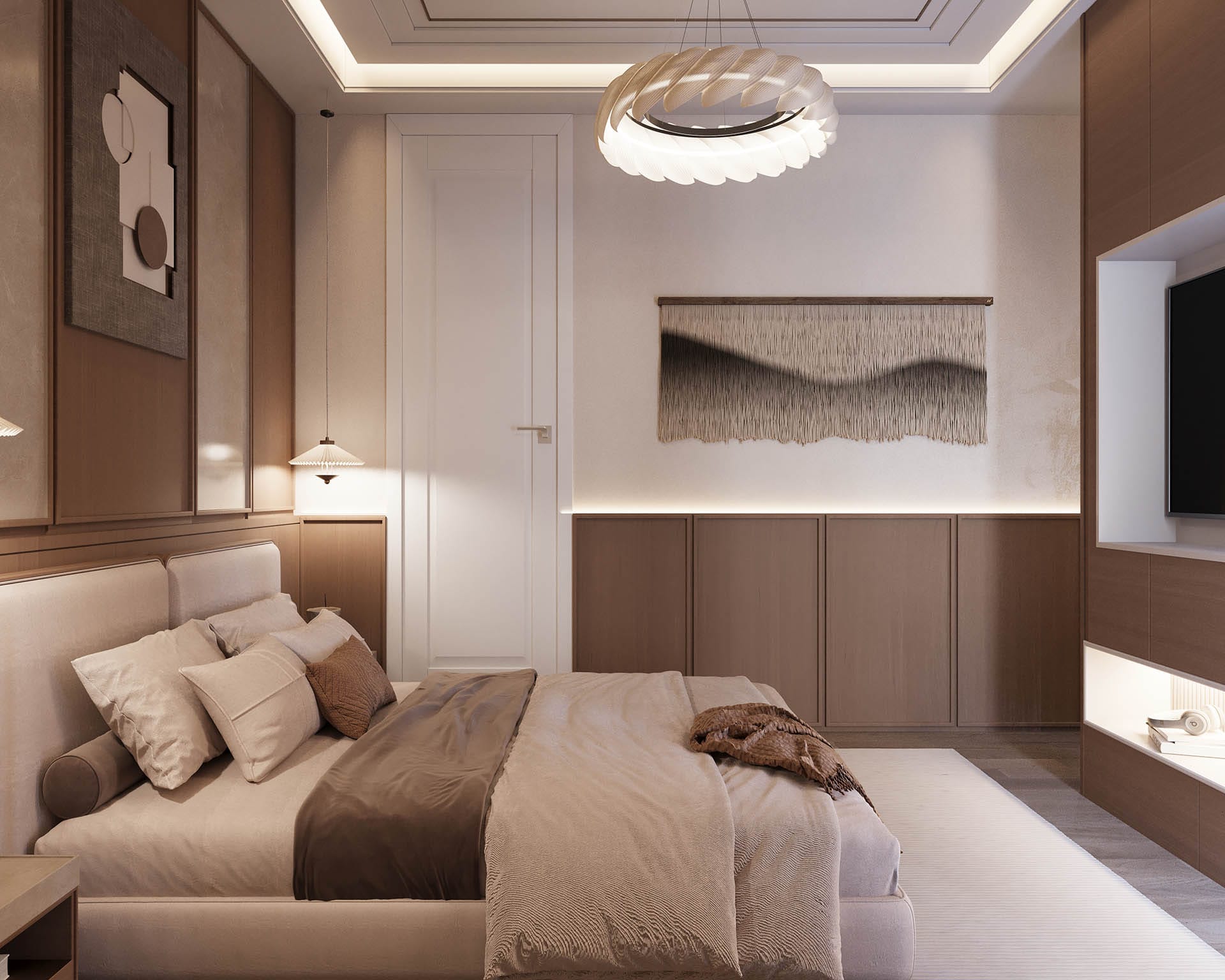 Ebeveyn yatak odasında doğal ahşap tonları, dokulu duvar panelleri ve sade mobilya seçimleri ile sakinleştirici bir etki hedeflenmiştir. Giyinme ve makyaj alanında kullanılan mermer görünümlü yüzeyler, cam vitrinler ve simetrik yerleşim, mekâna sofistike bir görünüm kazandırmaktadır. Genel olarak projede; malzeme kalitesi, detaylı işçilik ve modern tasarım dili bir araya getirilerek, hem estetik hem de konforlu bir villa yaşamı kurgulanmıştır.