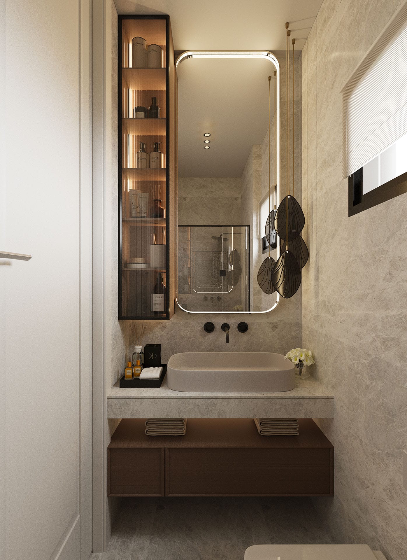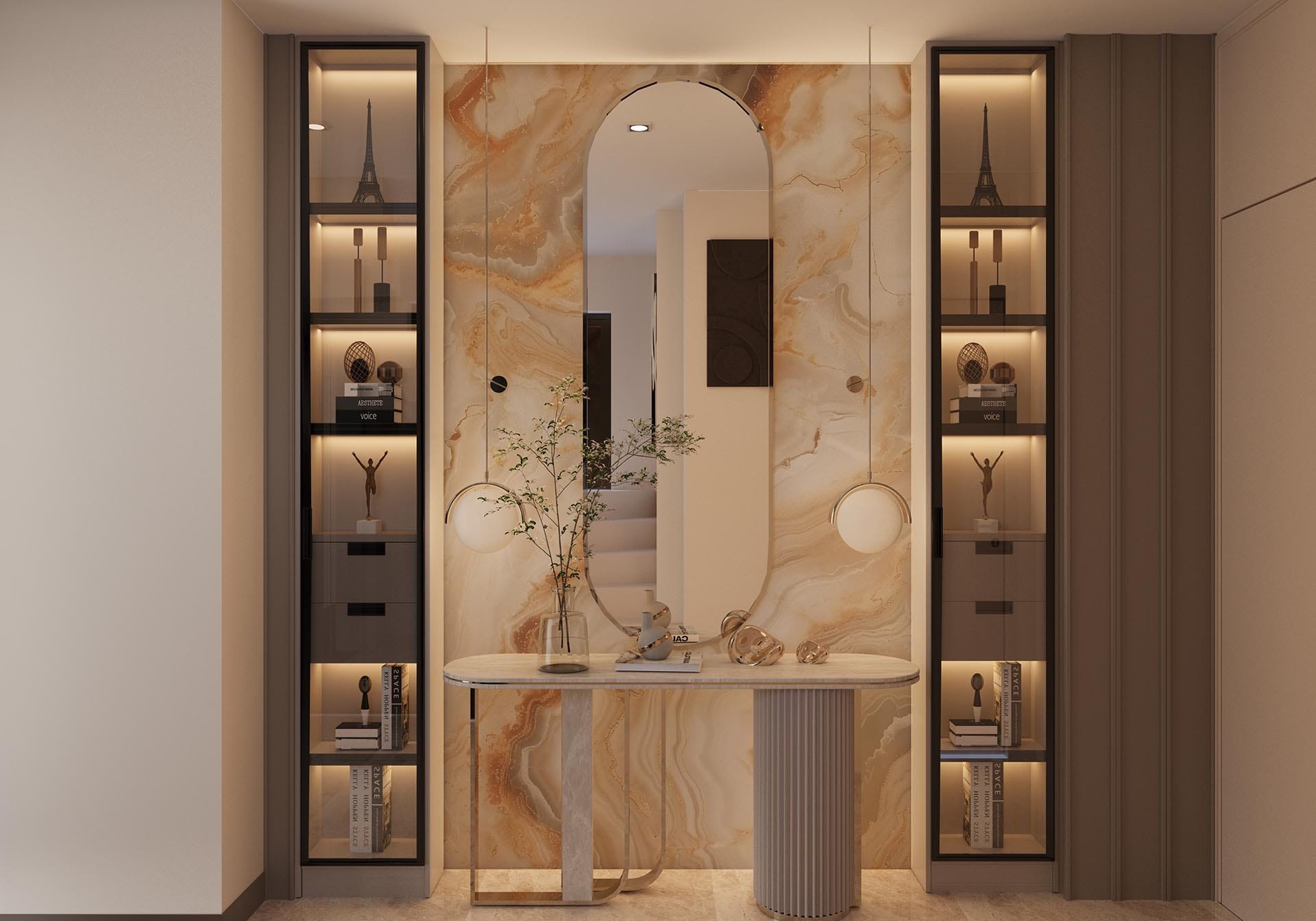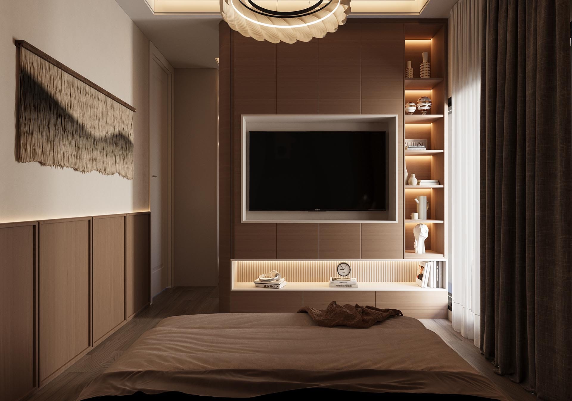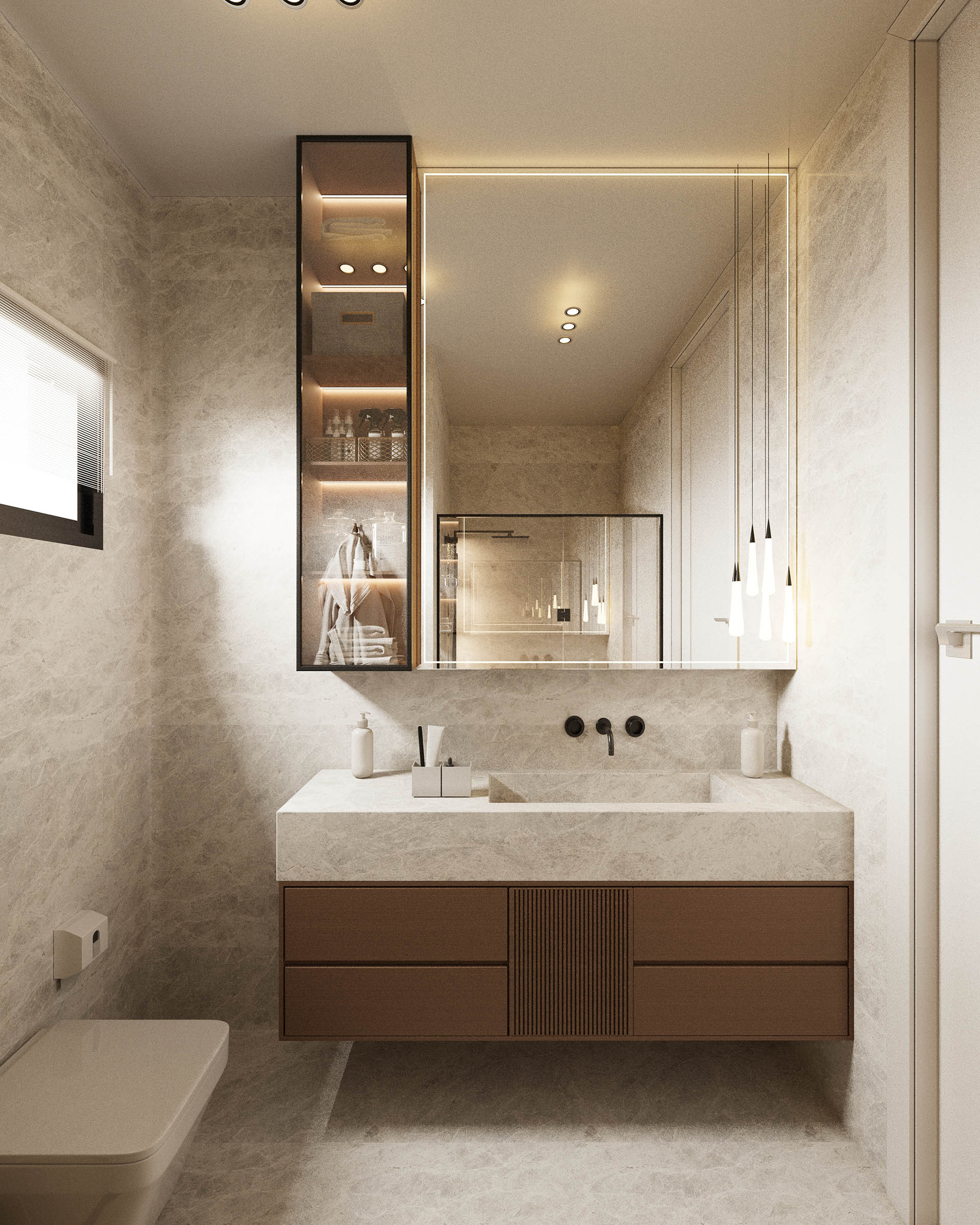 Ebeveyn yatak odasında doğal ahşap tonları, dokulu duvar panelleri ve sade mobilya seçimleri ile sakinleştirici bir etki hedeflenmiştir. Giyinme ve makyaj alanında kullanılan mermer görünümlü yüzeyler, cam vitrinler ve simetrik yerleşim, mekâna sofistike bir görünüm kazandırmaktadır. Genel olarak projede; malzeme kalitesi, detaylı işçilik ve modern tasarım dili bir araya getirilerek, hem estetik hem de konforlu bir villa yaşamı kurgulanmıştır.