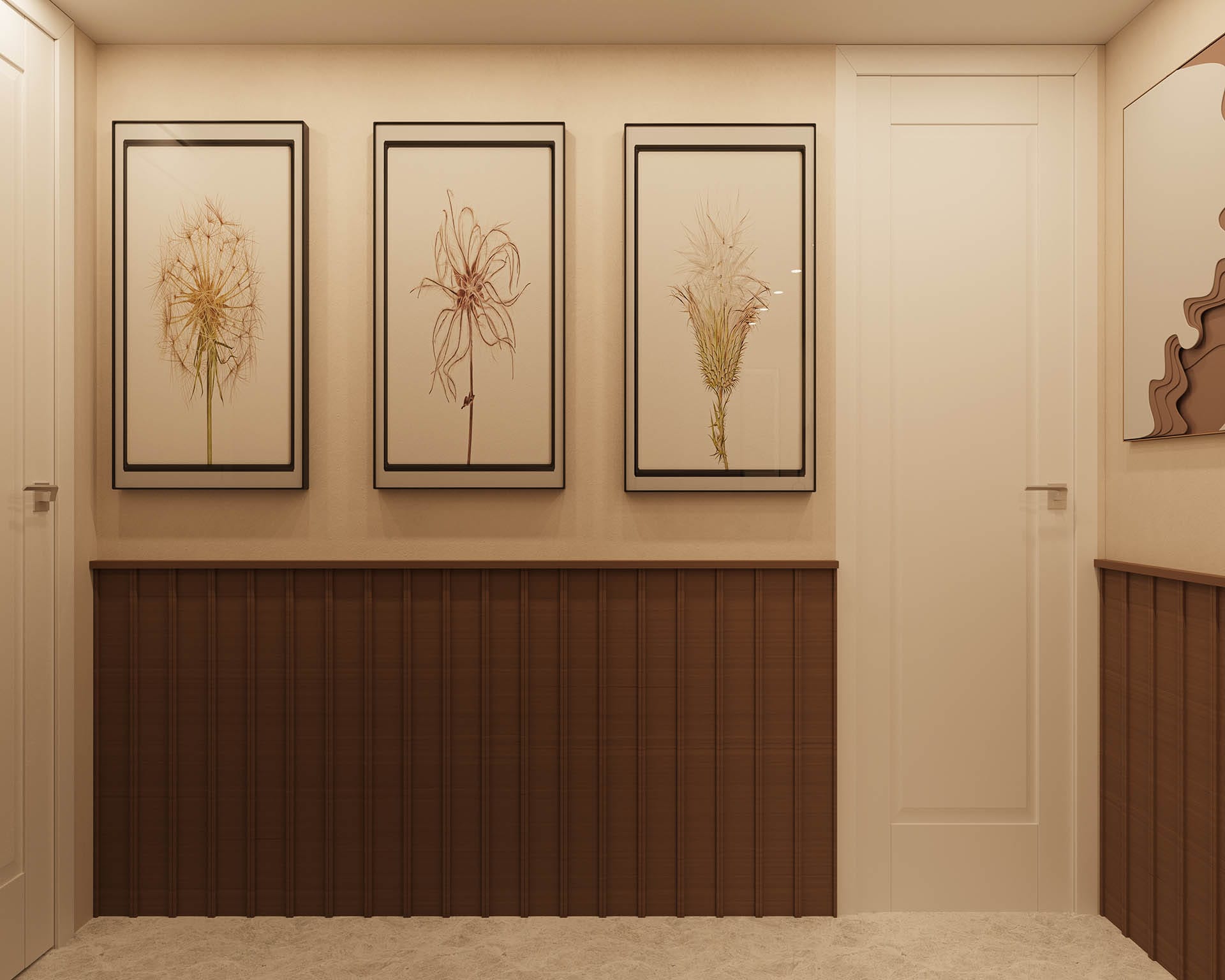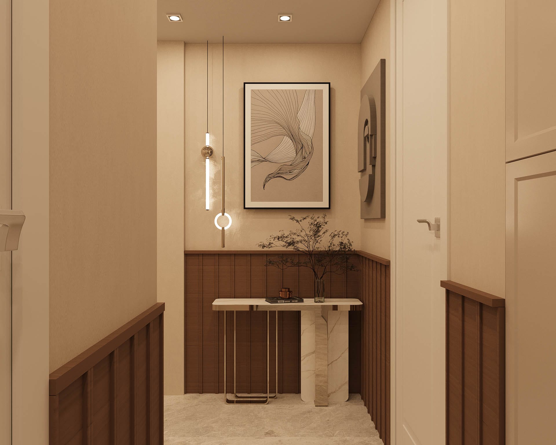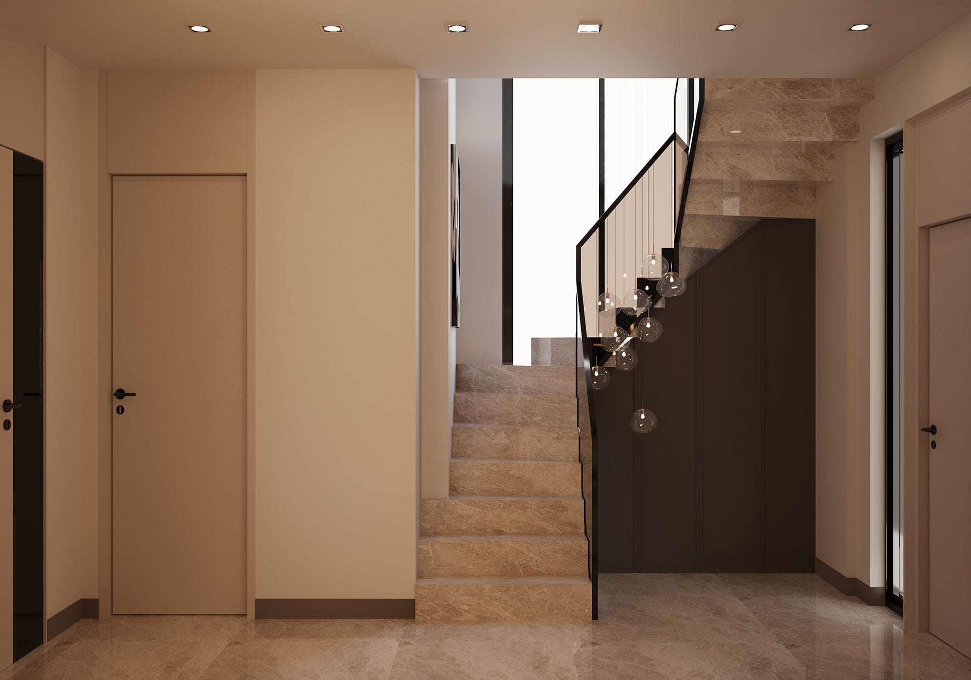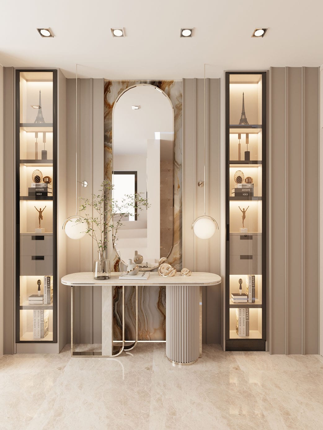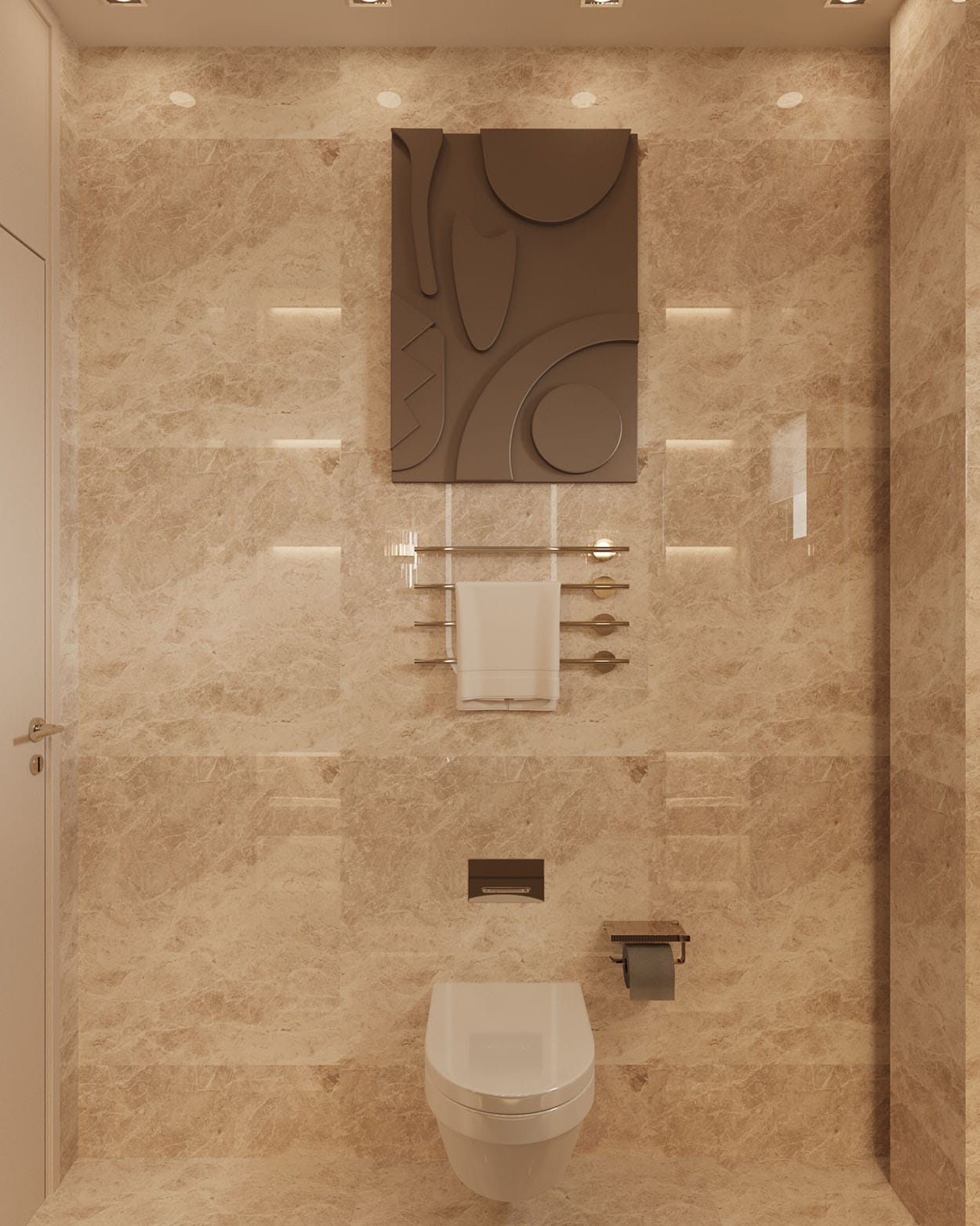 Ebeveyn yatak odasında doğal ahşap tonları, dokulu duvar panelleri ve sade mobilya seçimleri ile sakinleştirici bir etki hedeflenmiştir. Giyinme ve makyaj alanında kullanılan mermer görünümlü yüzeyler, cam vitrinler ve simetrik yerleşim, mekâna sofistike bir görünüm kazandırmaktadır. Genel olarak projede; malzeme kalitesi, detaylı işçilik ve modern tasarım dili bir araya getirilerek, hem estetik hem de konforlu bir villa yaşamı kurgulanmıştır.