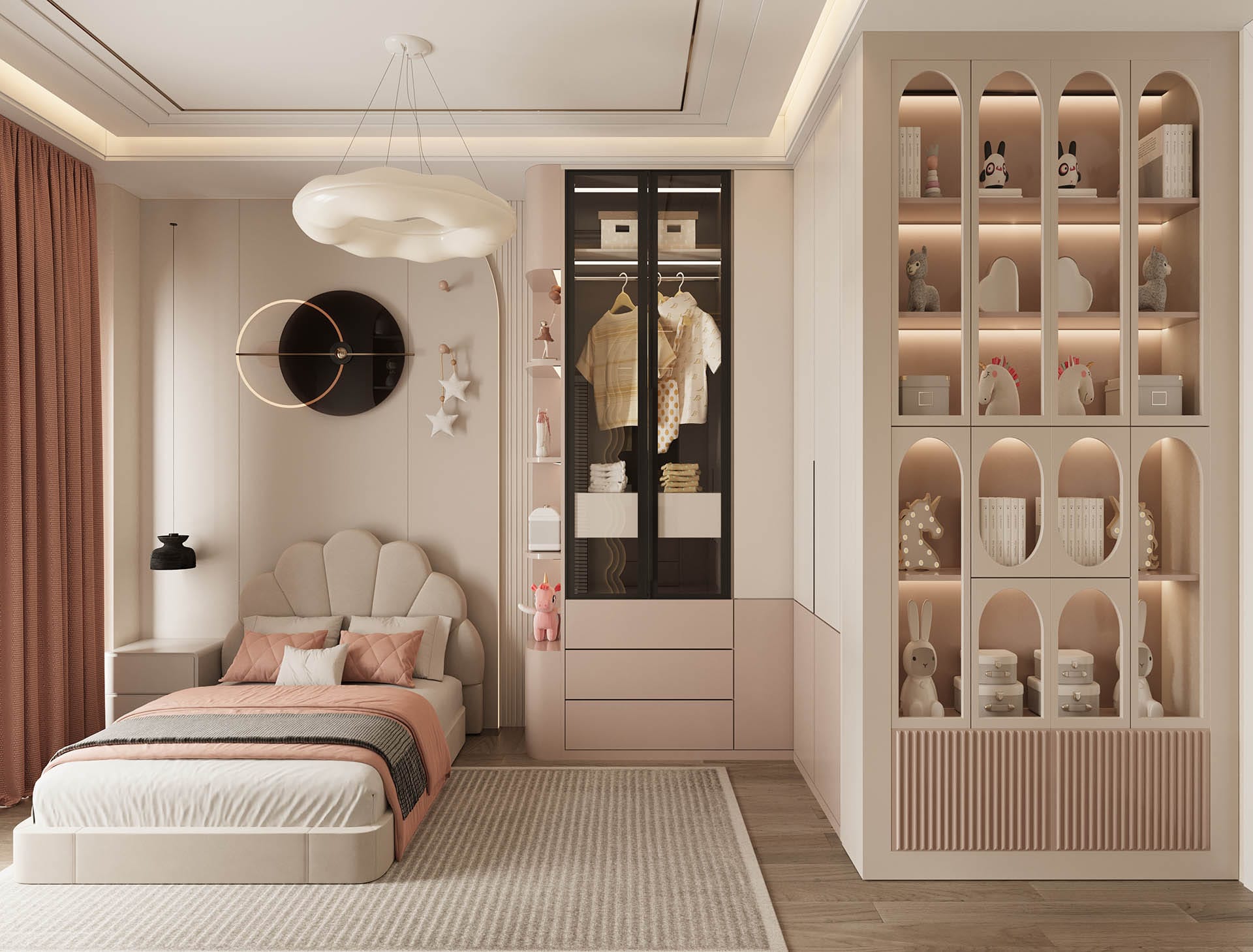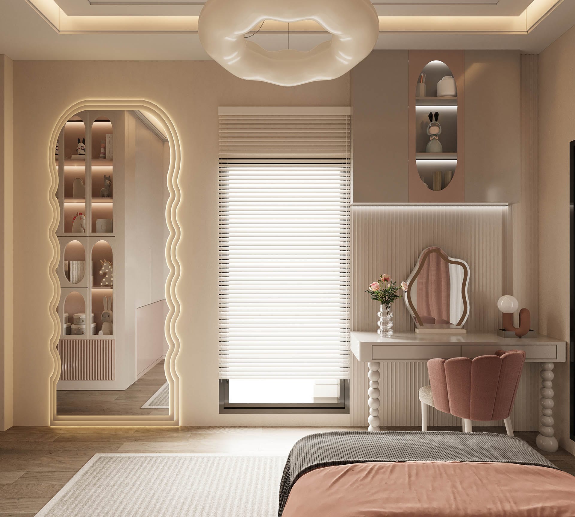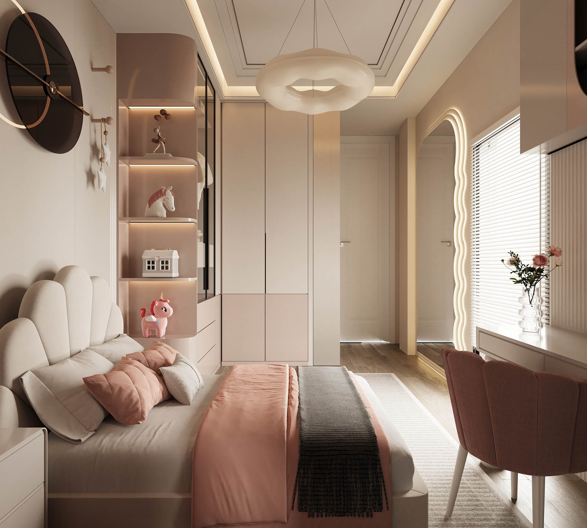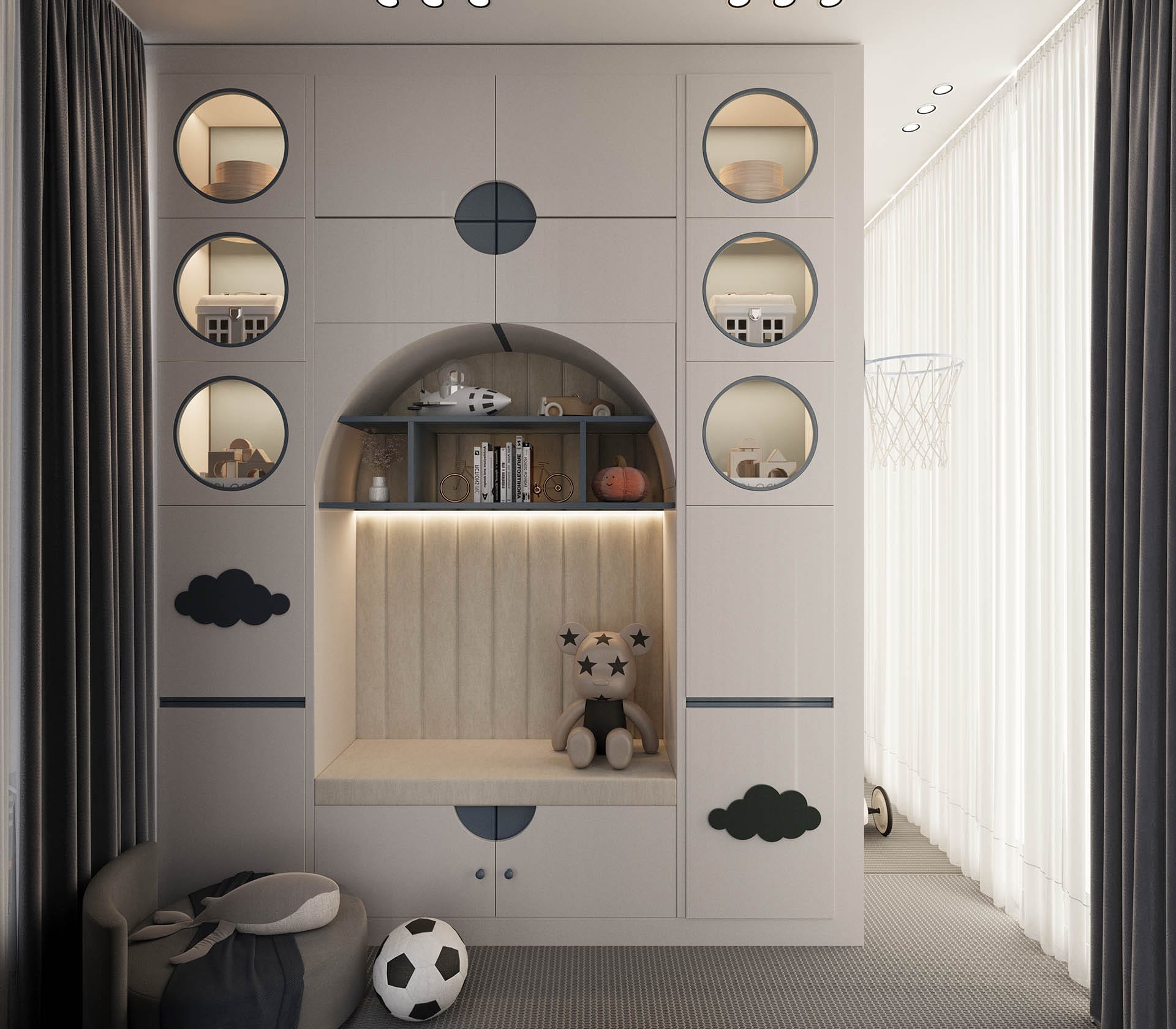 Çocuk ve genç odalarında ise yaş gruplarına uygun, fonksiyonel ve estetik çözümler dikkat çekmektedir. Özel tasarlanan dolap sistemleri, niş raflar ve vitrin detayları hem depolama ihtiyacını karşılamakta hem de mekânlara karakter kazandırmaktadır. Yumuşak renk geçişleri, dekoratif aydınlatmalar ve eğlenceli duvar detayları, odalara sıcak ve güvenli bir atmosfer katmaktadır.