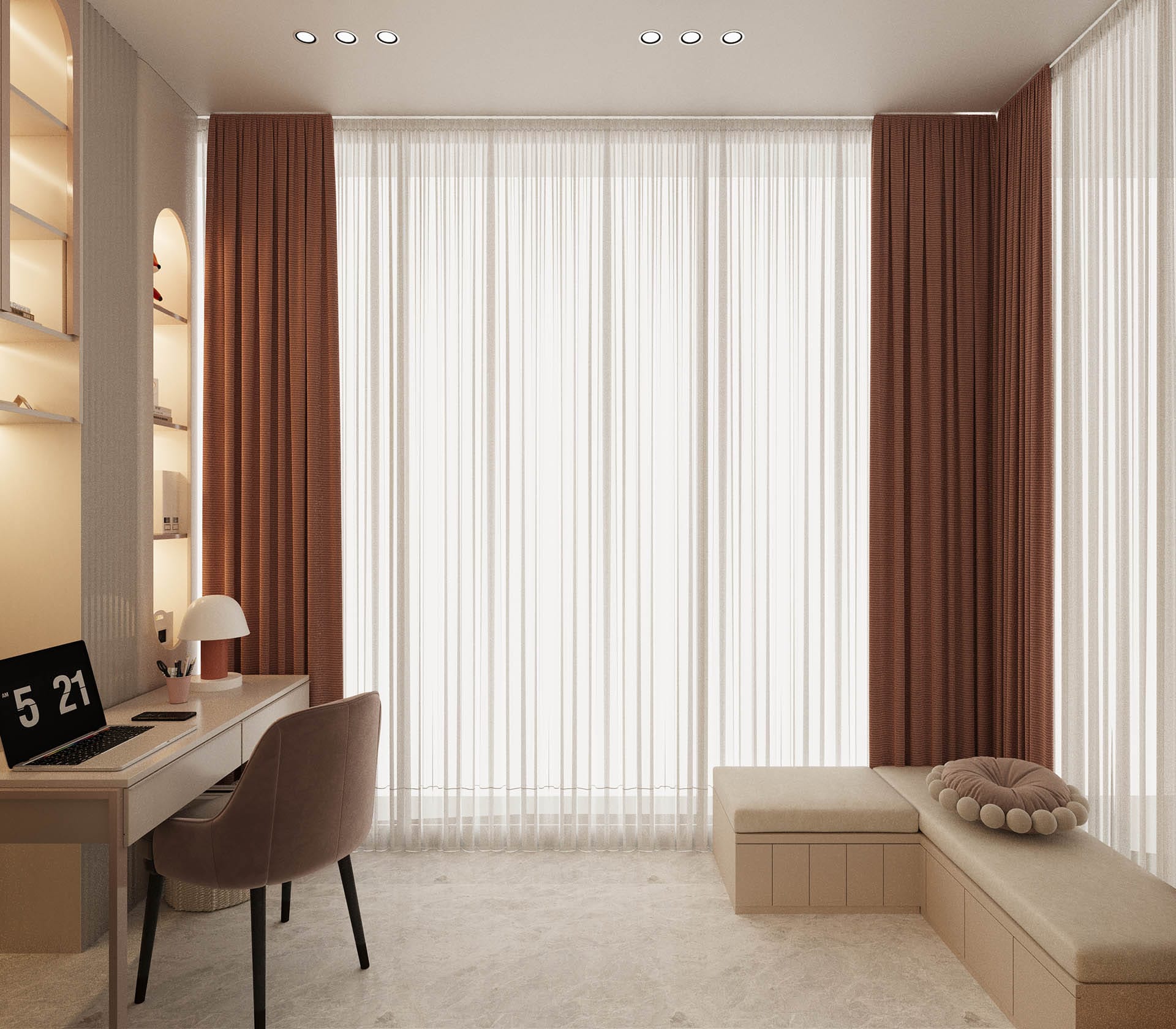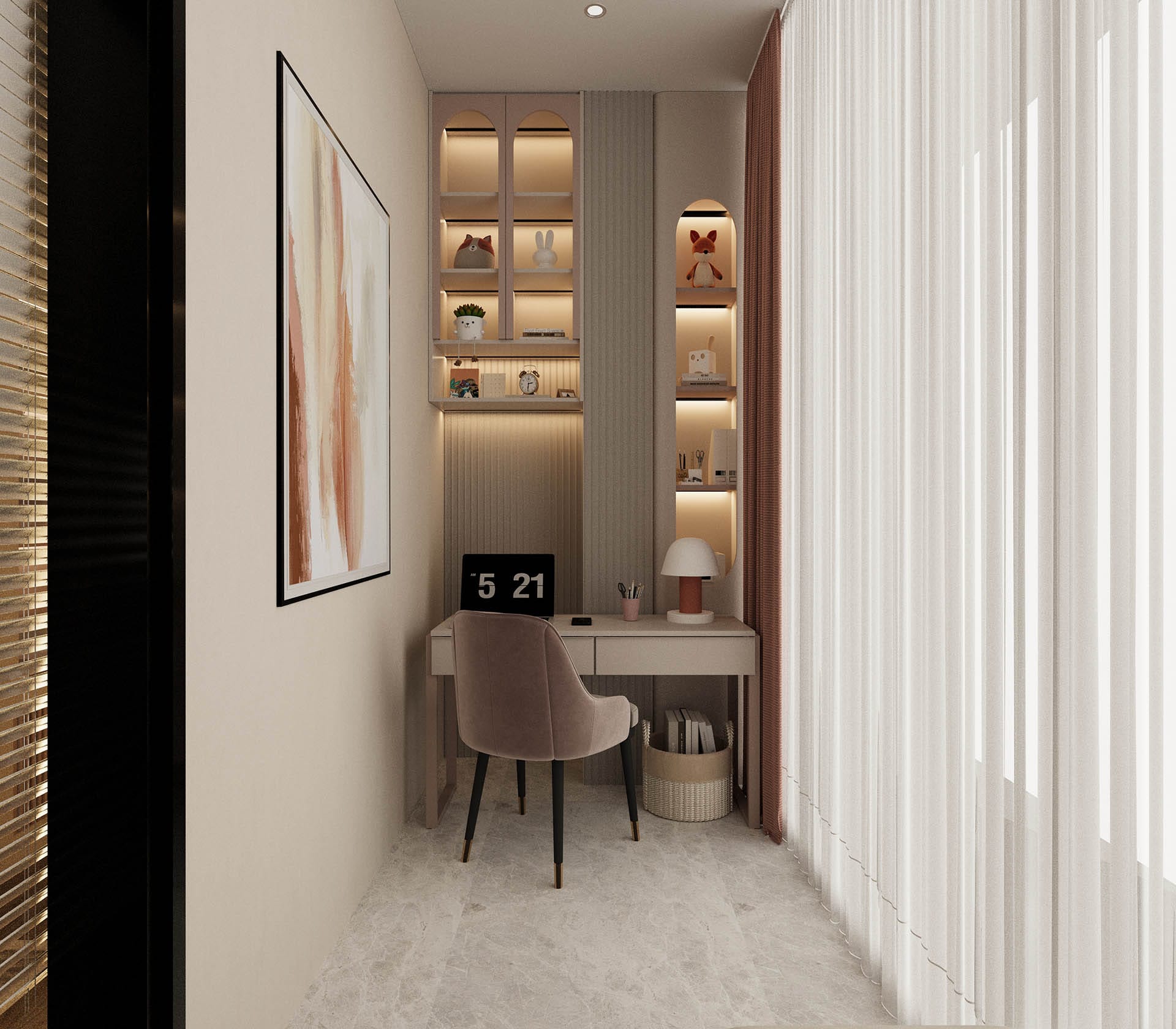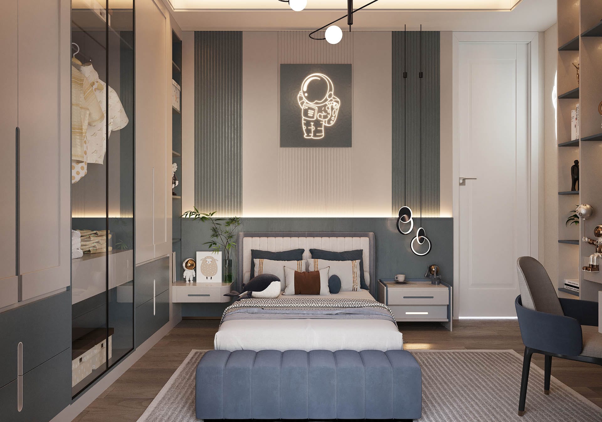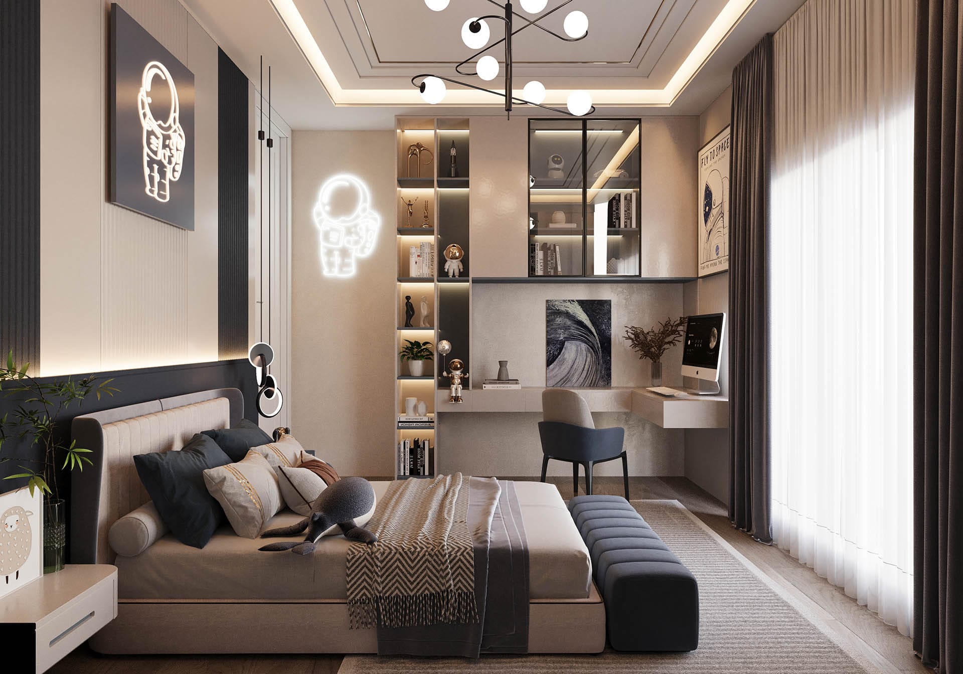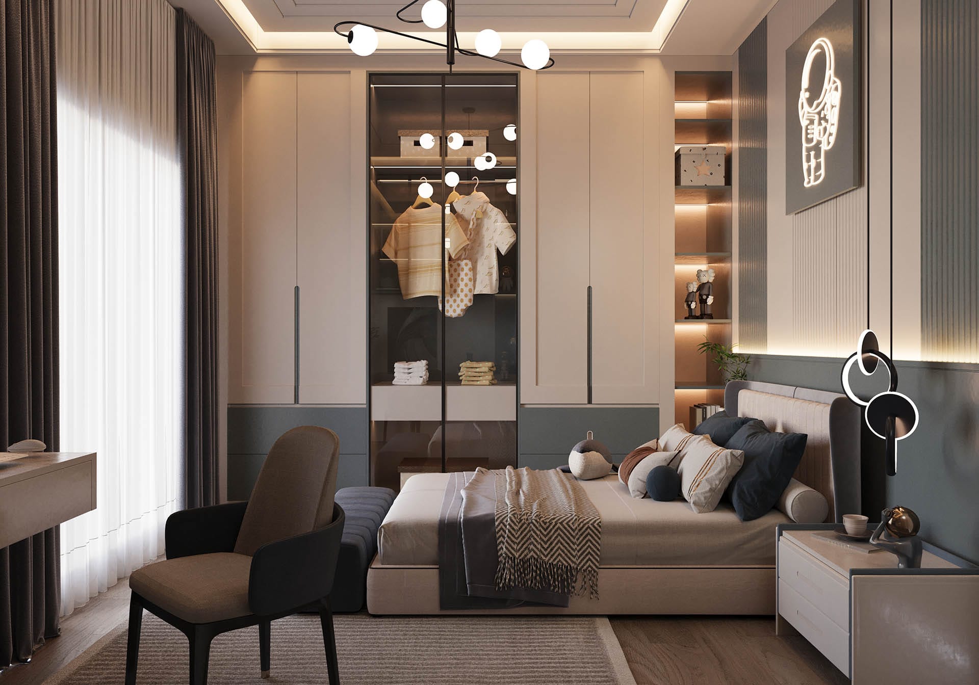 Çocuk ve genç odalarında ise yaş gruplarına uygun, fonksiyonel ve estetik çözümler dikkat çekmektedir. Özel tasarlanan dolap sistemleri, niş raflar ve vitrin detayları hem depolama ihtiyacını karşılamakta hem de mekânlara karakter kazandırmaktadır. Yumuşak renk geçişleri, dekoratif aydınlatmalar ve eğlenceli duvar detayları, odalara sıcak ve güvenli bir atmosfer katmaktadır.
