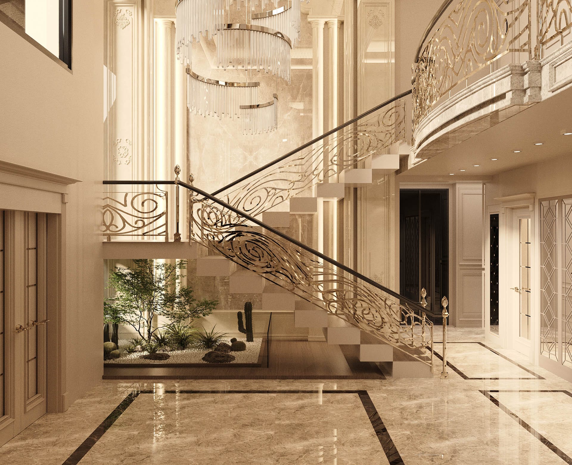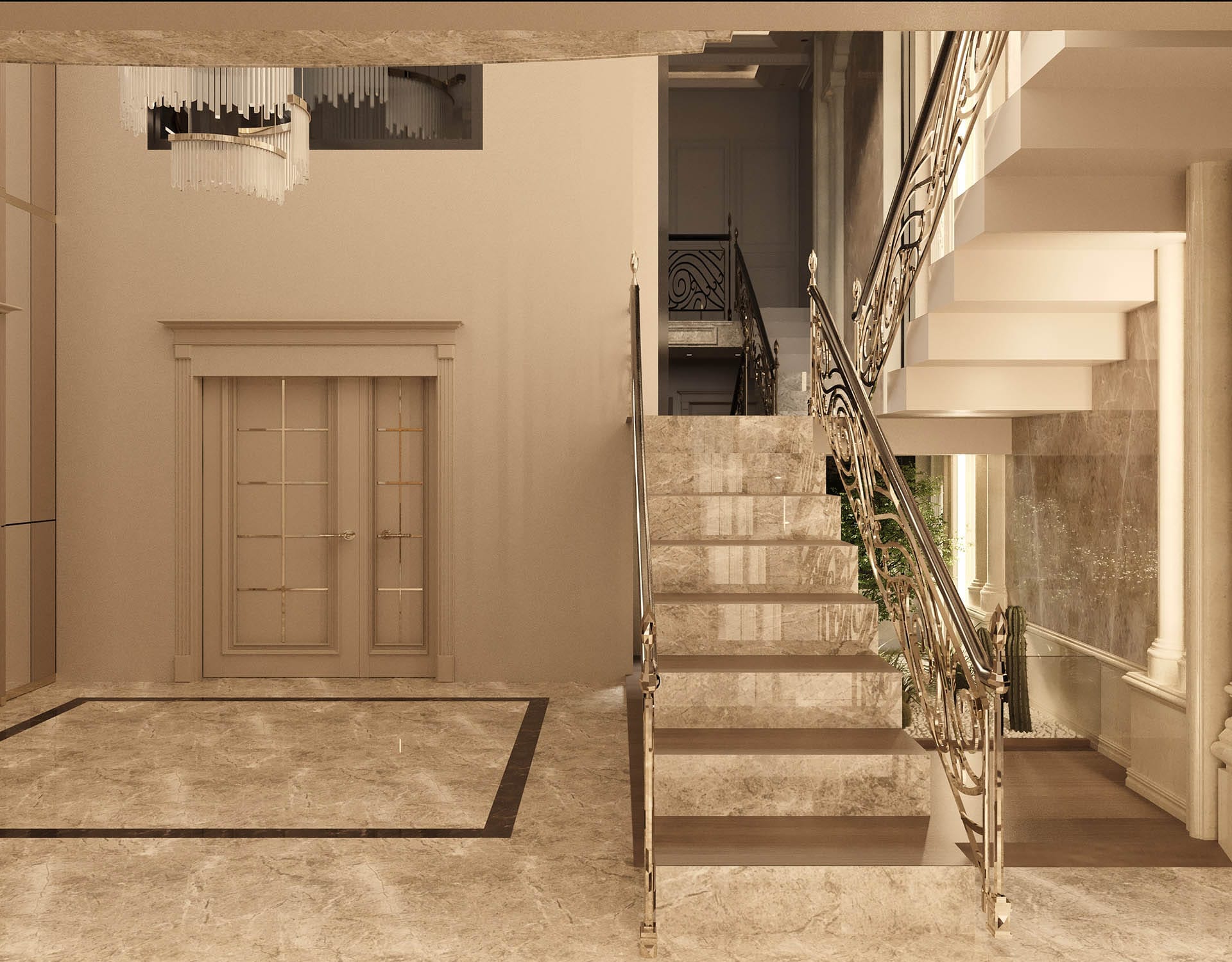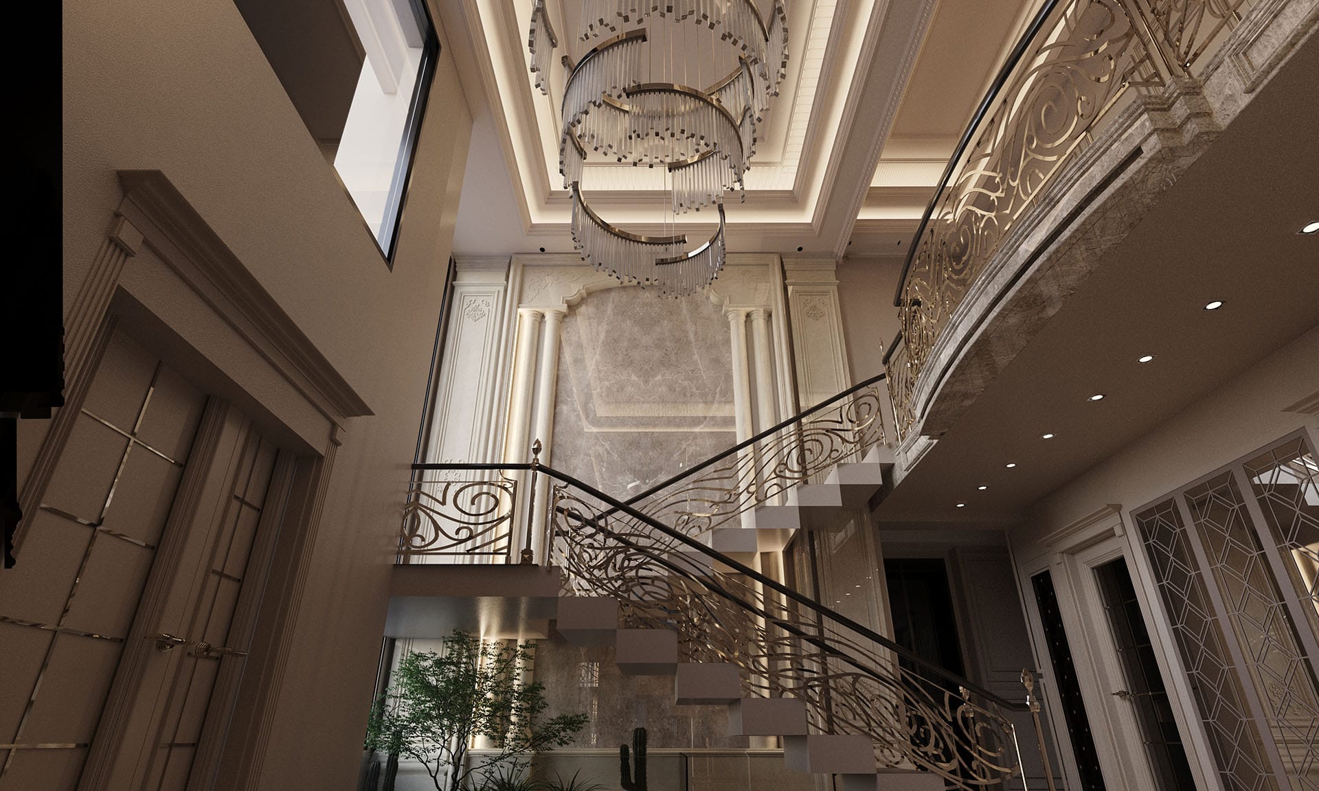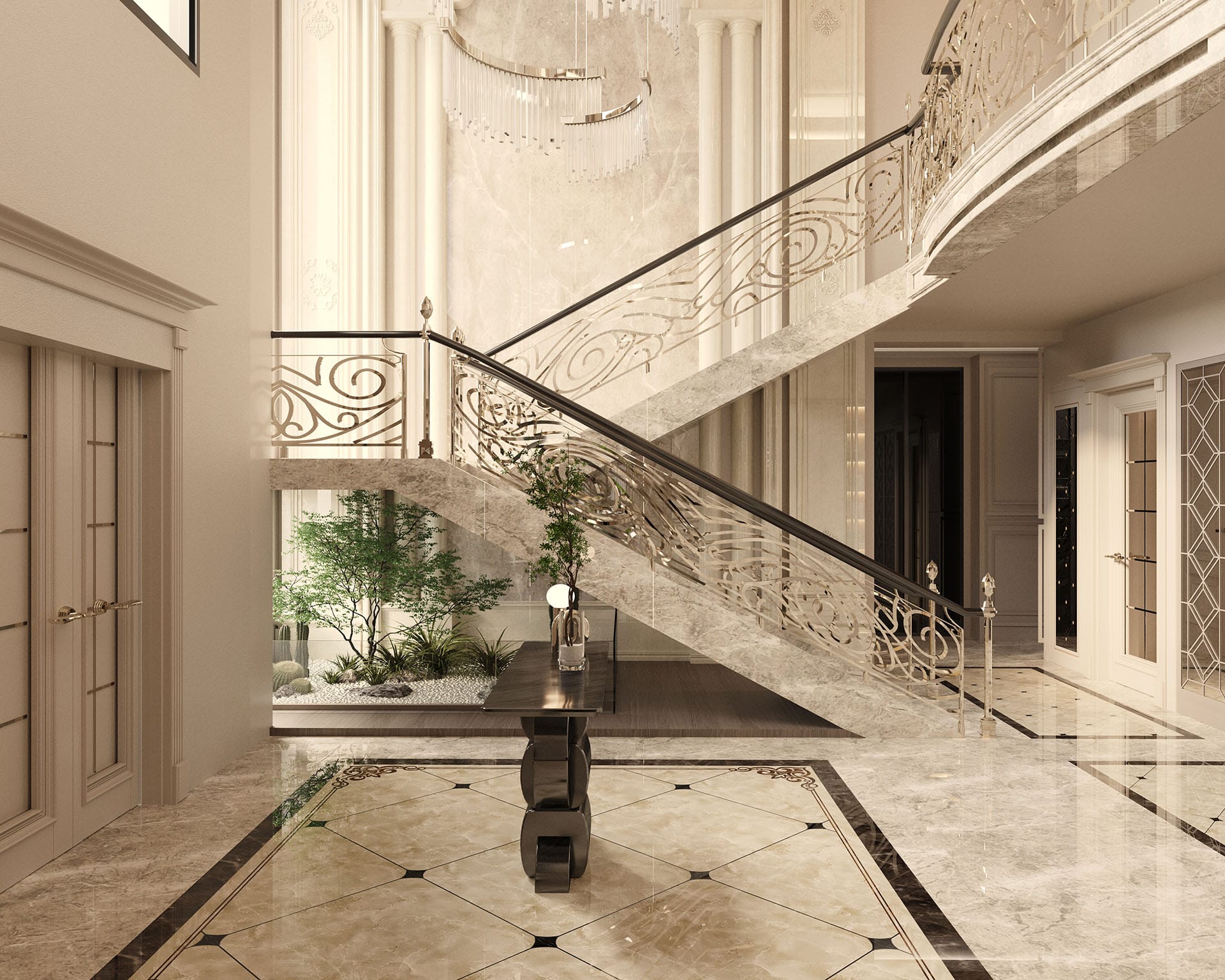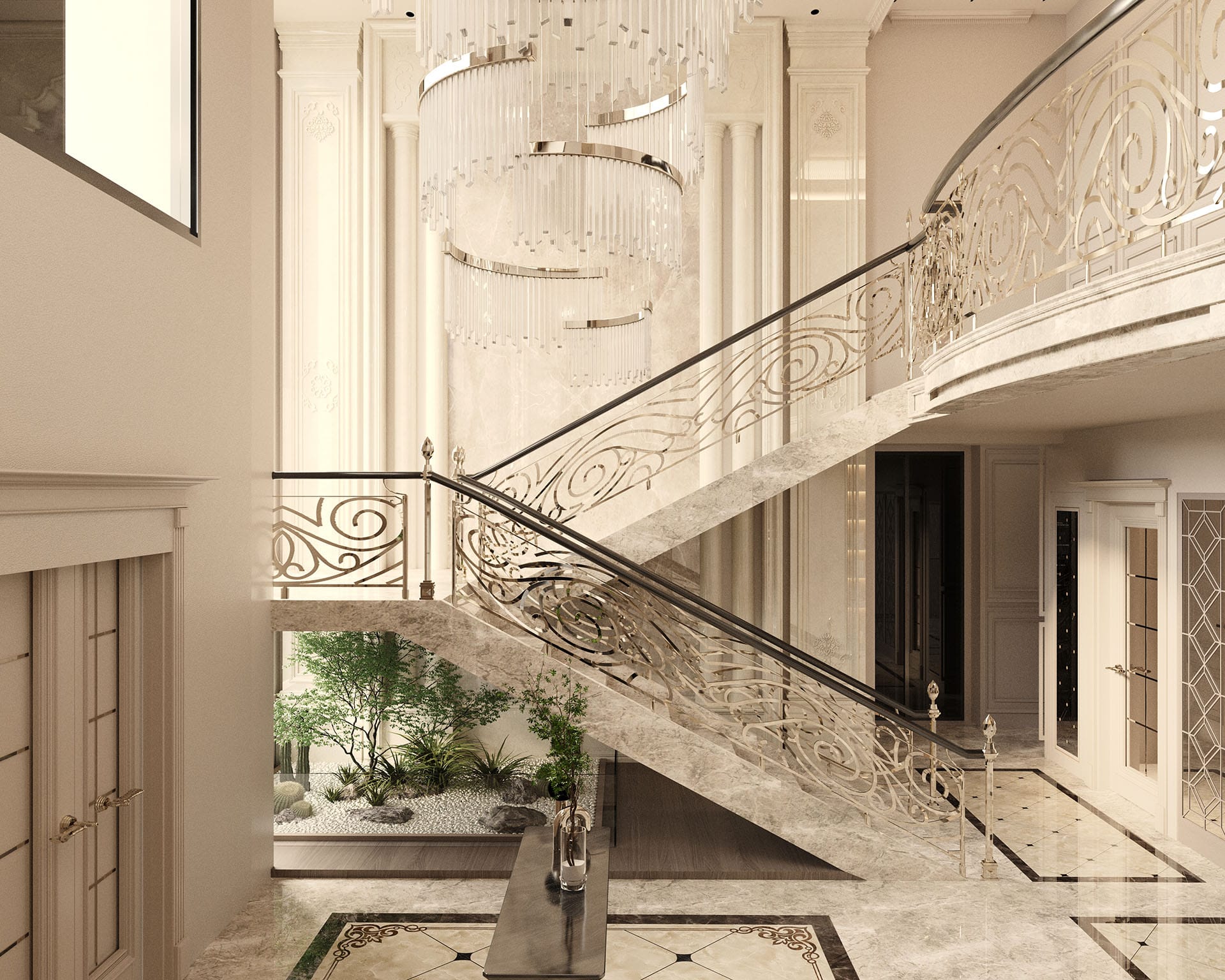 Klasik mimari referanslar modern iç mimarlık anlayışıyla harmanlanarak zamansız ve güçlü bir mekân kurgusu oluşturulmuştur. Villa genelinde hâkim olan açık bej, krem ve sıcak toprak tonları; mekânlara ferahlık, zarafet ve bütüncül bir estetik kazandırmaktadır. Giriş holünde çift hacimli alan etkisi, mermer zemin kaplamaları ve özel tasarım spiral avize ile vurgulanırken, ferforje detaylı merdiven korkulukları projeye sofistike bir karakter katmaktadır. Merdiven altındaki iç bahçe detayı, doğal dokuyu iç mekâna taşıyarak mekânın nefes almasını sağlar.