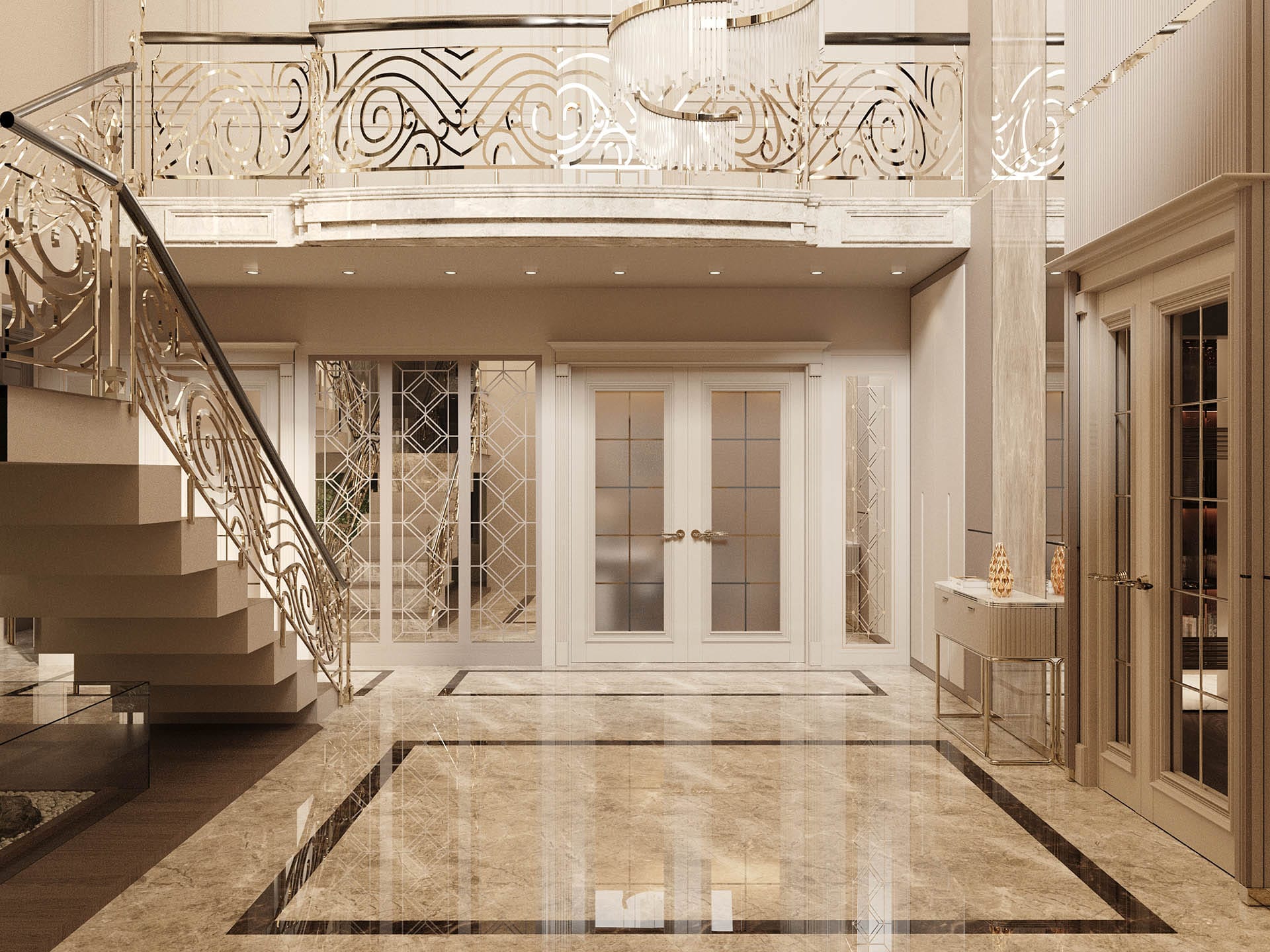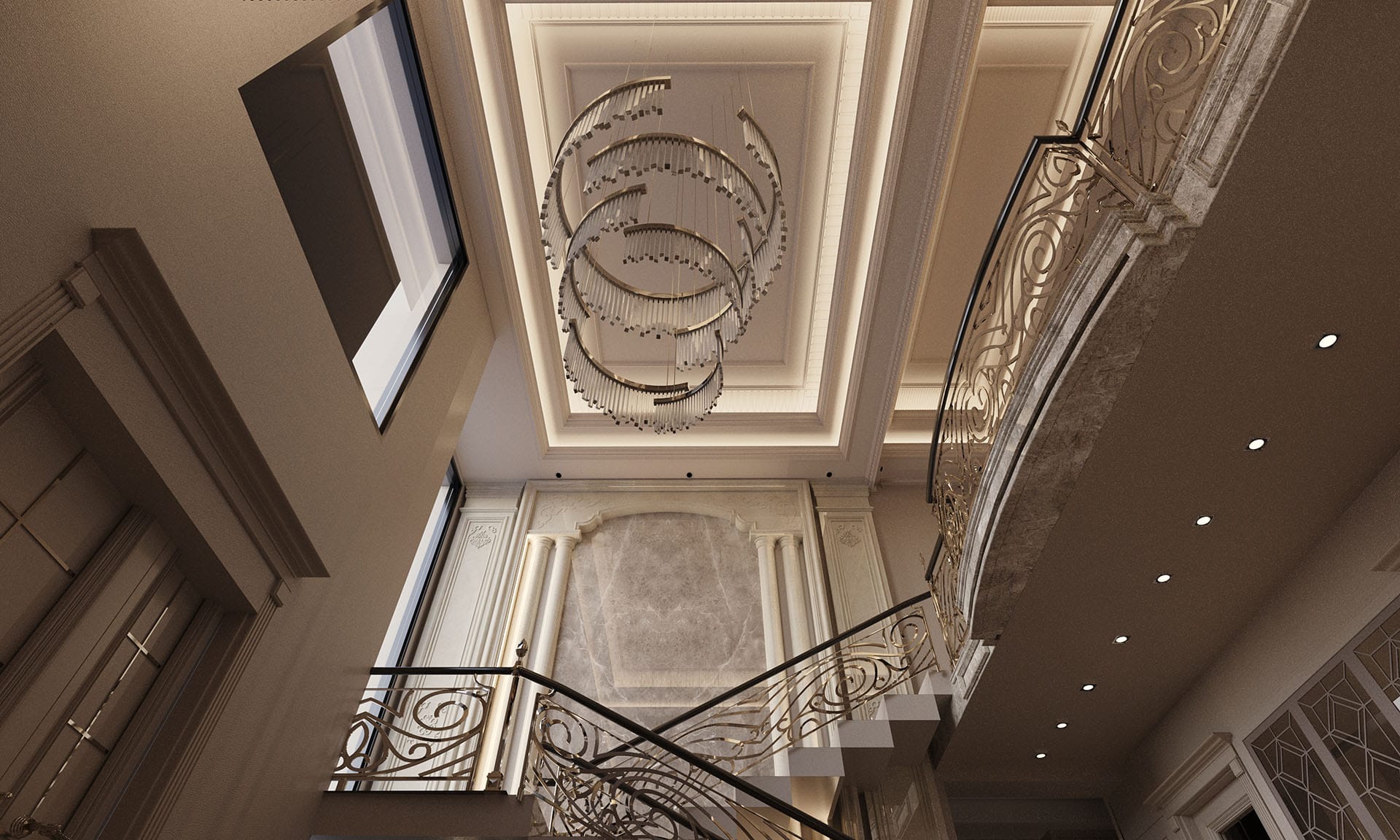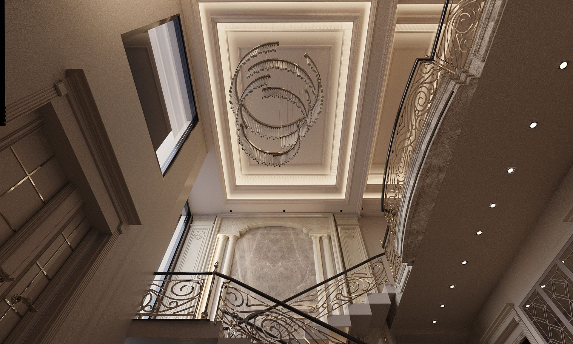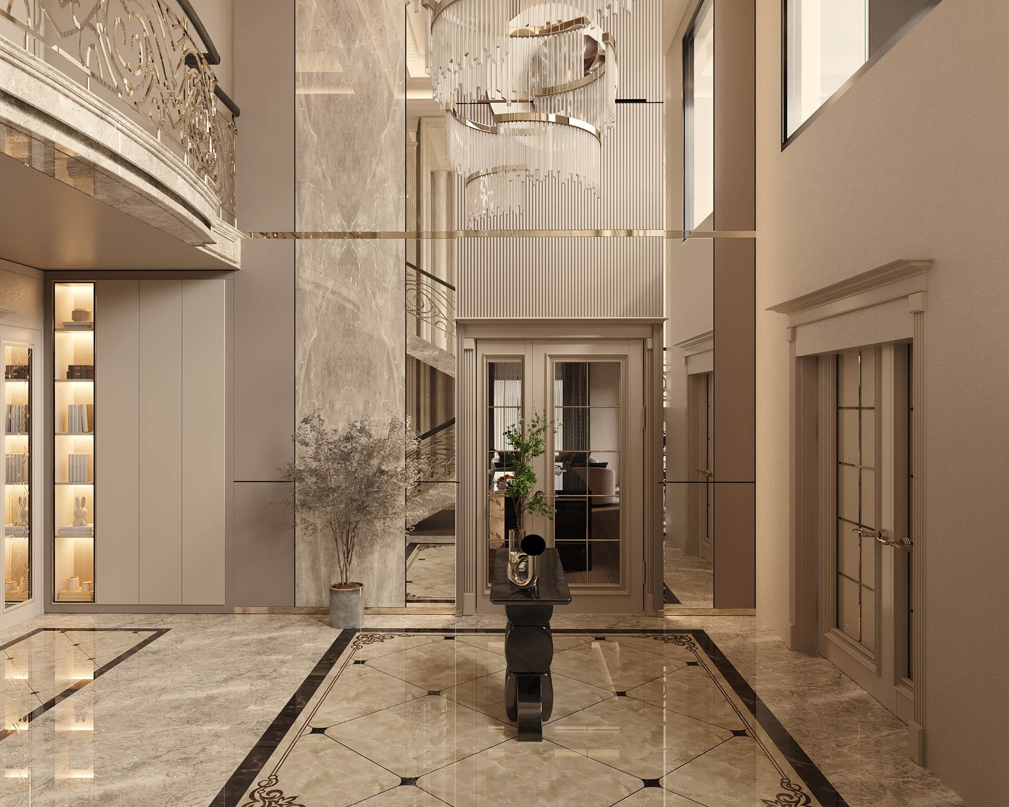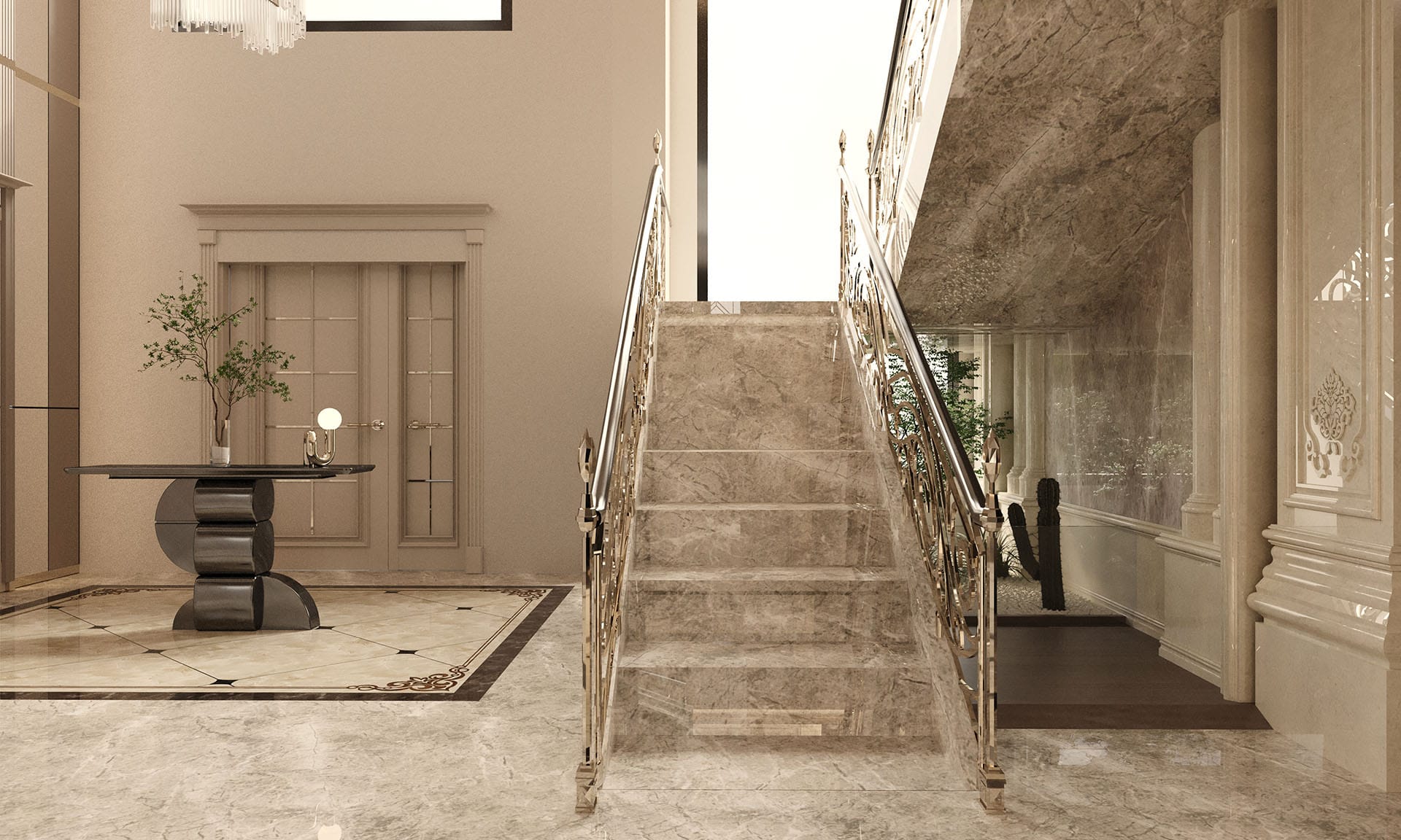 Klasik mimari referanslar modern iç mimarlık anlayışıyla harmanlanarak zamansız ve güçlü bir mekân kurgusu oluşturulmuştur. Villa genelinde hâkim olan açık bej, krem ve sıcak toprak tonları; mekânlara ferahlık, zarafet ve bütüncül bir estetik kazandırmaktadır. Giriş holünde çift hacimli alan etkisi, mermer zemin kaplamaları ve özel tasarım spiral avize ile vurgulanırken, ferforje detaylı merdiven korkulukları projeye sofistike bir karakter katmaktadır. Merdiven altındaki iç bahçe detayı, doğal dokuyu iç mekâna taşıyarak mekânın nefes almasını sağlar.