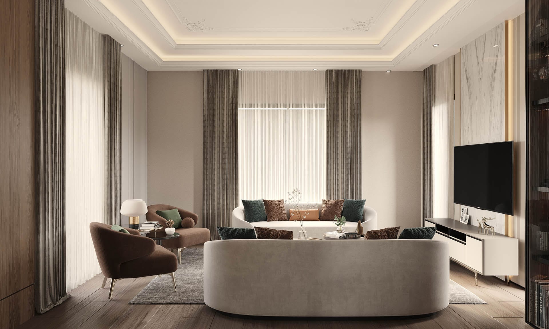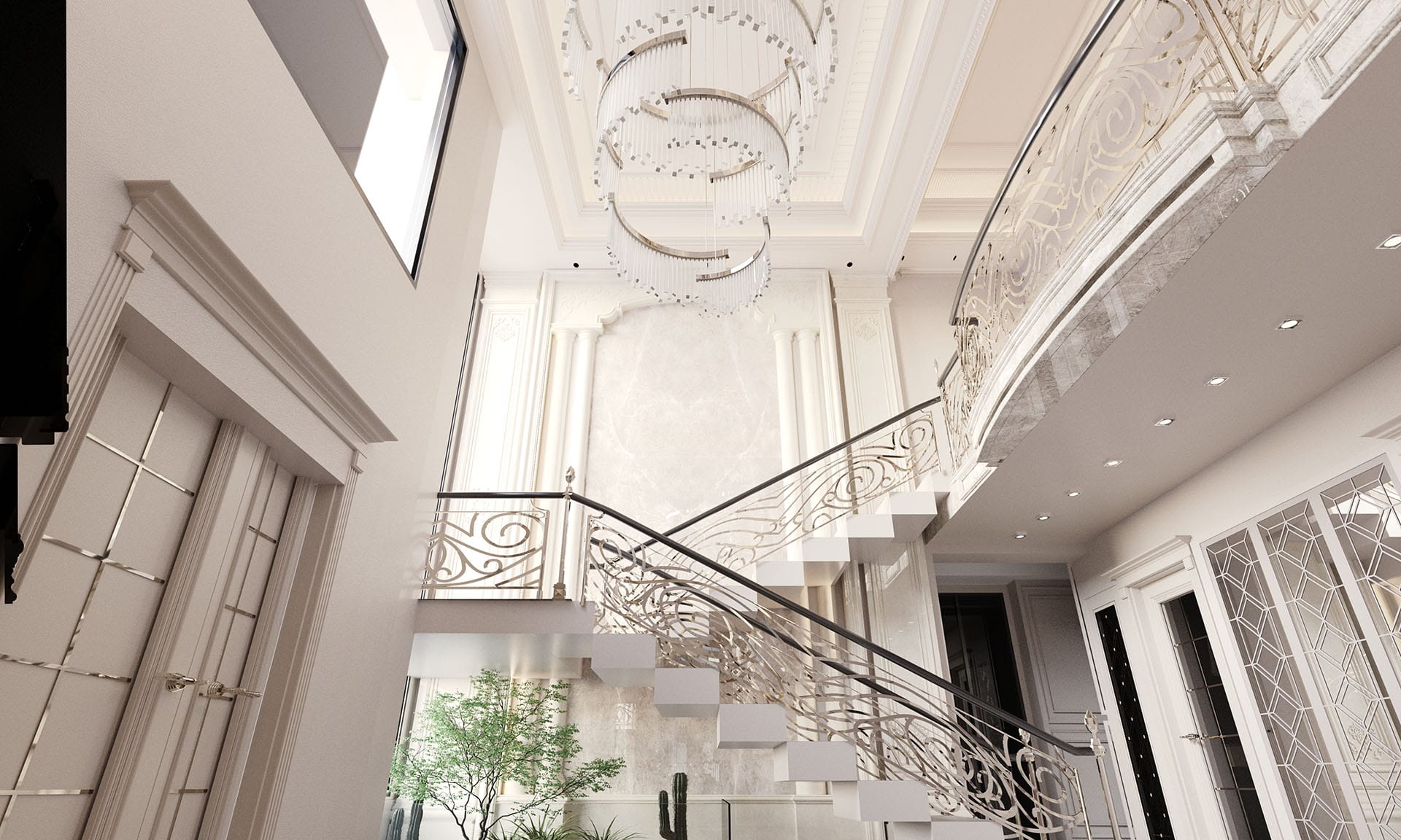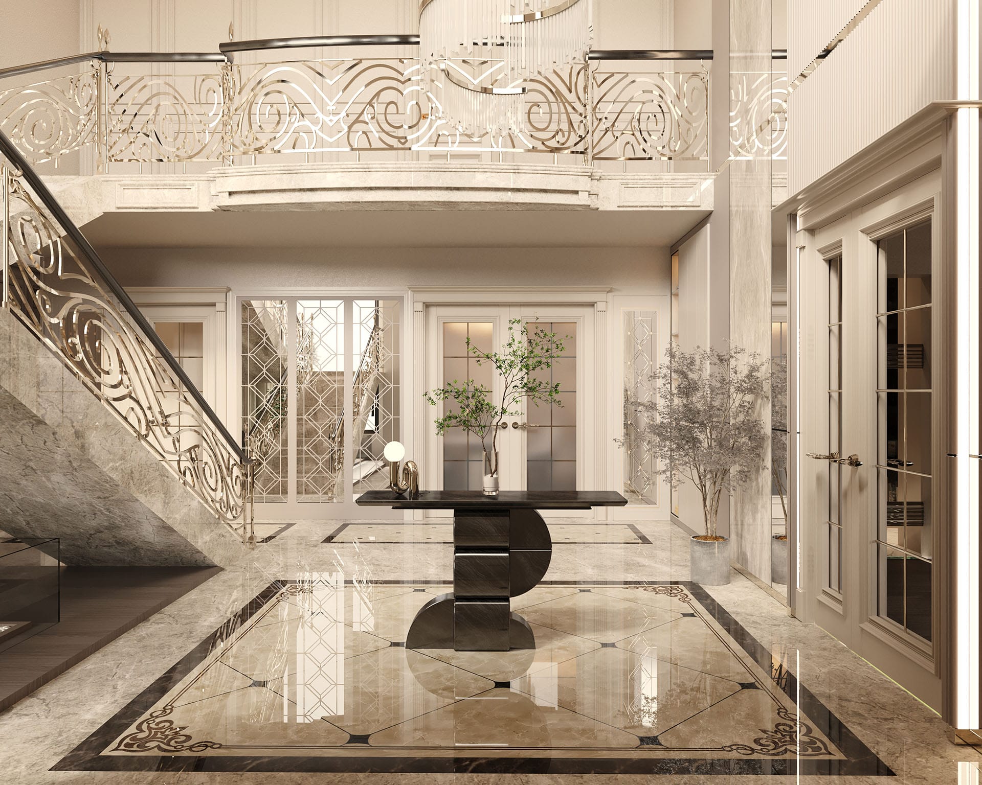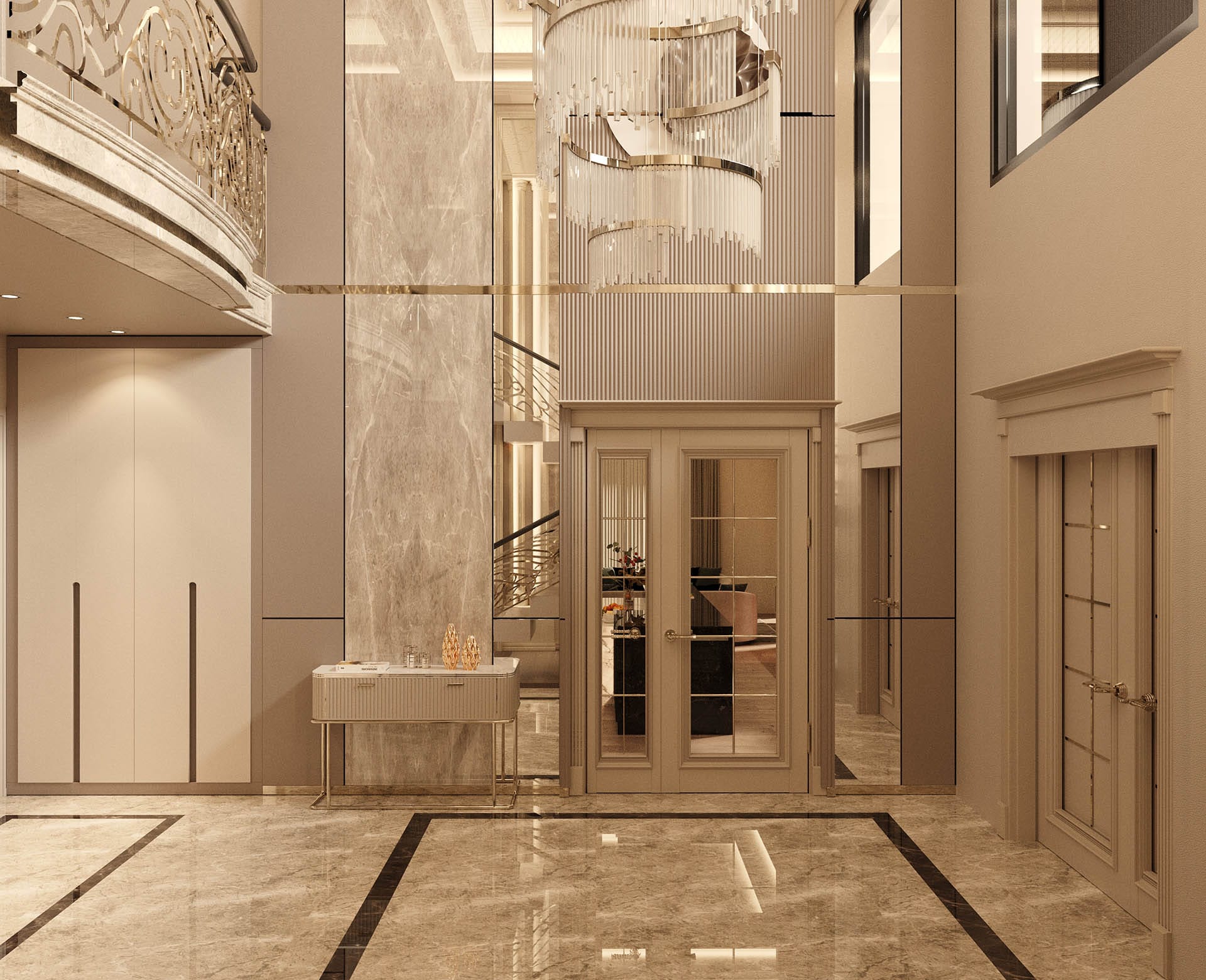 Klasik mimari referanslar modern iç mimarlık anlayışıyla harmanlanarak zamansız ve güçlü bir mekân kurgusu oluşturulmuştur. Villa genelinde hâkim olan açık bej, krem ve sıcak toprak tonları; mekânlara ferahlık, zarafet ve bütüncül bir estetik kazandırmaktadır. Giriş holünde çift hacimli alan etkisi, mermer zemin kaplamaları ve özel tasarım spiral avize ile vurgulanırken, ferforje detaylı merdiven korkulukları projeye sofistike bir karakter katmaktadır. Merdiven altındaki iç bahçe detayı, doğal dokuyu iç mekâna taşıyarak mekânın nefes almasını sağlar.