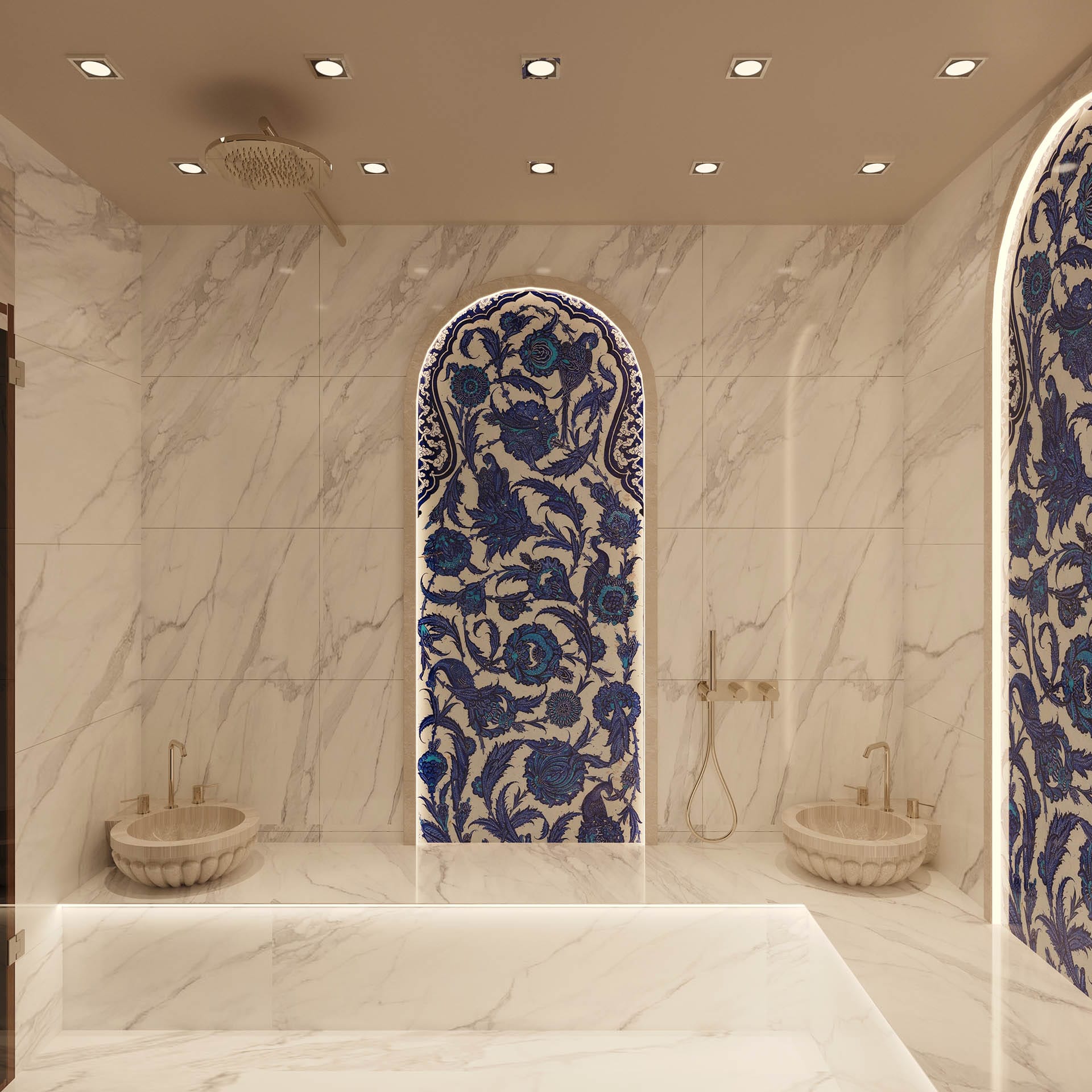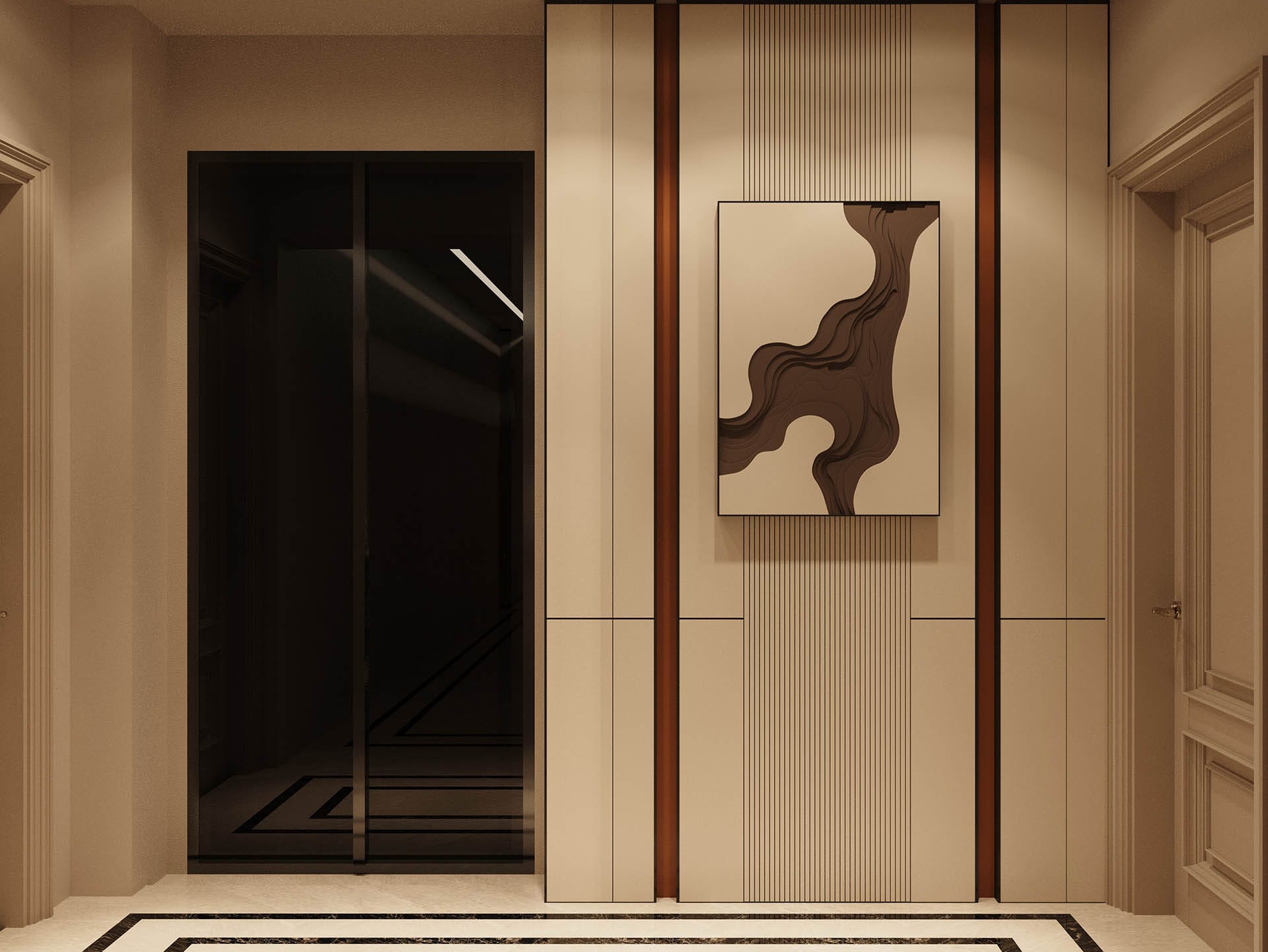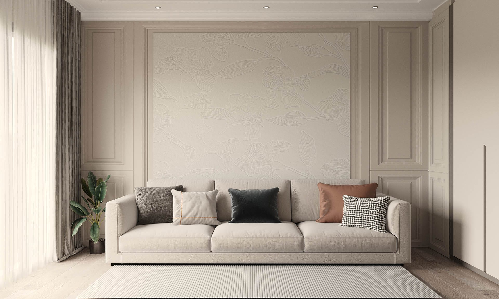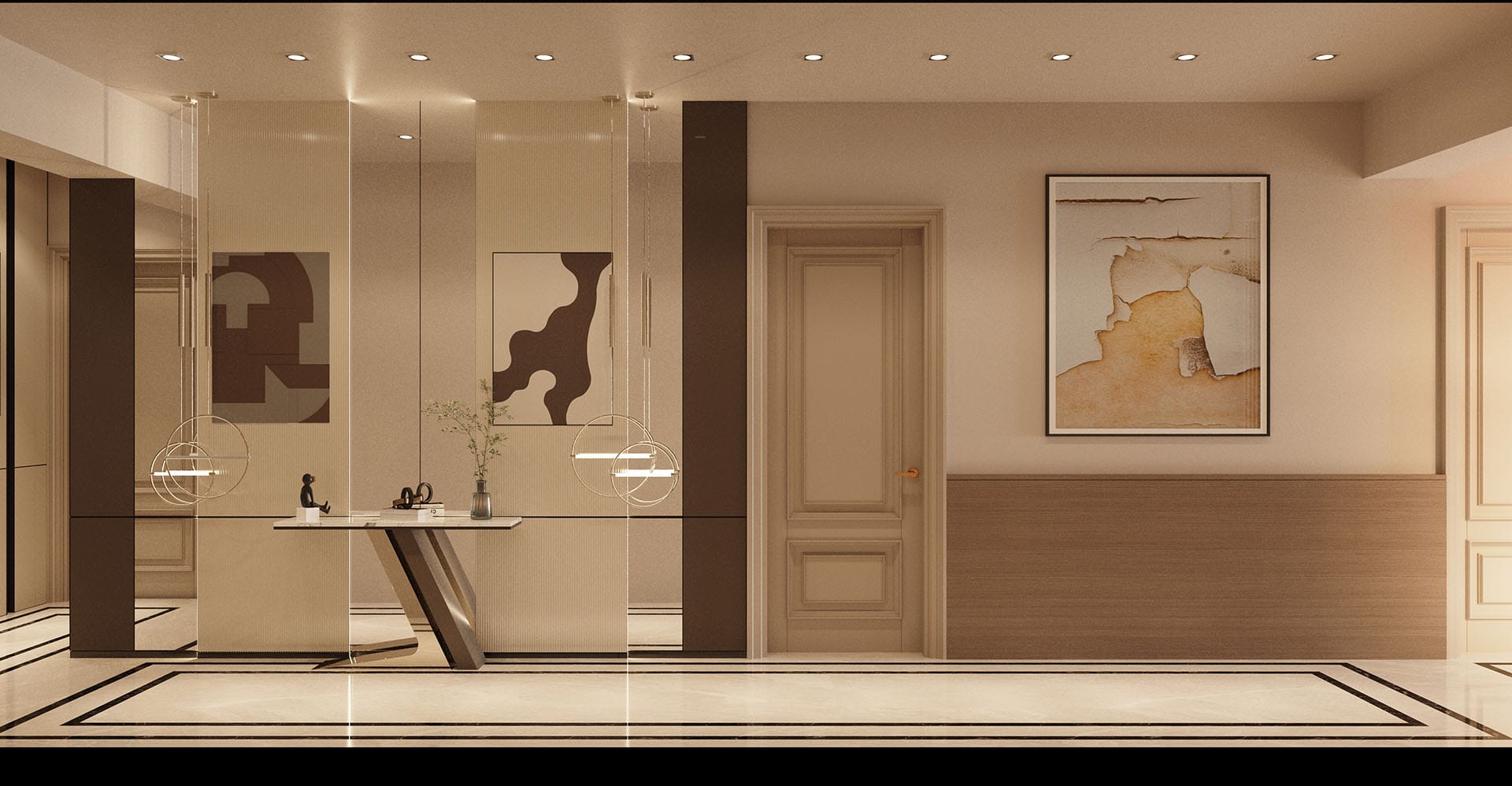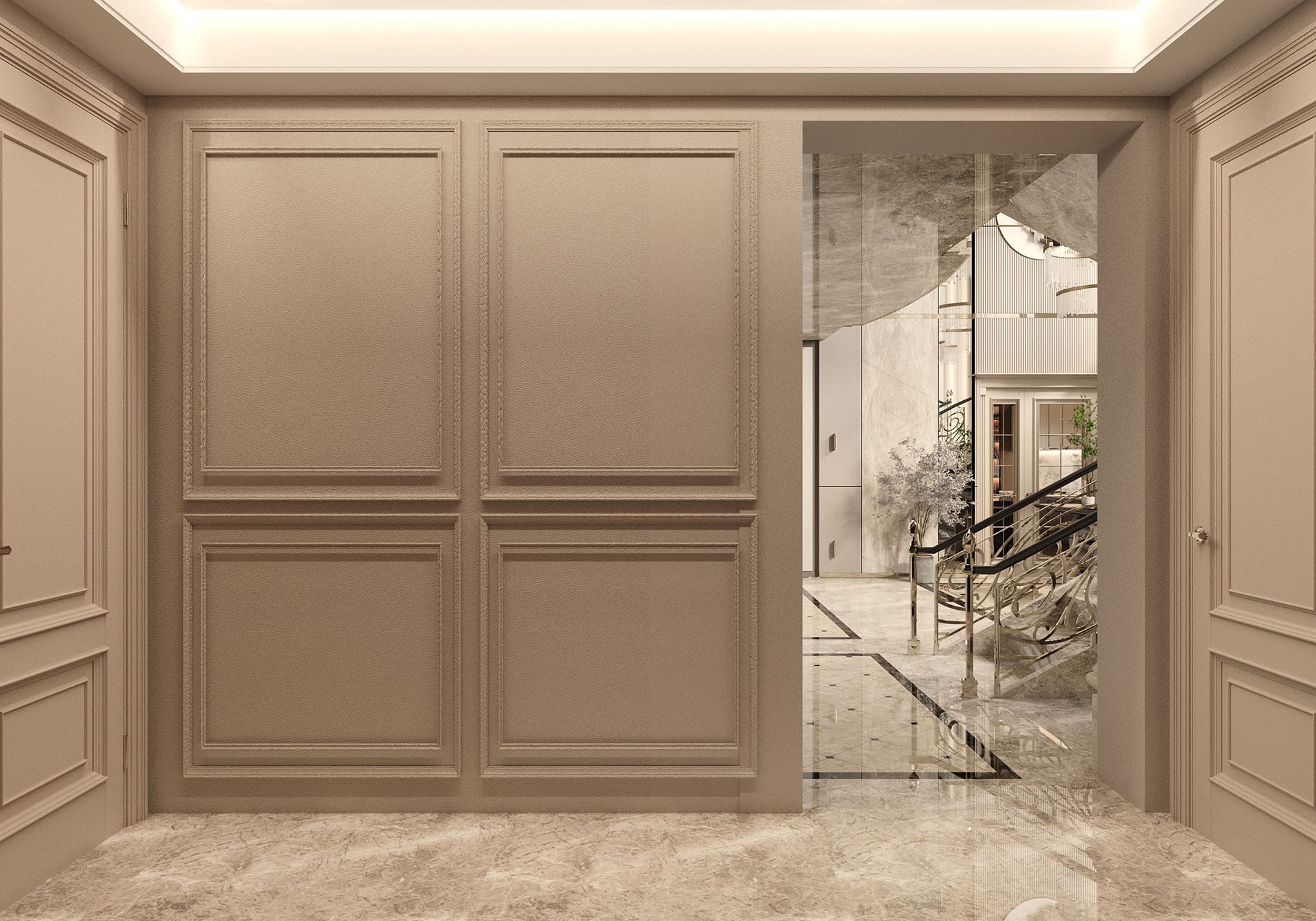 Klasik mimari referanslar modern iç mimarlık anlayışıyla harmanlanarak zamansız ve güçlü bir mekân kurgusu oluşturulmuştur. Villa genelinde hâkim olan açık bej, krem ve sıcak toprak tonları; mekânlara ferahlık, zarafet ve bütüncül bir estetik kazandırmaktadır. Giriş holünde çift hacimli alan etkisi, mermer zemin kaplamaları ve özel tasarım spiral avize ile vurgulanırken, ferforje detaylı merdiven korkulukları projeye sofistike bir karakter katmaktadır. Merdiven altındaki iç bahçe detayı, doğal dokuyu iç mekâna taşıyarak mekânın nefes almasını sağlar.