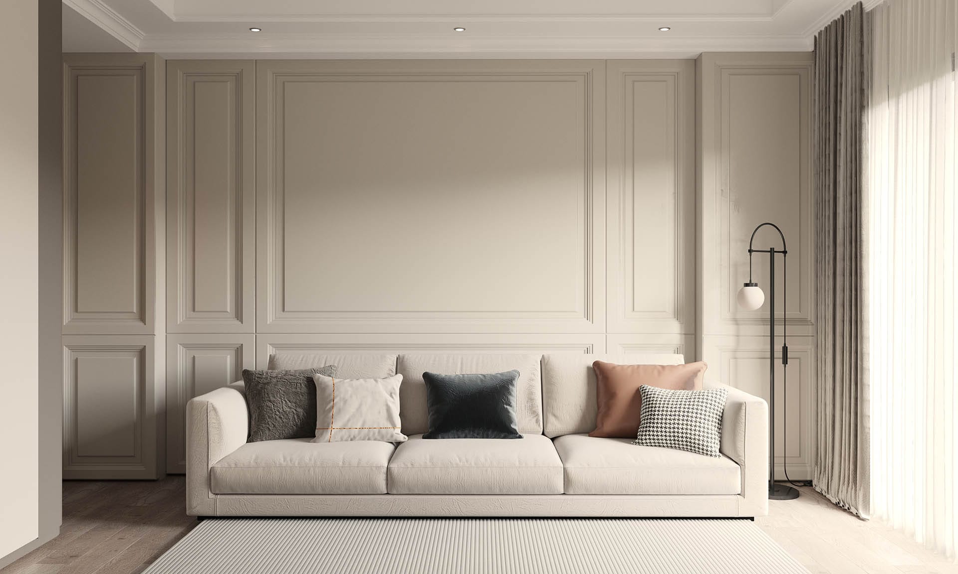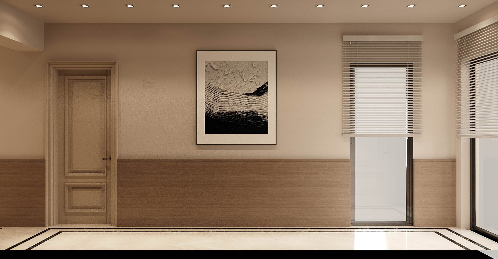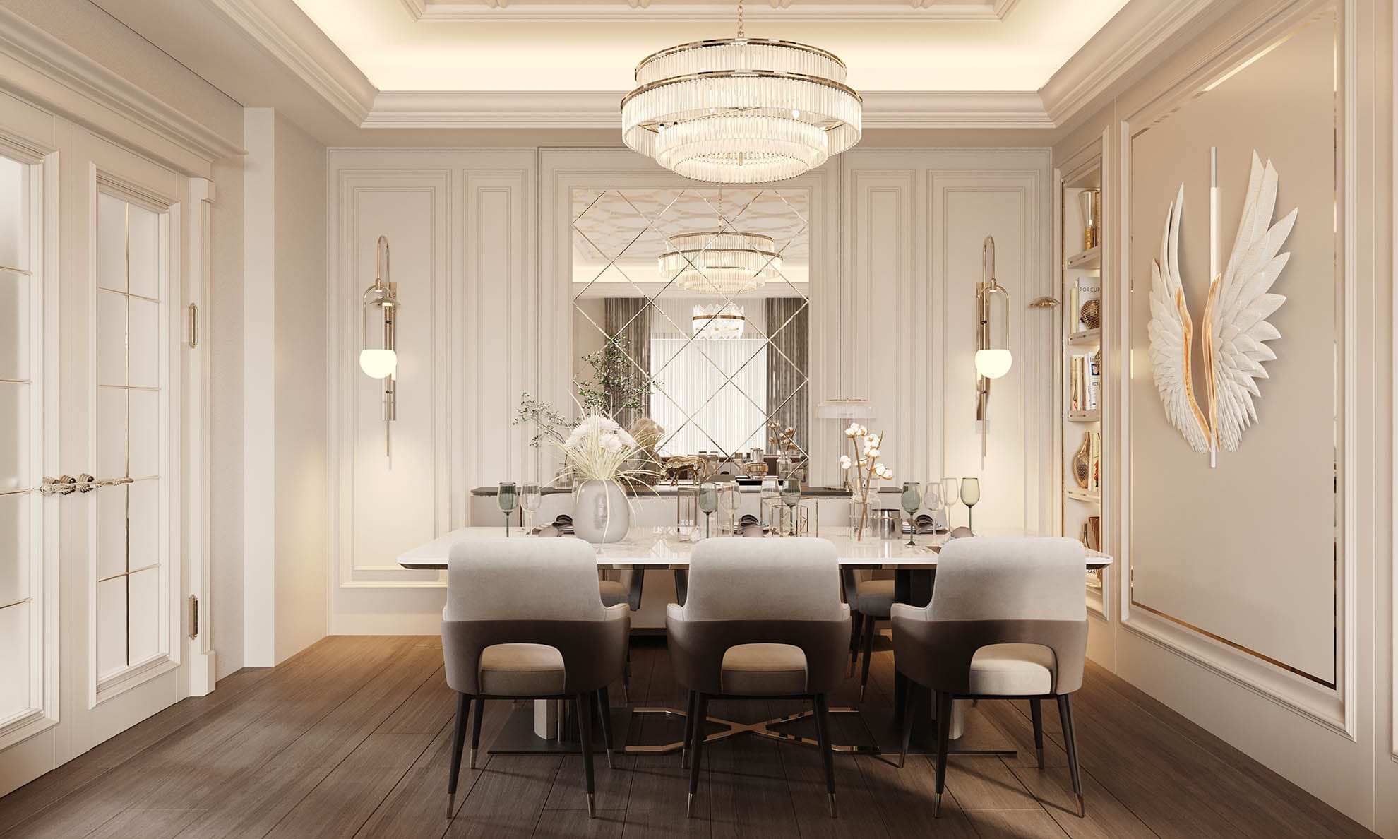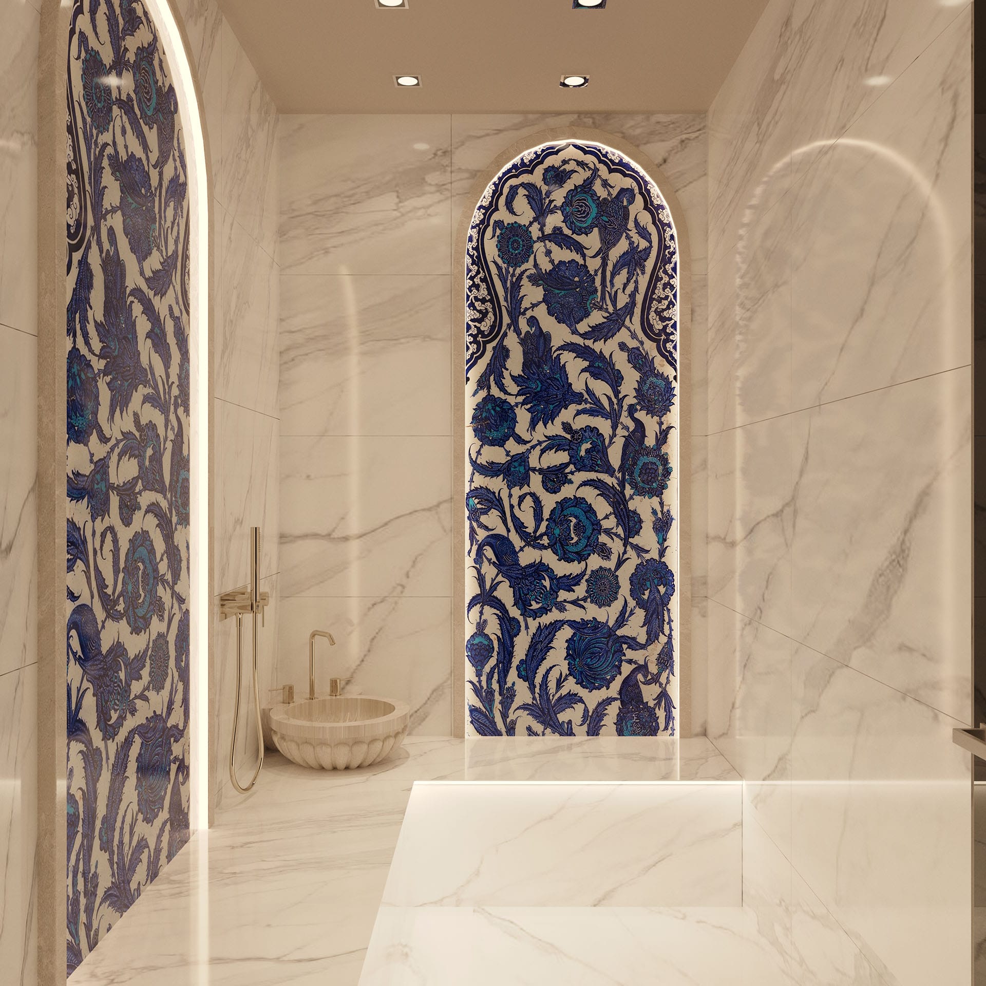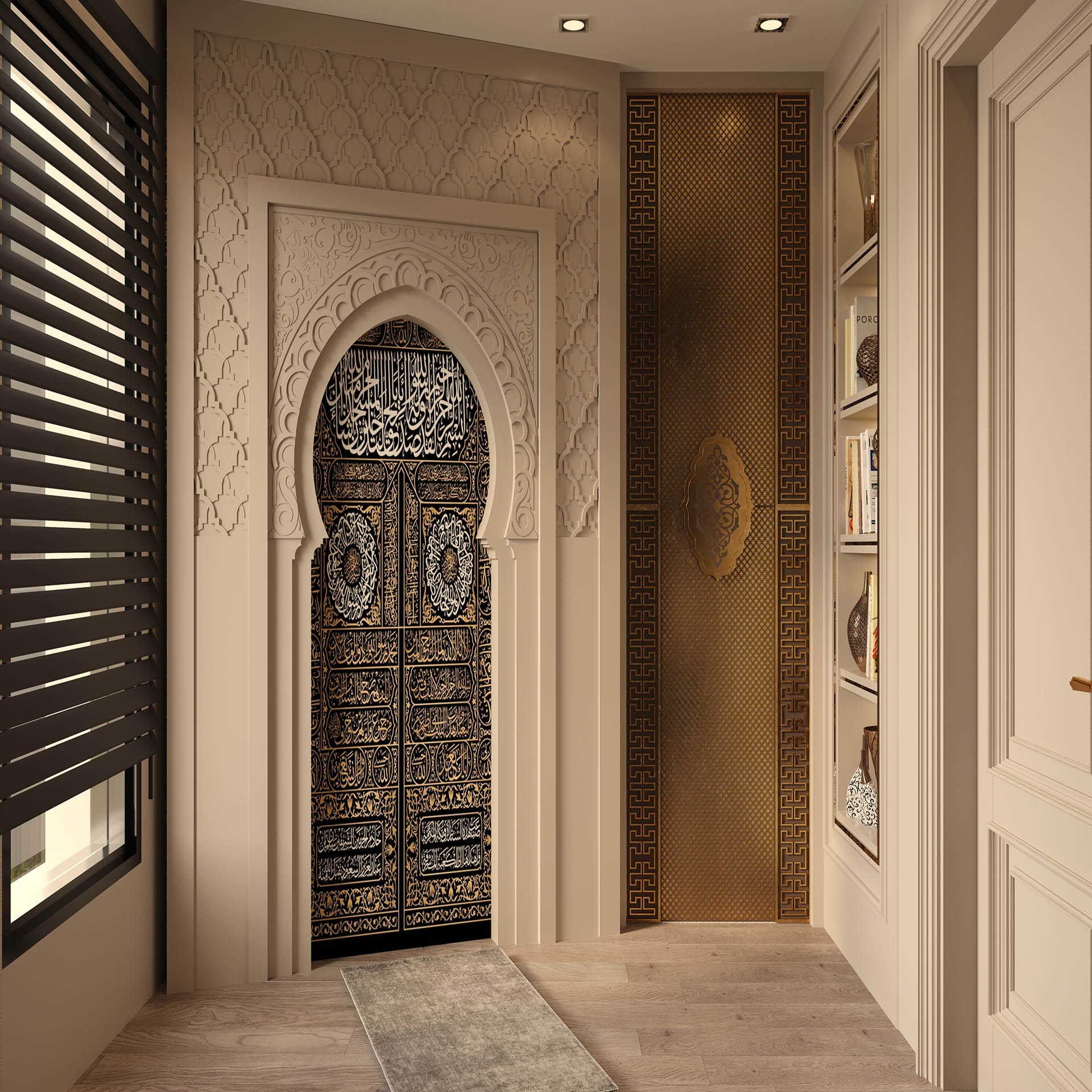 Klasik mimari referanslar modern iç mimarlık anlayışıyla harmanlanarak zamansız ve güçlü bir mekân kurgusu oluşturulmuştur. Villa genelinde hâkim olan açık bej, krem ve sıcak toprak tonları; mekânlara ferahlık, zarafet ve bütüncül bir estetik kazandırmaktadır. Giriş holünde çift hacimli alan etkisi, mermer zemin kaplamaları ve özel tasarım spiral avize ile vurgulanırken, ferforje detaylı merdiven korkulukları projeye sofistike bir karakter katmaktadır. Merdiven altındaki iç bahçe detayı, doğal dokuyu iç mekâna taşıyarak mekânın nefes almasını sağlar.