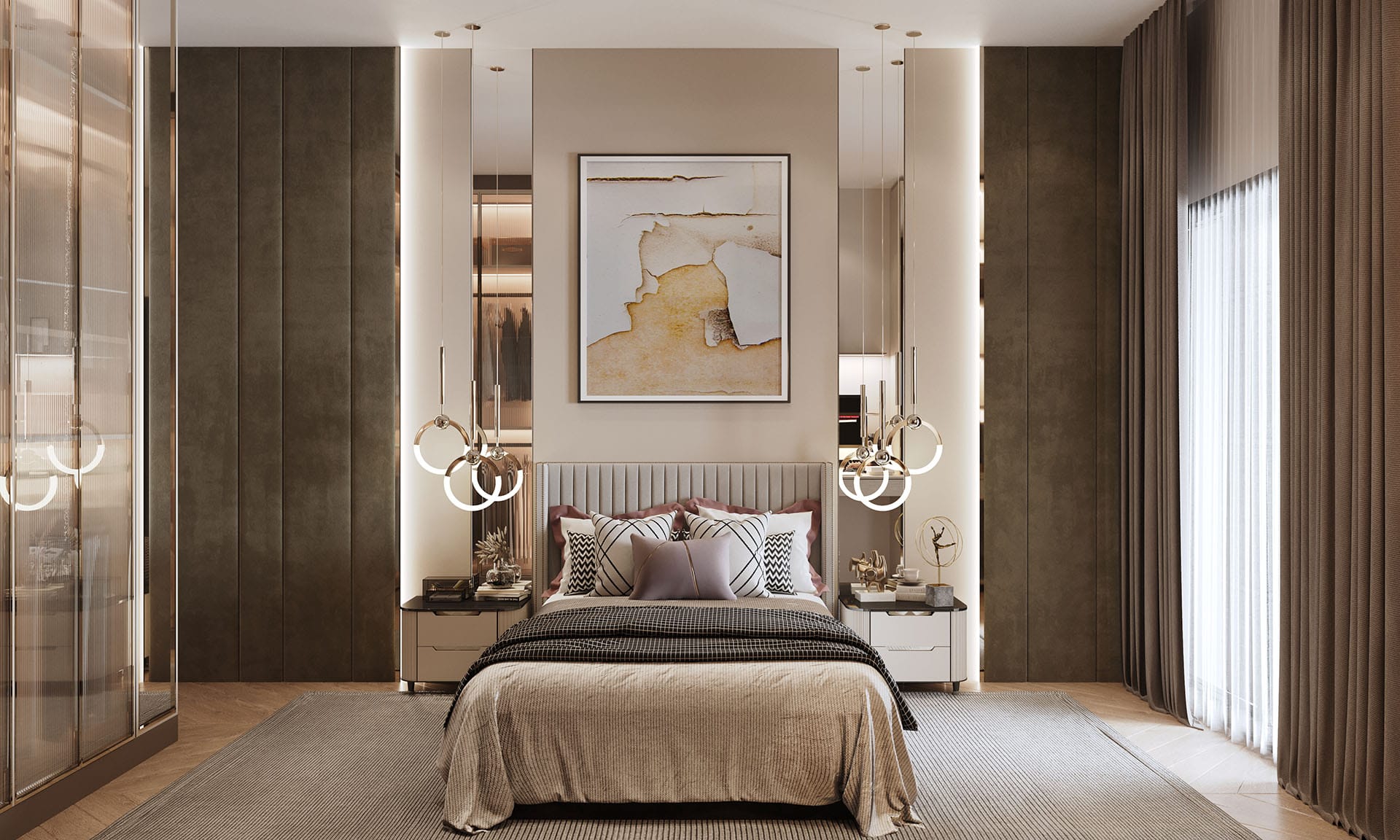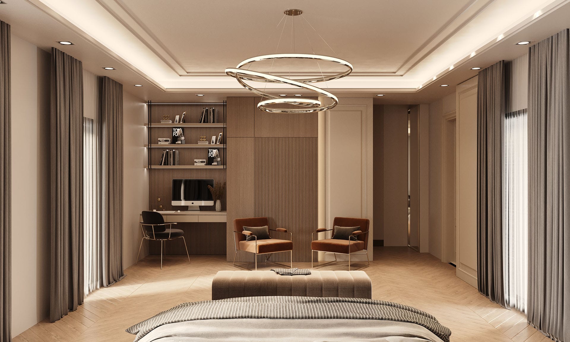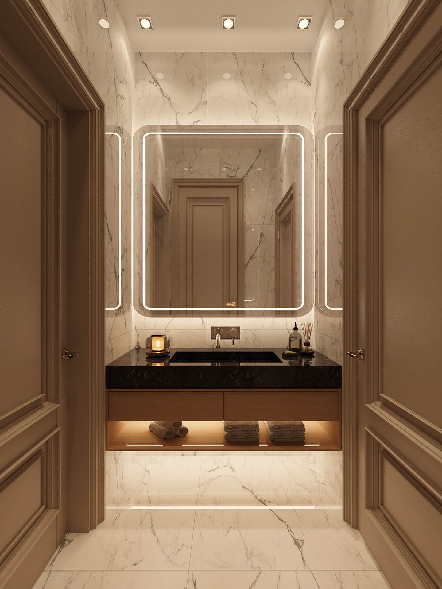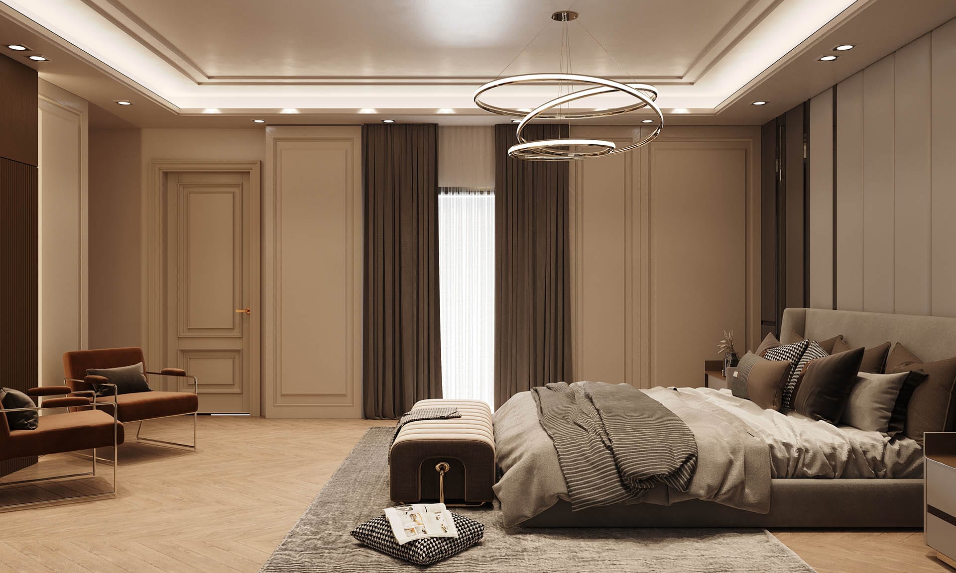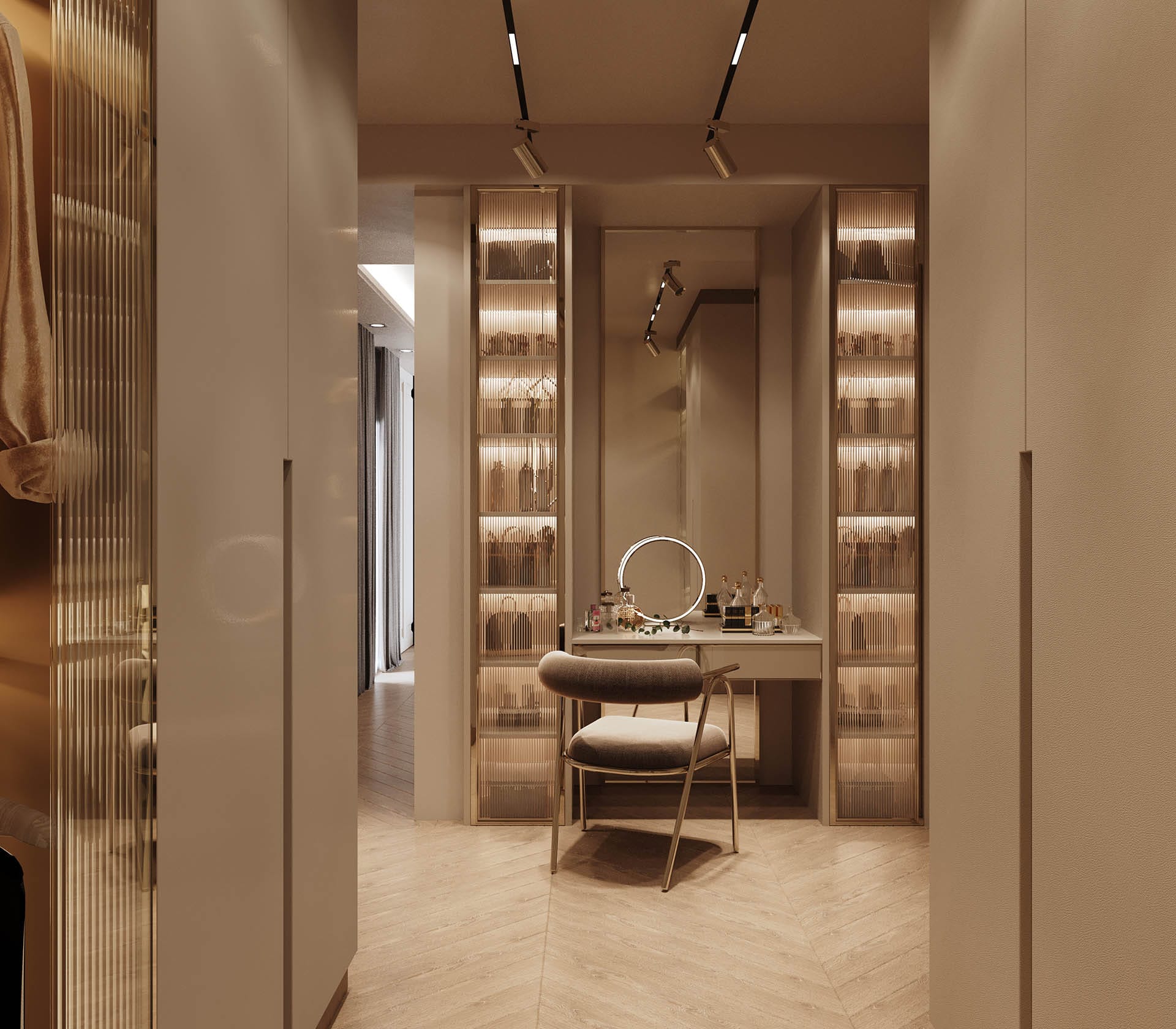 Yatak odalarında sade ama karakterli detaylar tercih edilmiş, özel tasarım çalışma ve makyaj alanlarıyla kişisel kullanım senaryoları desteklenmiştir. Projenin tamamında kullanılan özel aydınlatmalar, ahşap ve mermer dokularla birlikte lüks, sıcak ve dengeli bir yaşam alanı sunmaktadır.