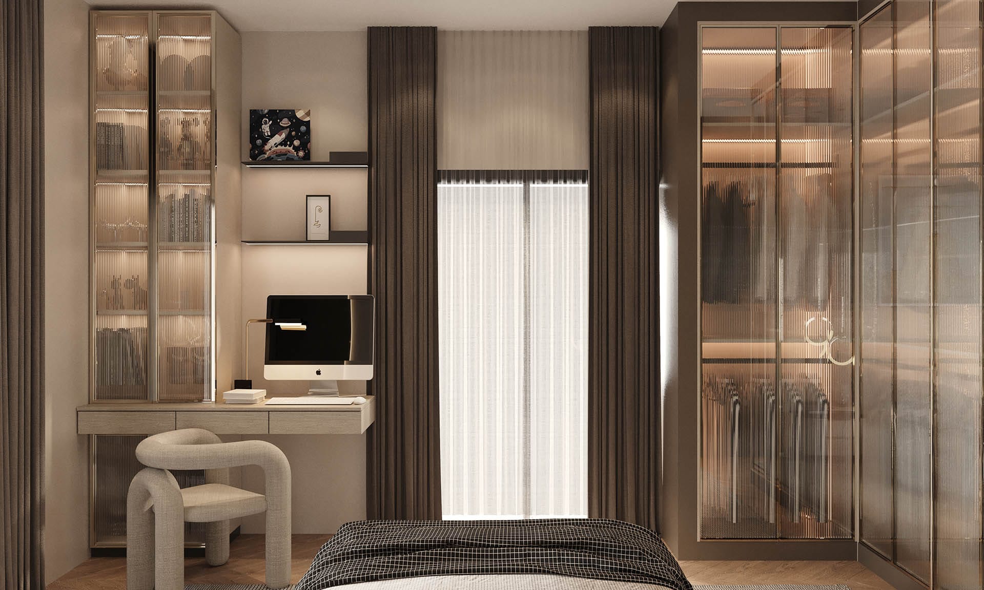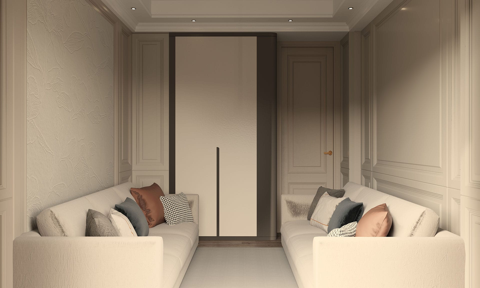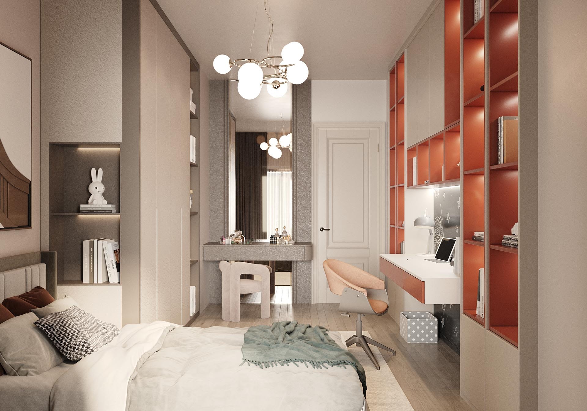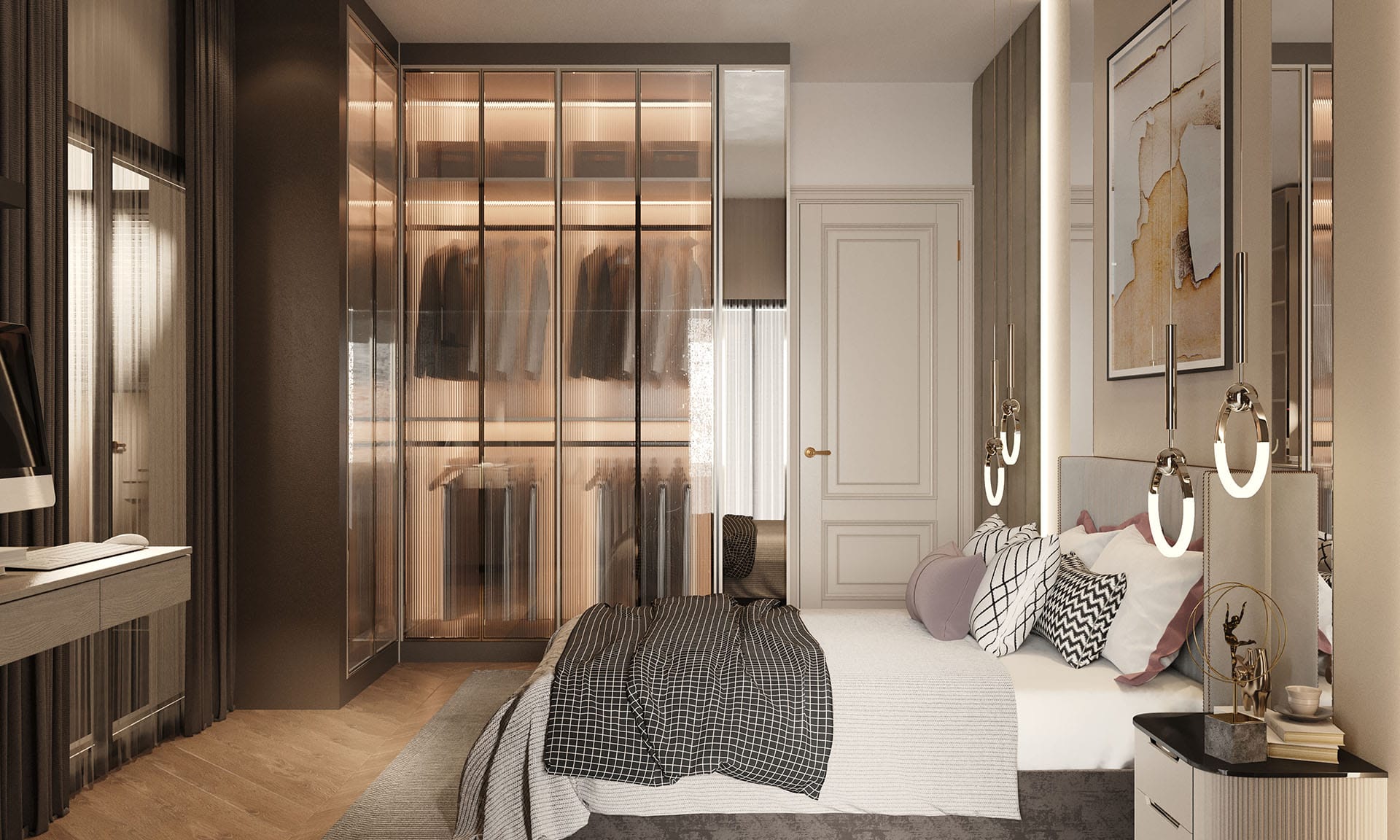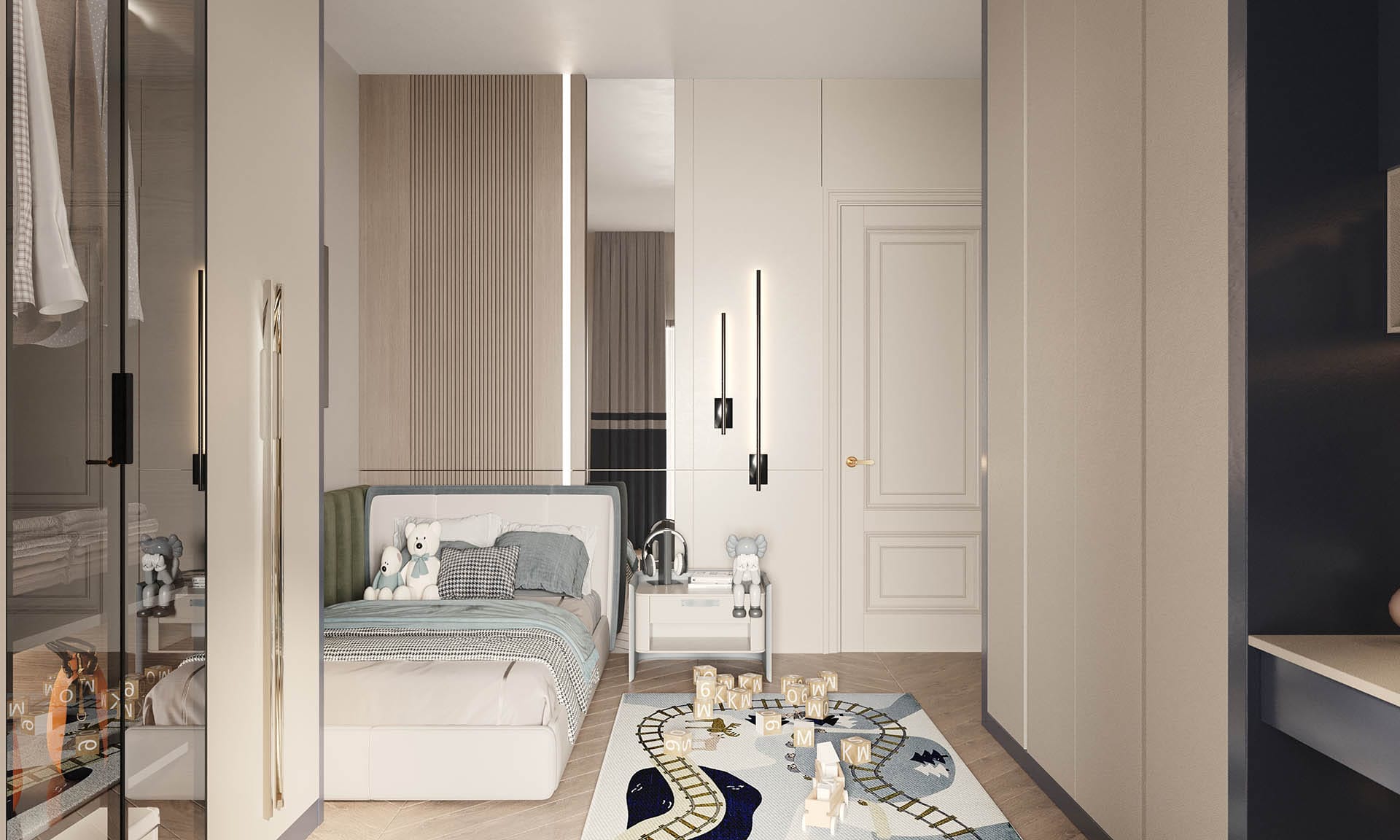 Yatak odalarında sade ama karakterli detaylar tercih edilmiş, özel tasarım çalışma ve makyaj alanlarıyla kişisel kullanım senaryoları desteklenmiştir. Projenin tamamında kullanılan özel aydınlatmalar, ahşap ve mermer dokularla birlikte lüks, sıcak ve dengeli bir yaşam alanı sunmaktadır.
