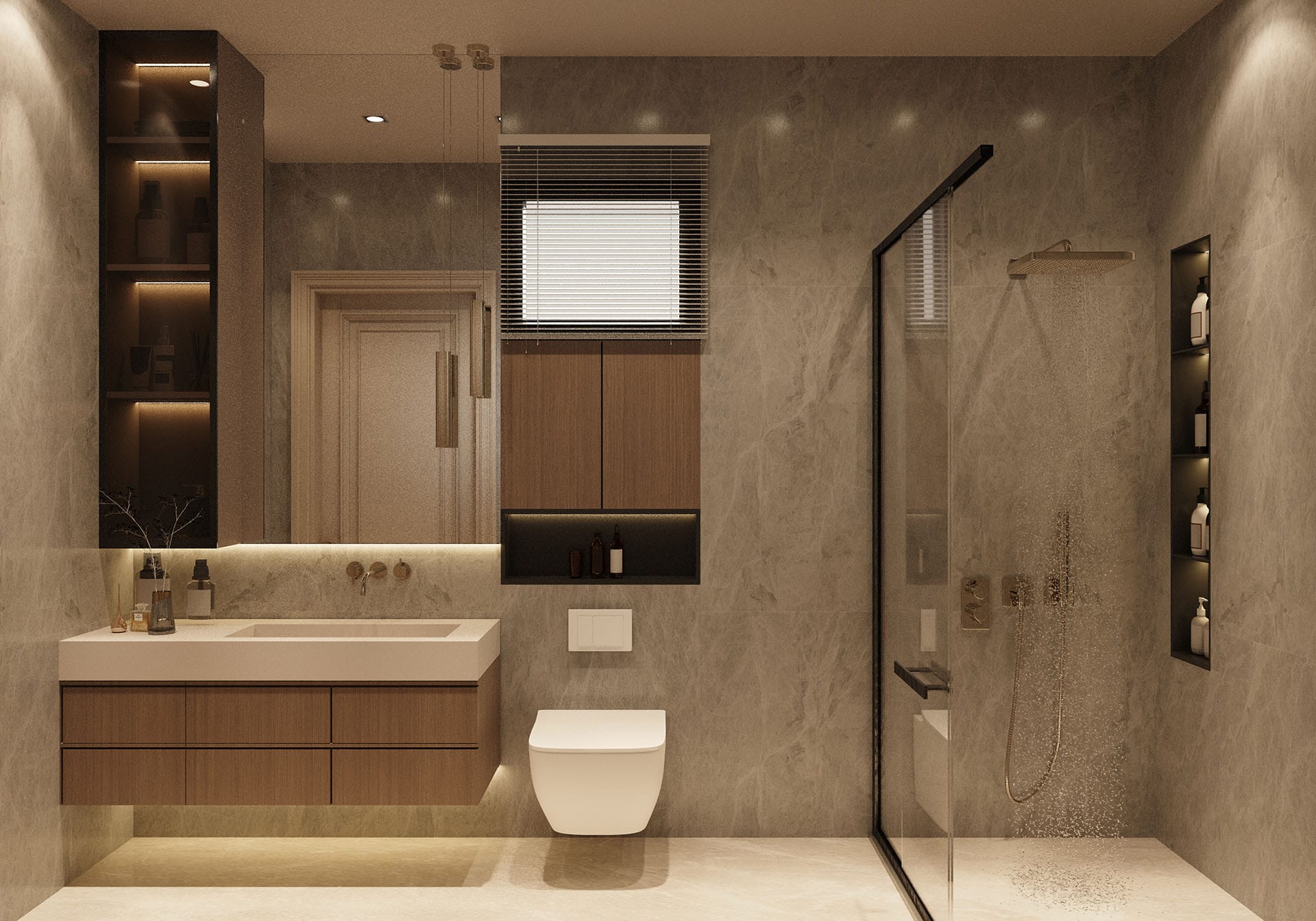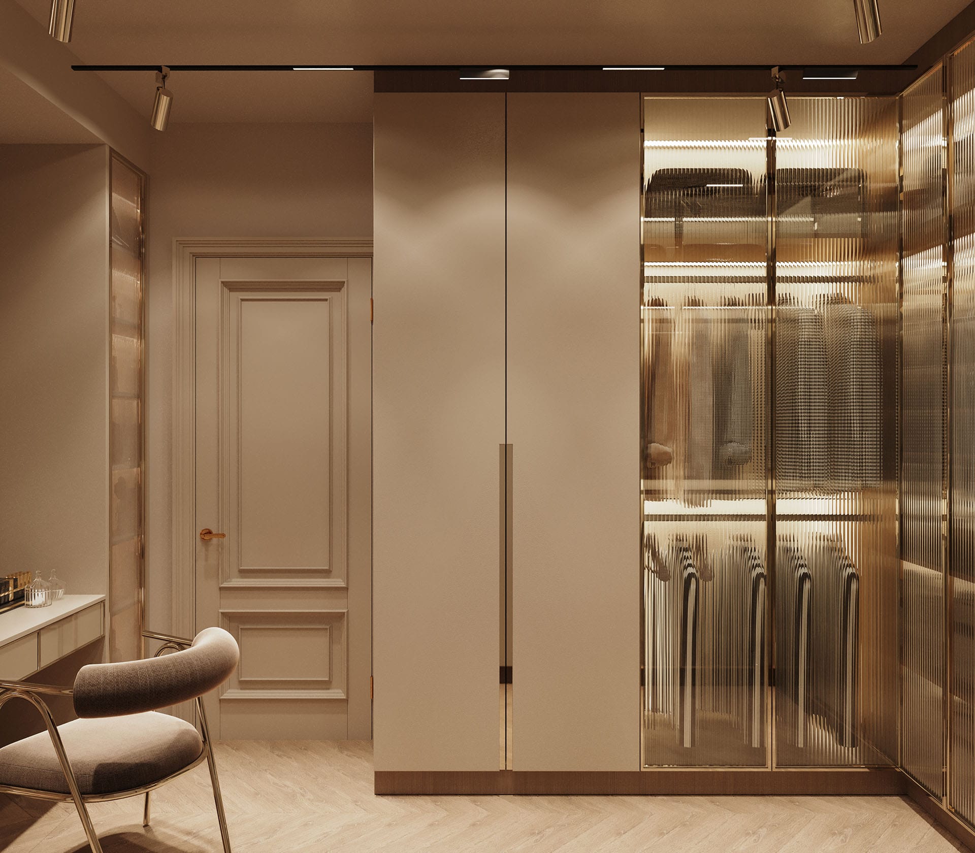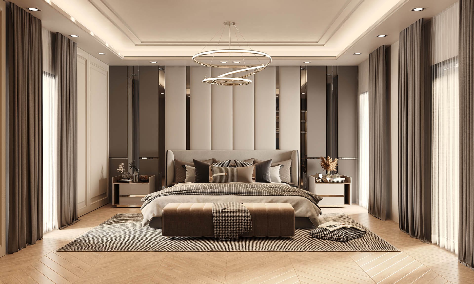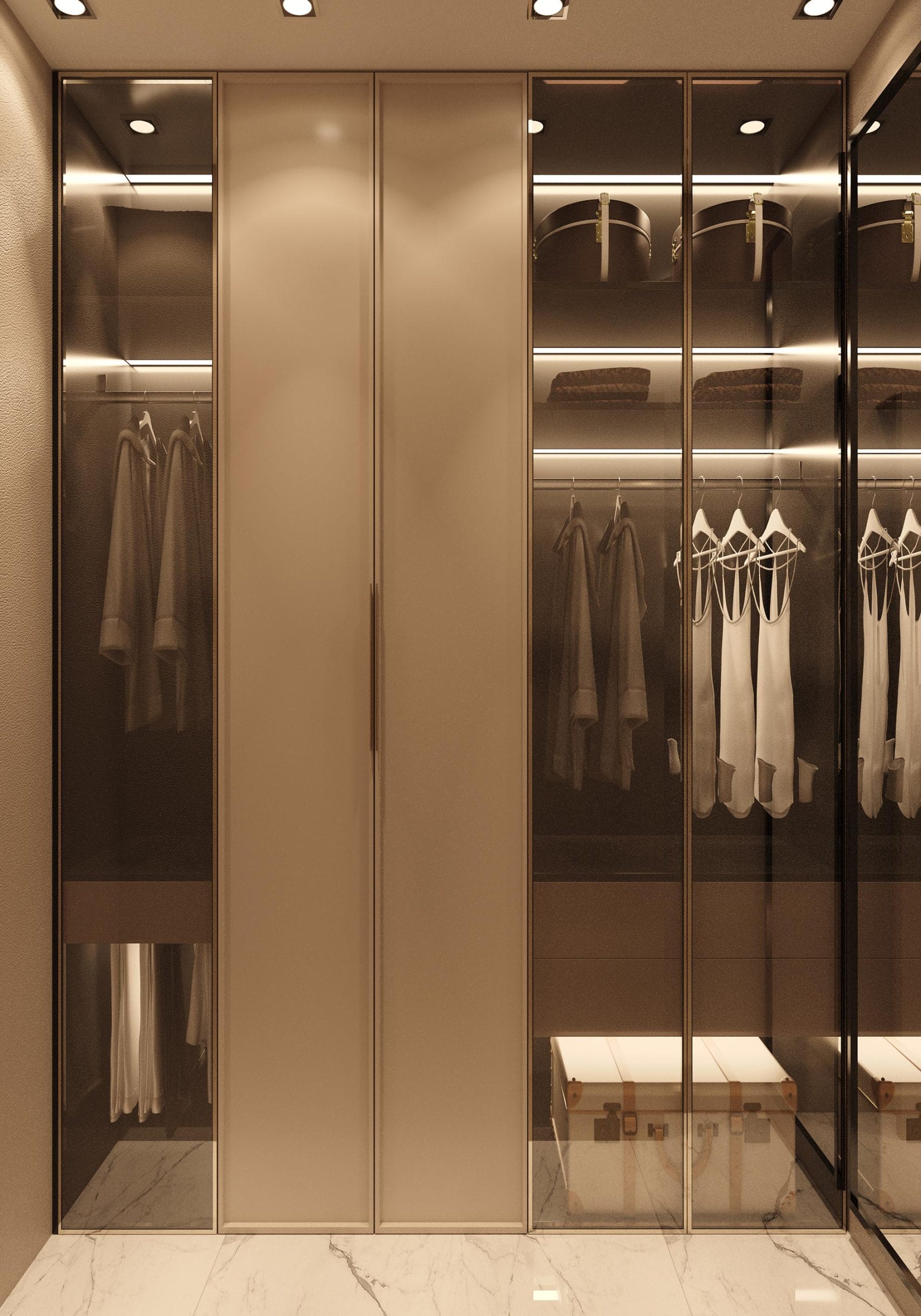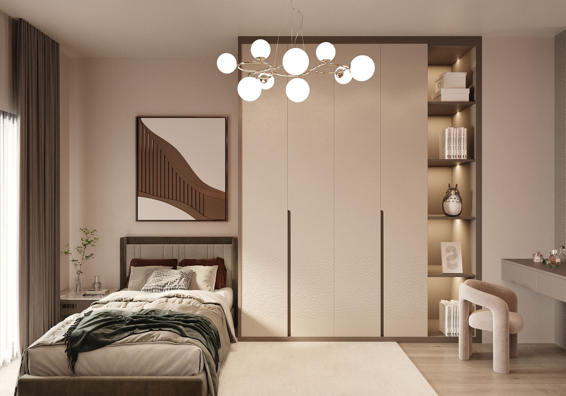 Yatak odalarında sade ama karakterli detaylar tercih edilmiş, özel tasarım çalışma ve makyaj alanlarıyla kişisel kullanım senaryoları desteklenmiştir. Projenin tamamında kullanılan özel aydınlatmalar, ahşap ve mermer dokularla birlikte lüks, sıcak ve dengeli bir yaşam alanı sunmaktadır.