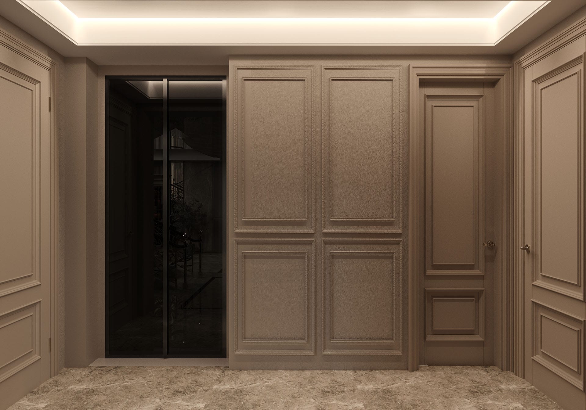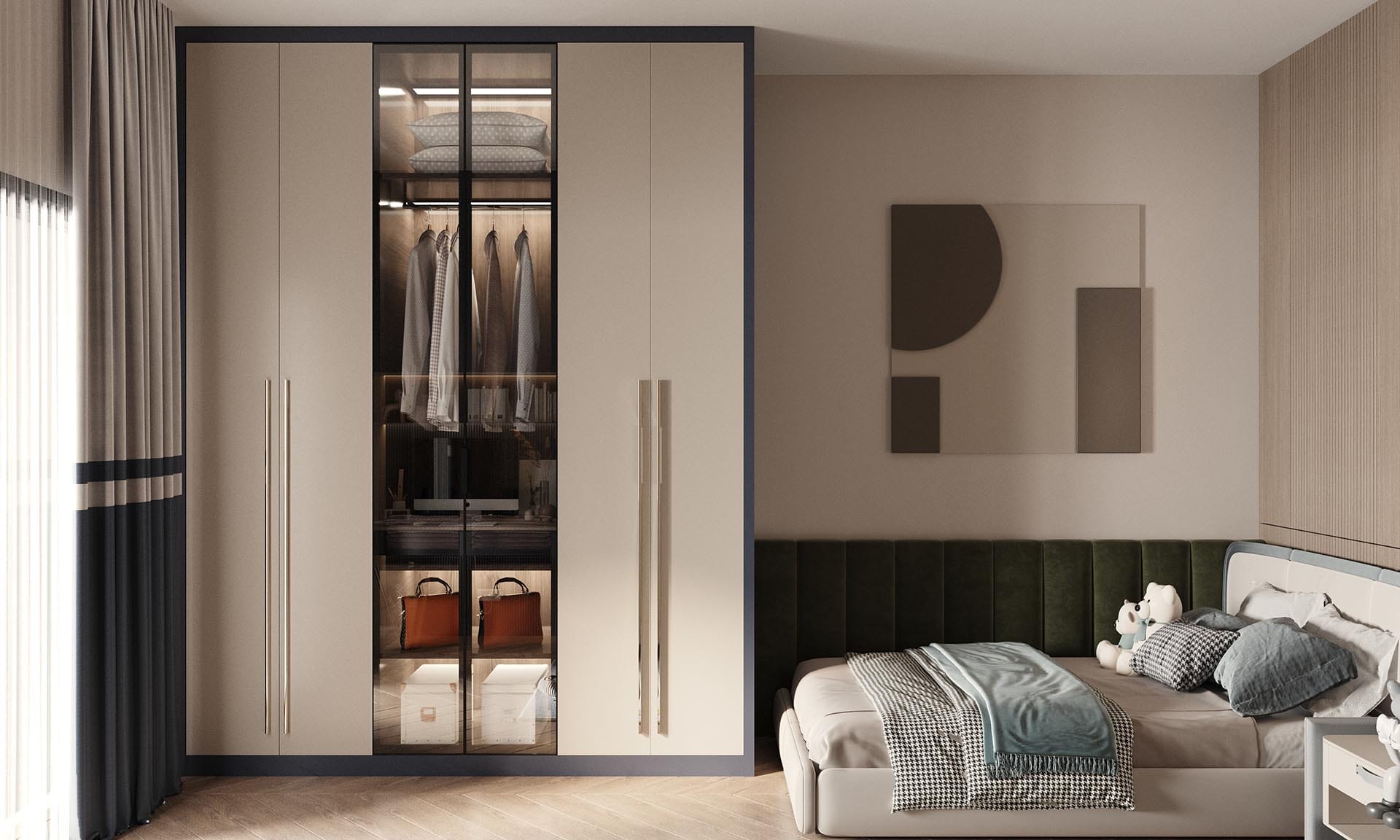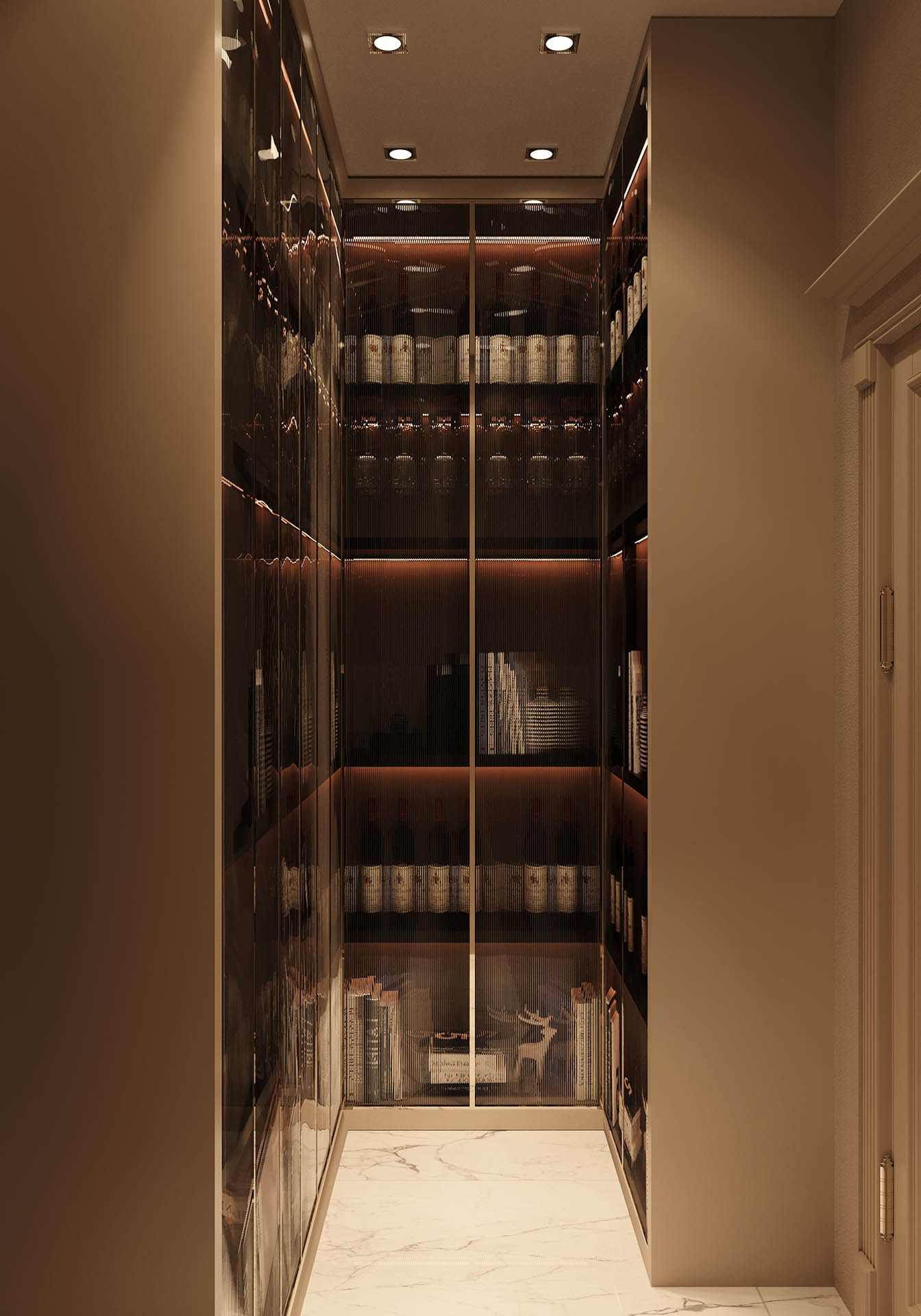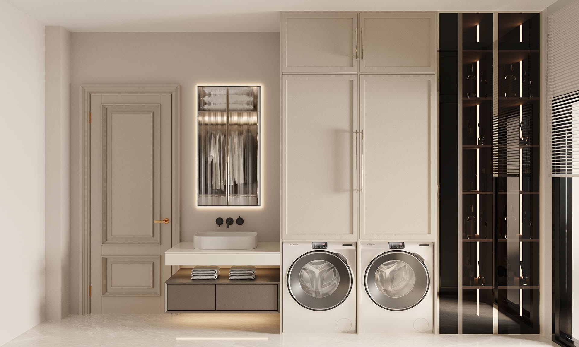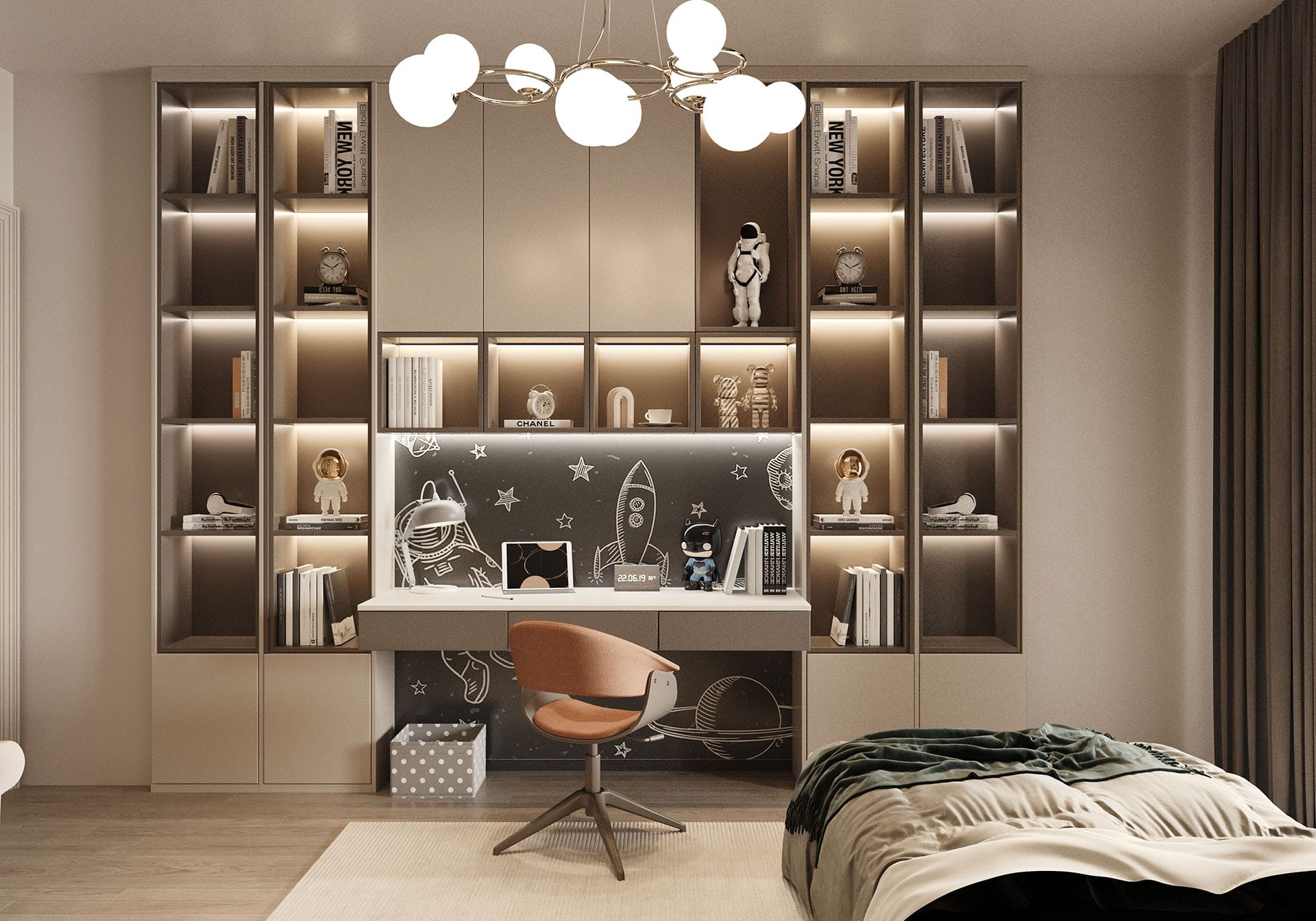 Yatak odalarında sade ama karakterli detaylar tercih edilmiş, özel tasarım çalışma ve makyaj alanlarıyla kişisel kullanım senaryoları desteklenmiştir. Projenin tamamında kullanılan özel aydınlatmalar, ahşap ve mermer dokularla birlikte lüks, sıcak ve dengeli bir yaşam alanı sunmaktadır.