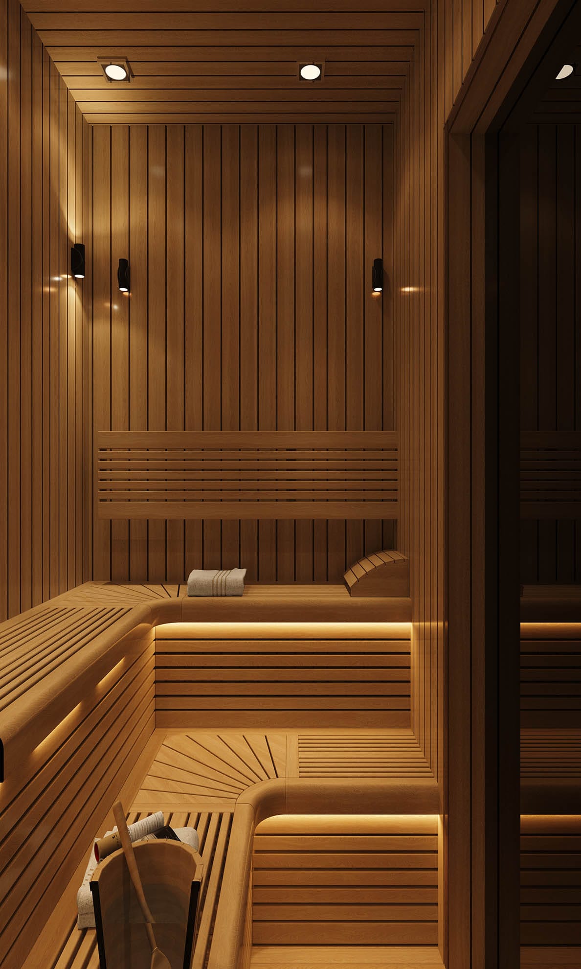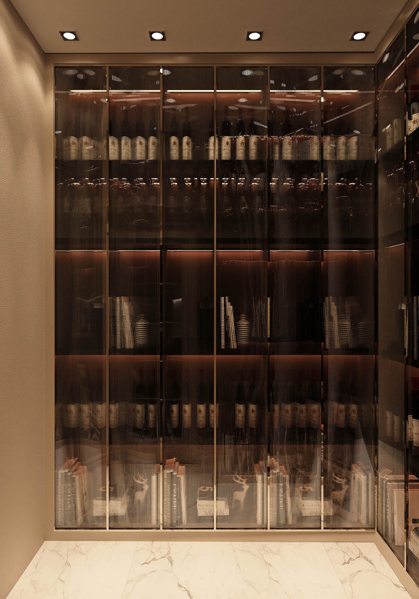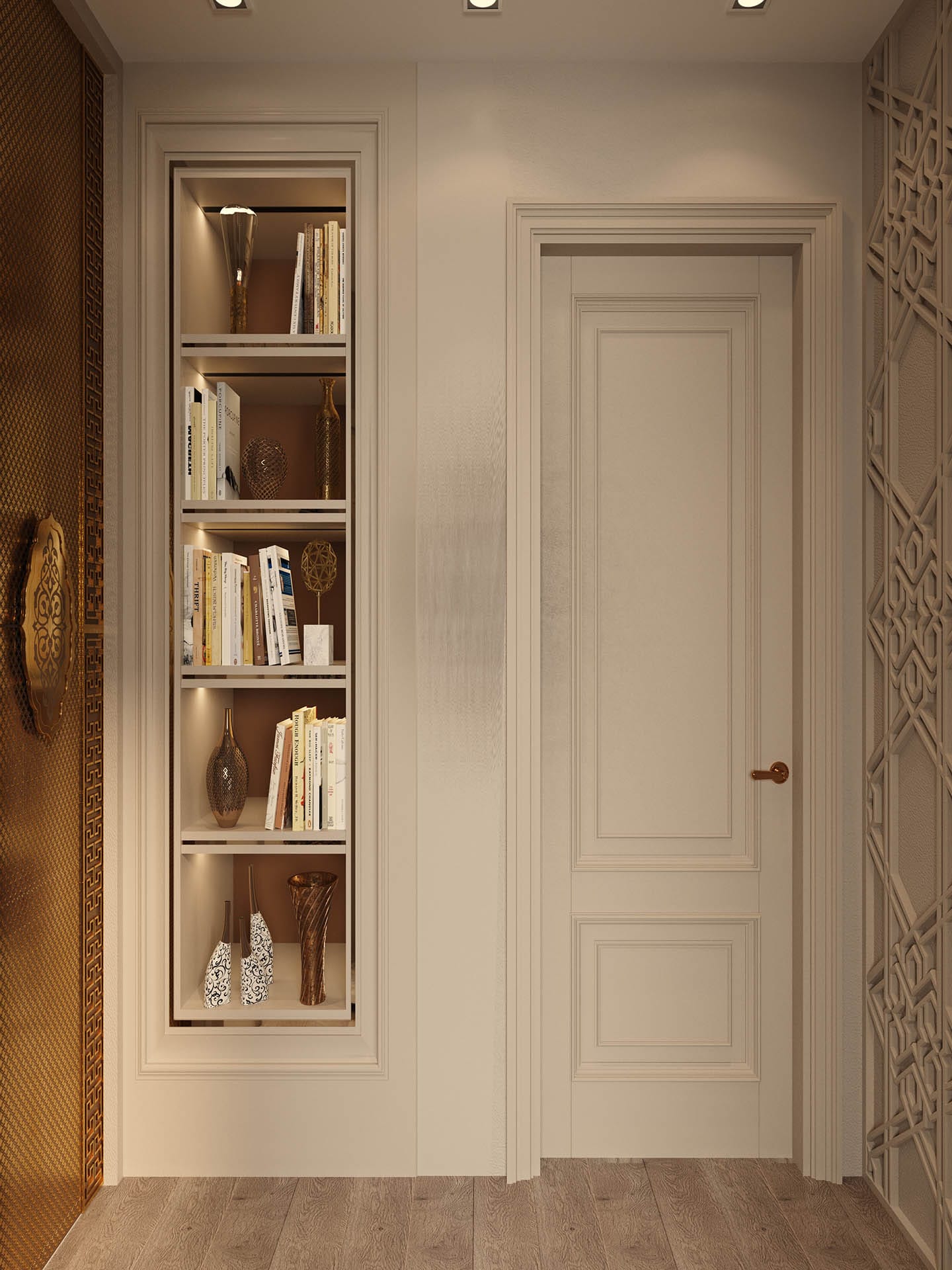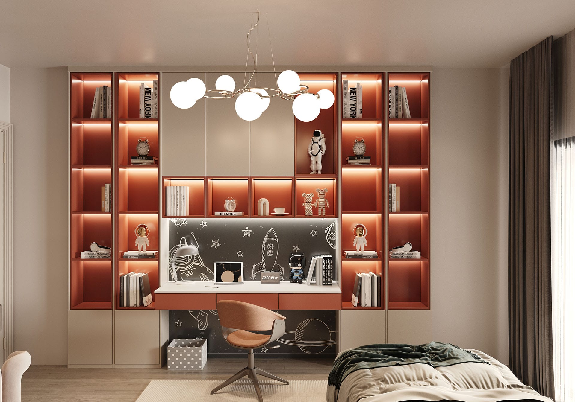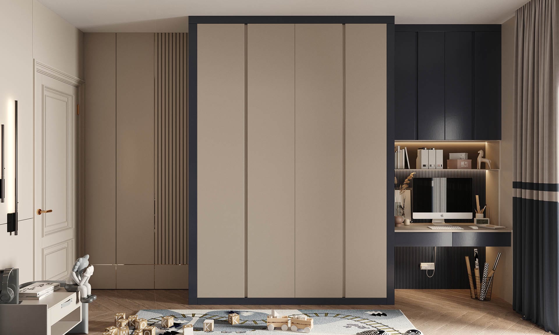 Yatak odalarında sade ama karakterli detaylar tercih edilmiş, özel tasarım çalışma ve makyaj alanlarıyla kişisel kullanım senaryoları desteklenmiştir. Projenin tamamında kullanılan özel aydınlatmalar, ahşap ve mermer dokularla birlikte lüks, sıcak ve dengeli bir yaşam alanı sunmaktadır.