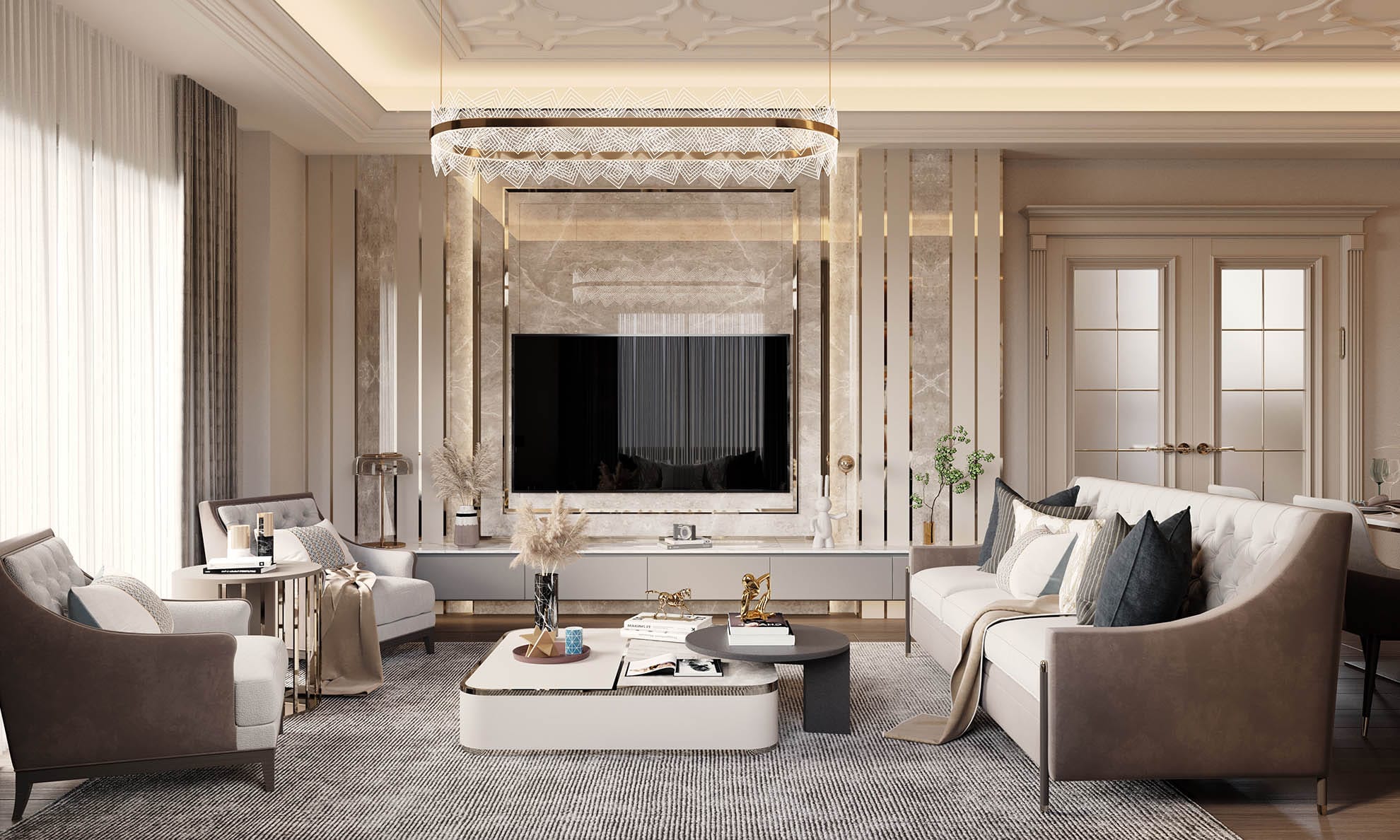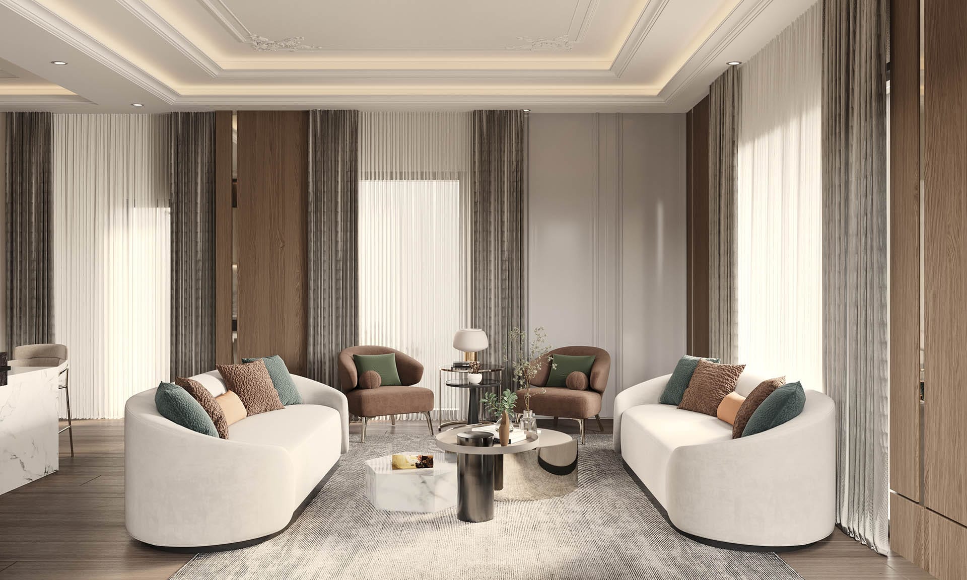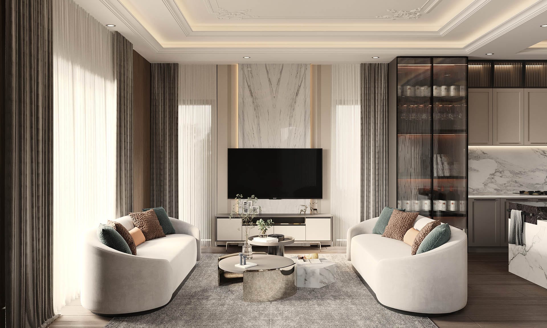 Yaşam alanlarında modern ve konfor odaklı bir yaklaşım benimsenmiştir. Salon bölümünde yumuşak formlu oturma grupları, mermer detaylı TV ünitesi ve doğal ışığı süzen perdeler dengeli bir kompozisyon oluşturur. Açık mutfak tasarımında ise mermer ada tezgâh, cam kapaklı vitrin dolaplar ve gizli aydınlatmalar ön plana çıkmaktadır. Mutfak, hem sosyal kullanım hem de fonksiyonellik açısından güçlü bir planlamaya sahiptir.