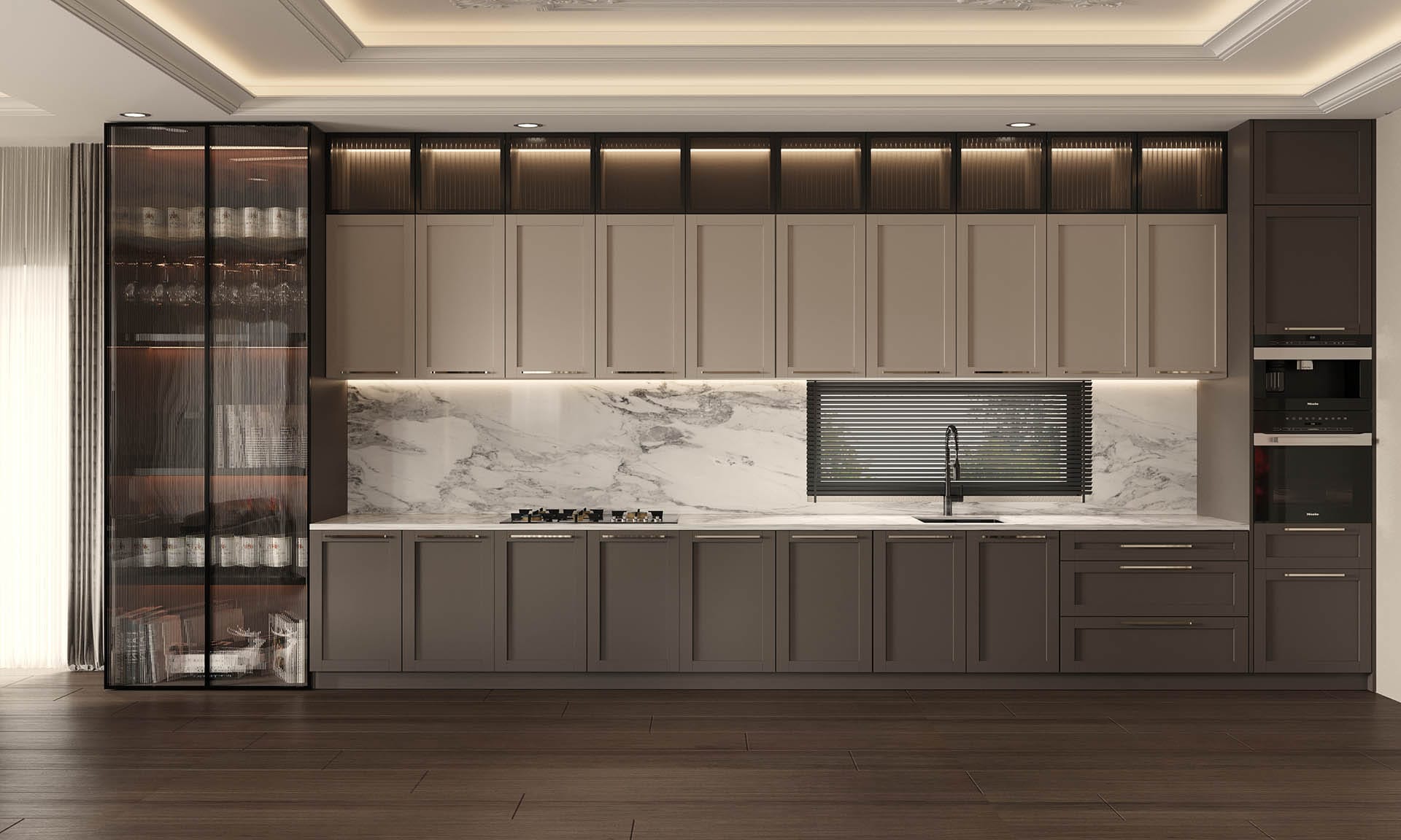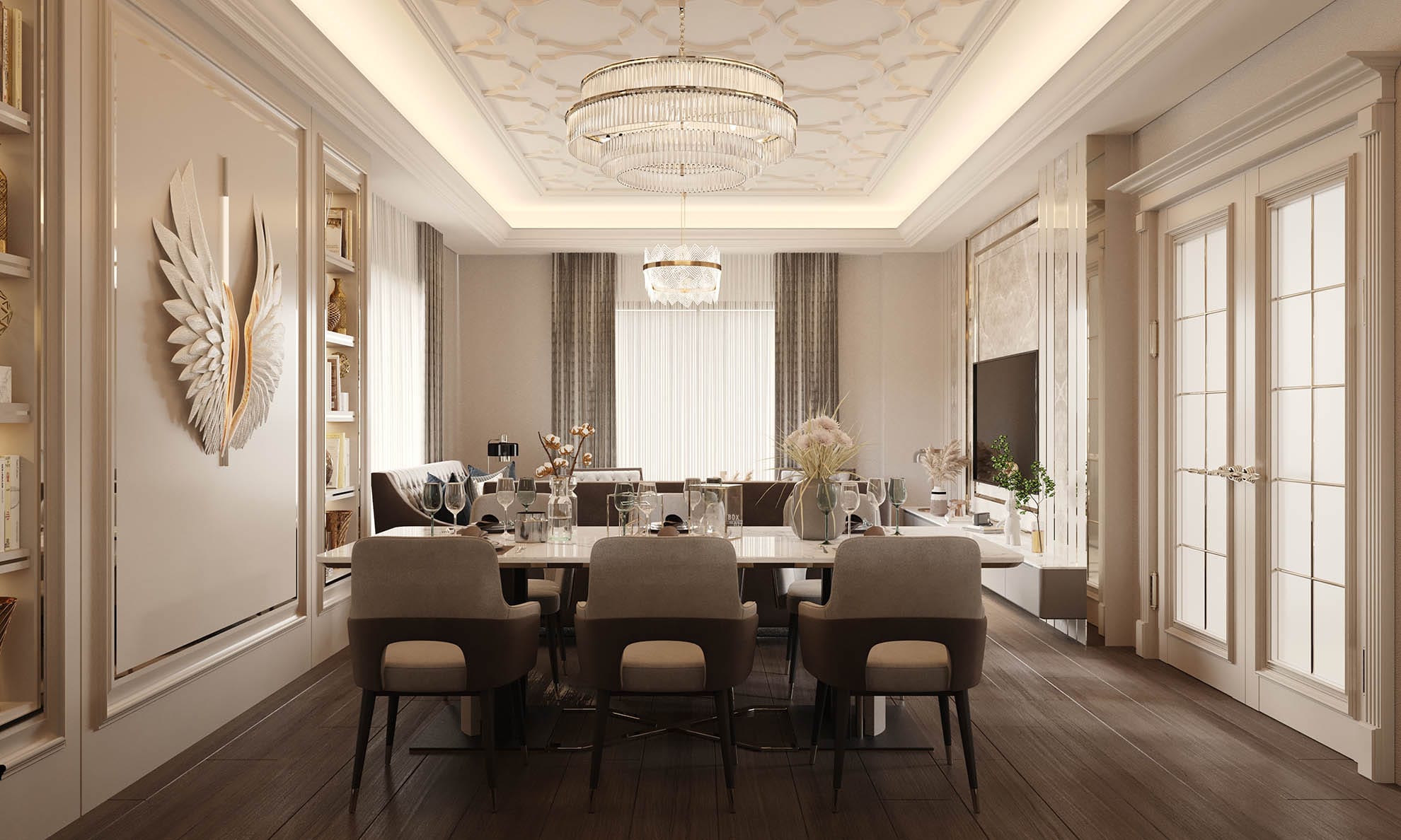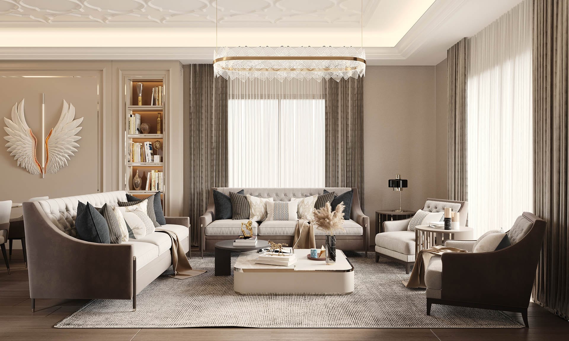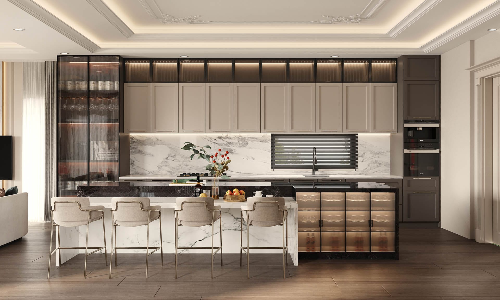 Yaşam alanlarında modern ve konfor odaklı bir yaklaşım benimsenmiştir. Salon bölümünde yumuşak formlu oturma grupları, mermer detaylı TV ünitesi ve doğal ışığı süzen perdeler dengeli bir kompozisyon oluşturur. Açık mutfak tasarımında ise mermer ada tezgâh, cam kapaklı vitrin dolaplar ve gizli aydınlatmalar ön plana çıkmaktadır. Mutfak, hem sosyal kullanım hem de fonksiyonellik açısından güçlü bir planlamaya sahiptir.