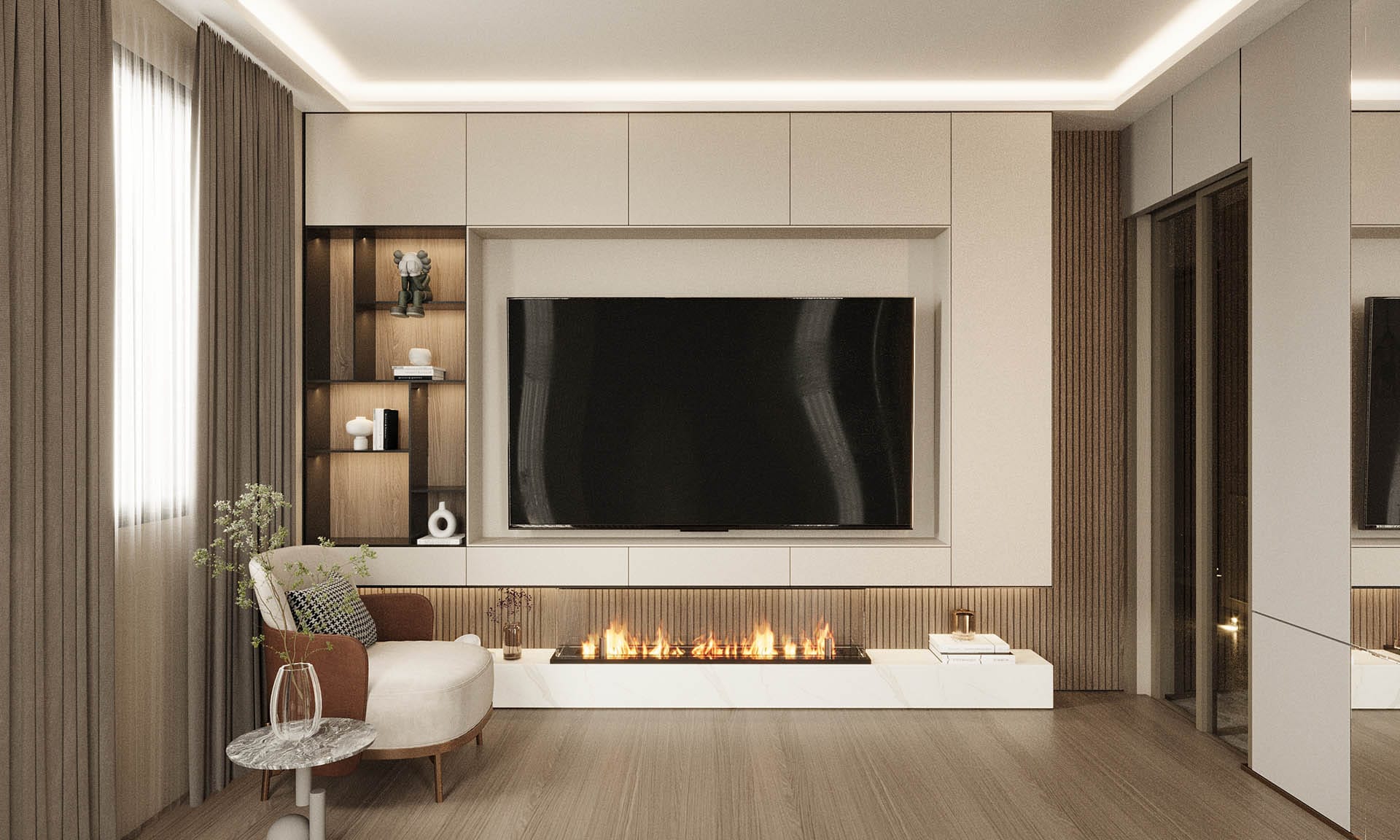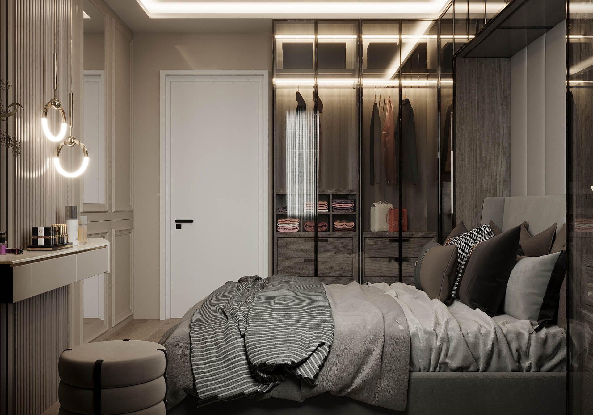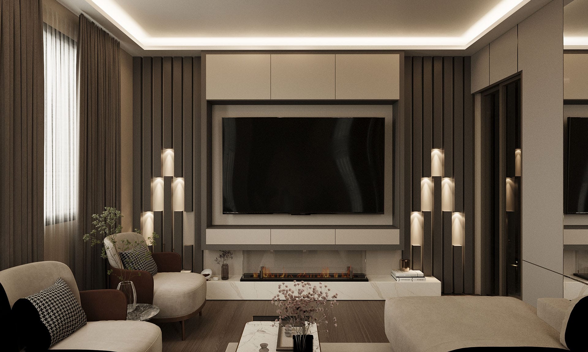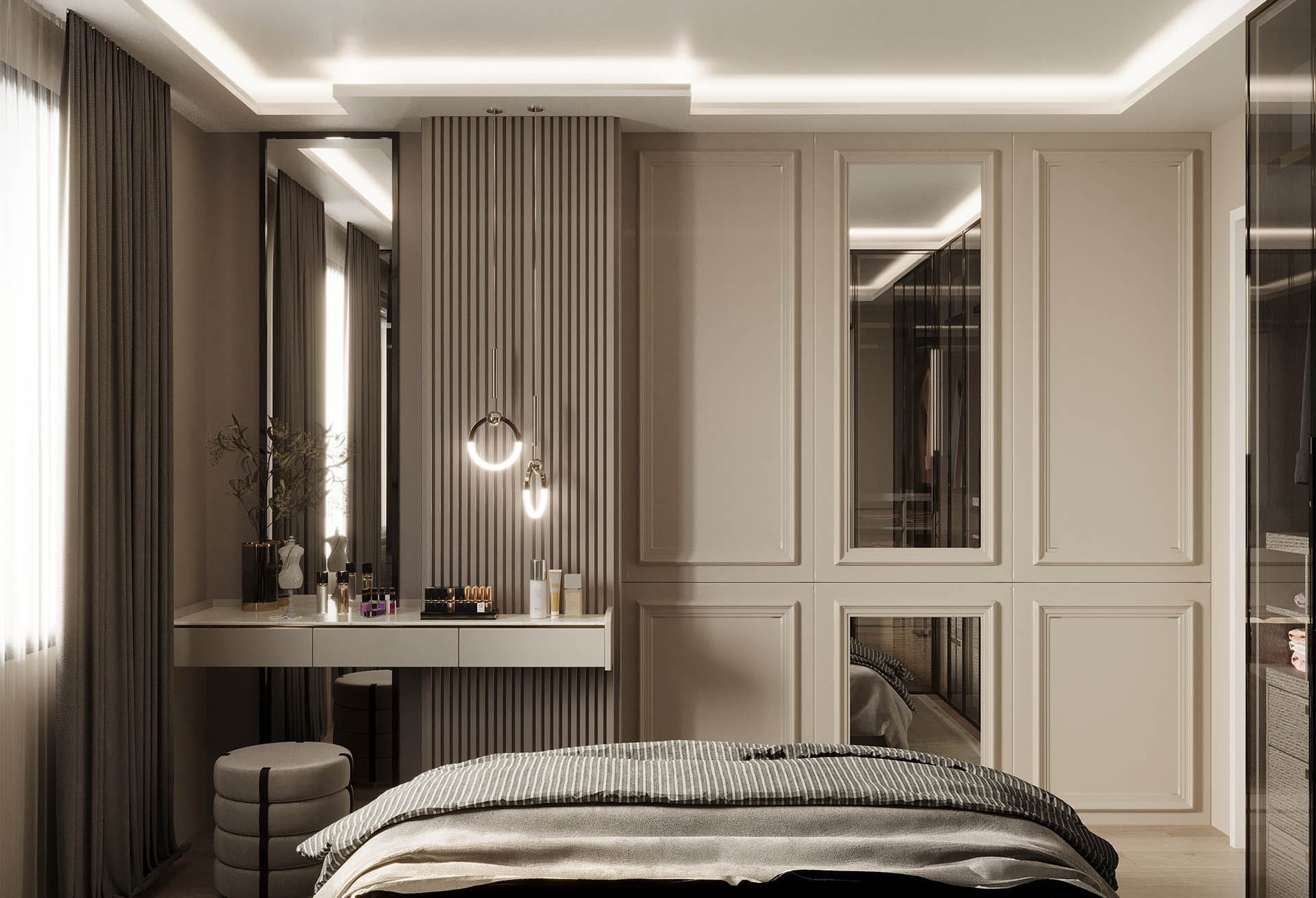 Mekan kurgusunda fonksiyonellik ön planda tutuldu; gömme dolaplar, nişler ve entegre çözümlerle düzenli ve akıcı bir yaşam alanı oluşturuldu. Aydınlatma, projeye özel olarak kurgulandı: gizli LED şeritler ve noktasal ışıklarla dengeli, huzurlu bir atmosfer yaratıldı. Geniş pencere açıklıkları ise doğal ışığı mekana maksimum verimle taşıyor.