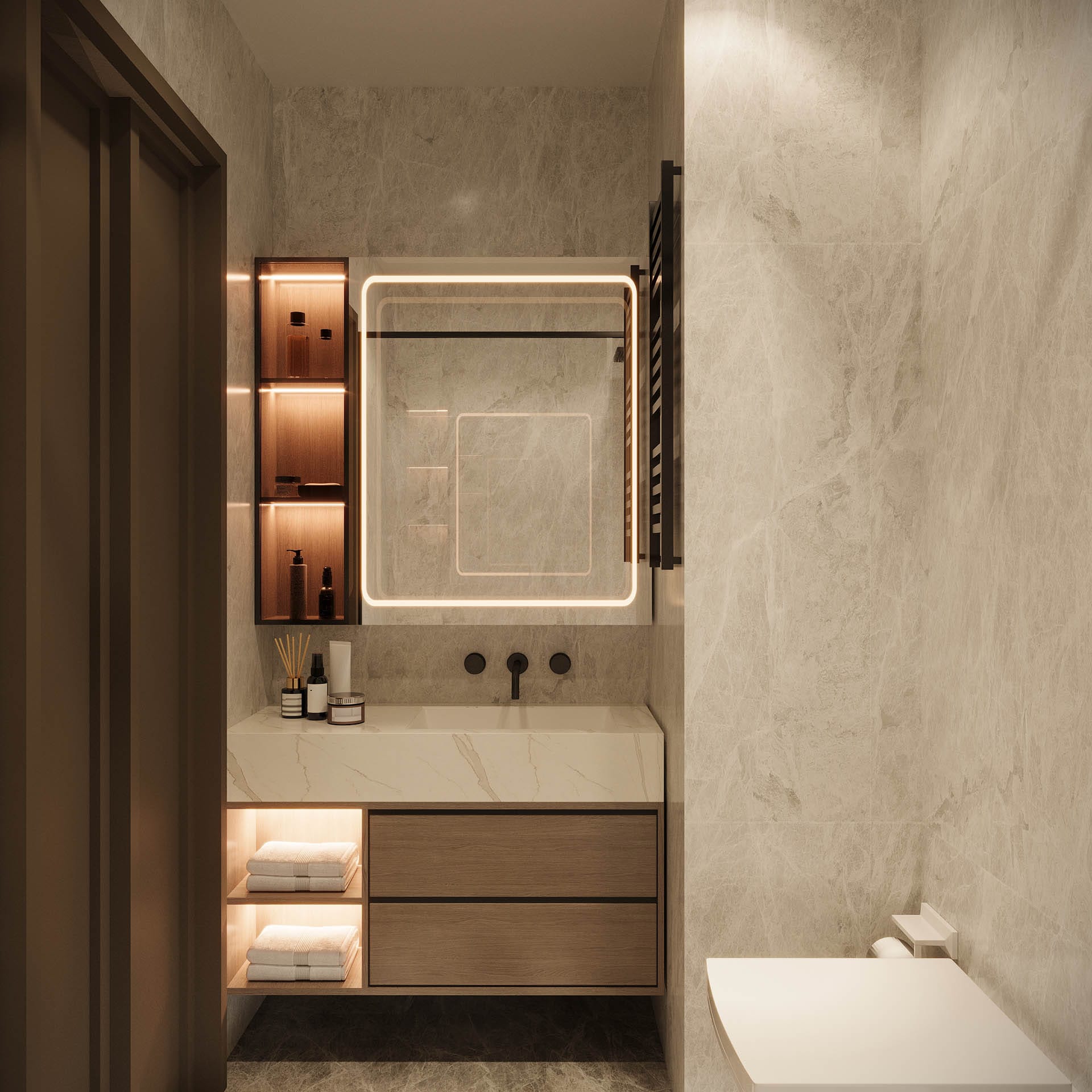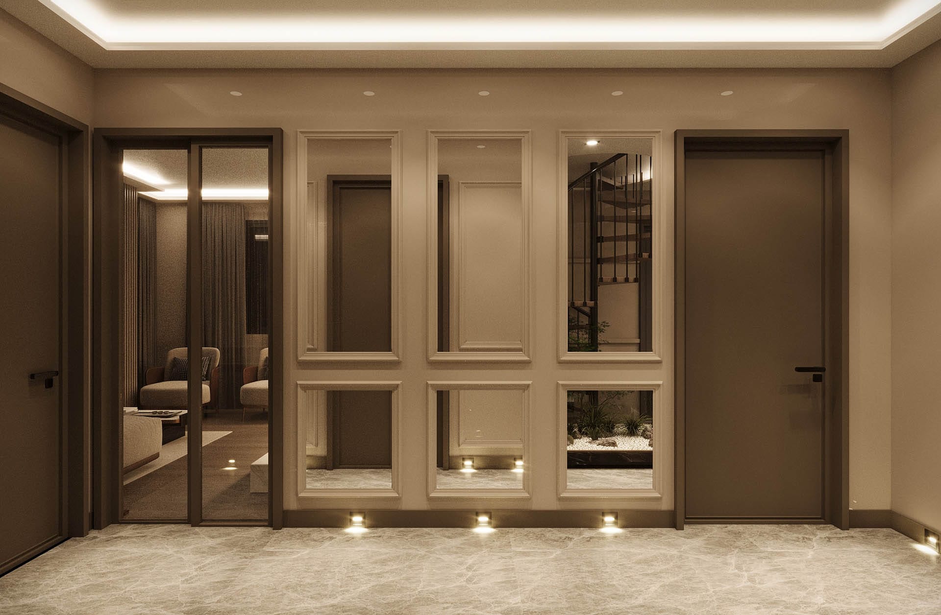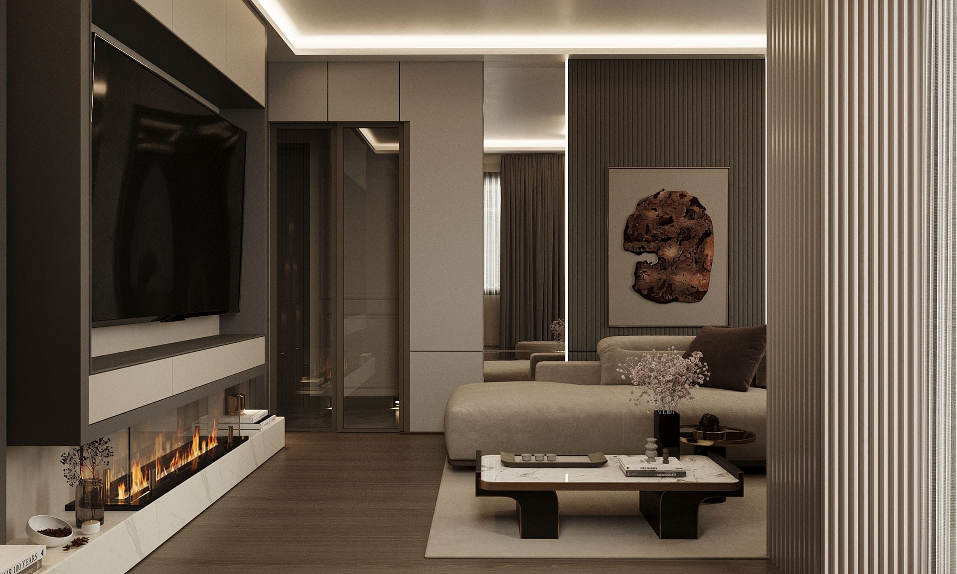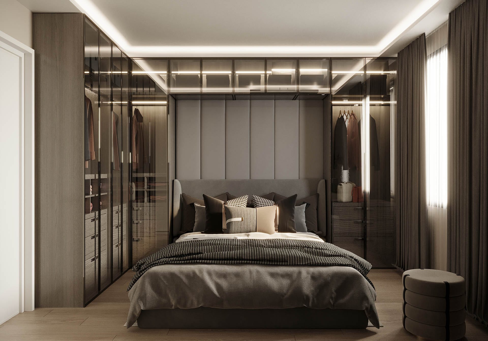 Mekan kurgusunda fonksiyonellik ön planda tutuldu; gömme dolaplar, nişler ve entegre çözümlerle düzenli ve akıcı bir yaşam alanı oluşturuldu. Aydınlatma, projeye özel olarak kurgulandı: gizli LED şeritler ve noktasal ışıklarla dengeli, huzurlu bir atmosfer yaratıldı. Geniş pencere açıklıkları ise doğal ışığı mekana maksimum verimle taşıyor.