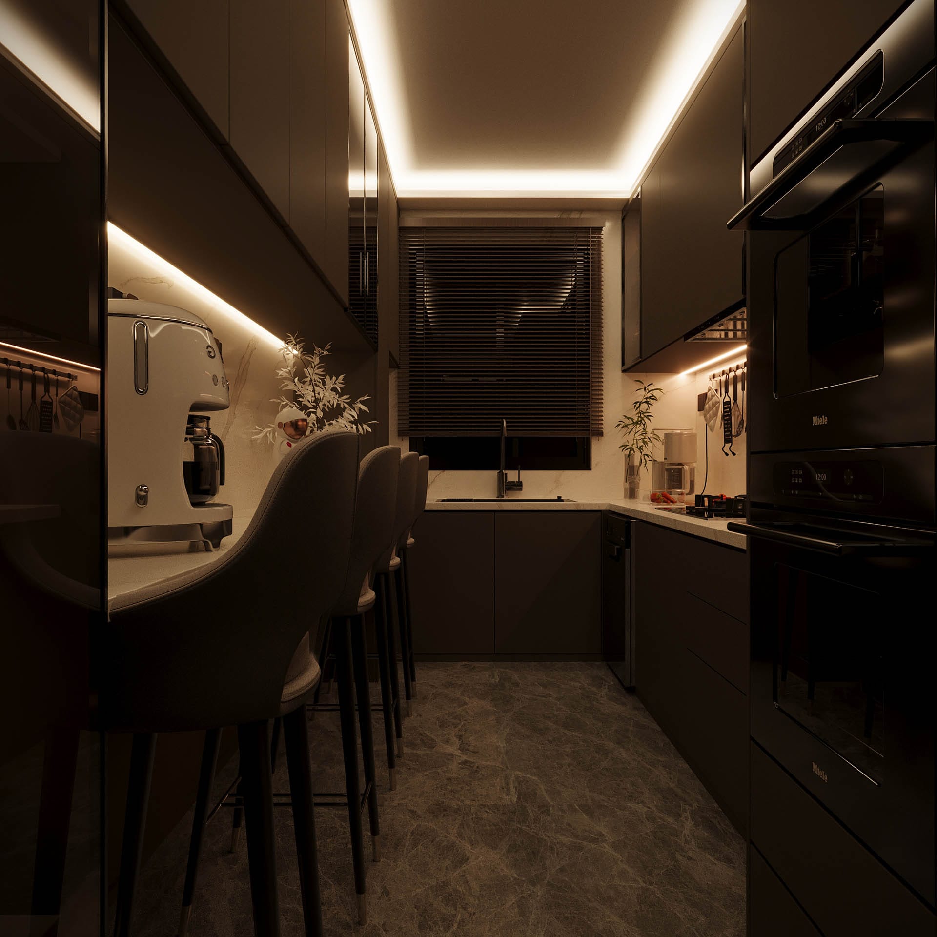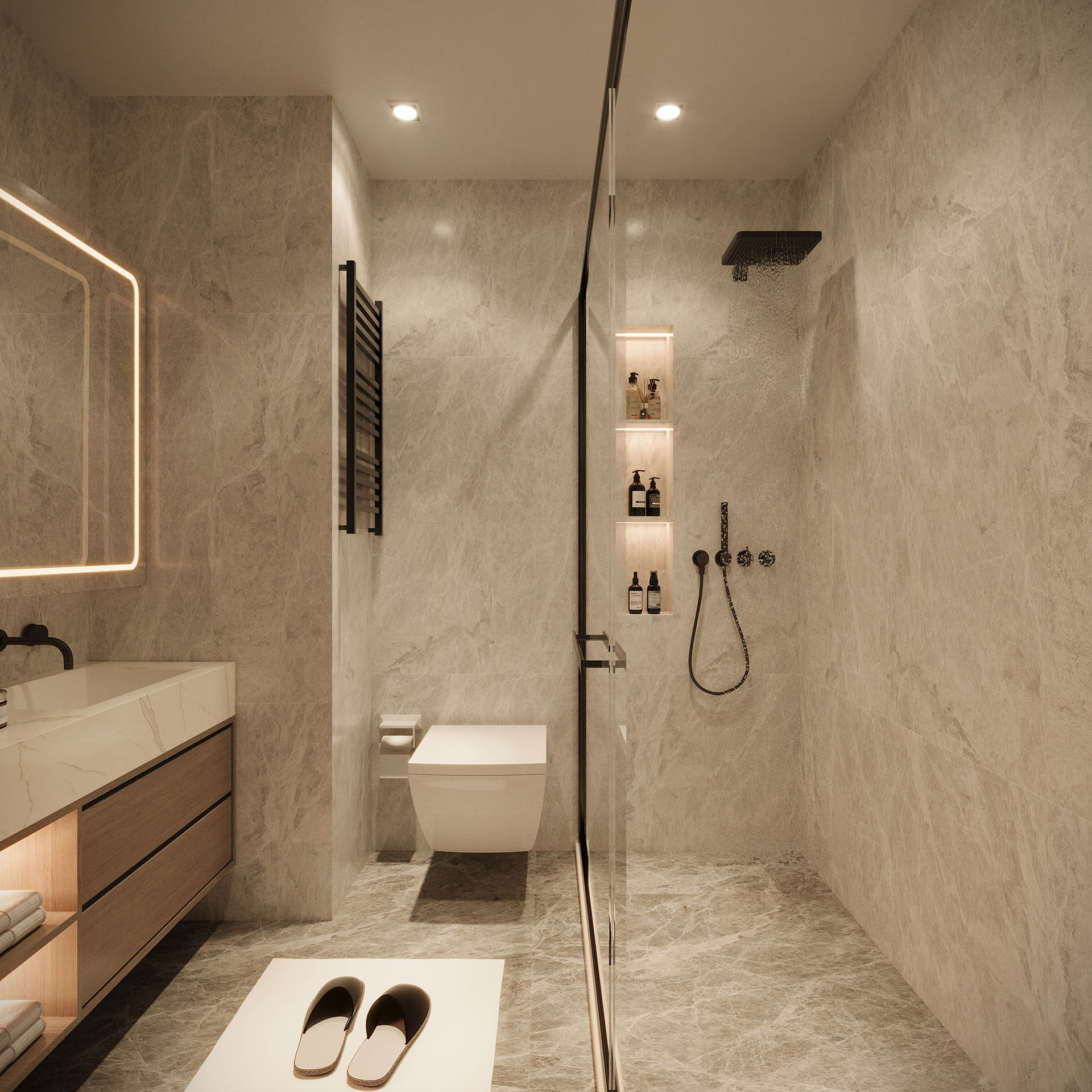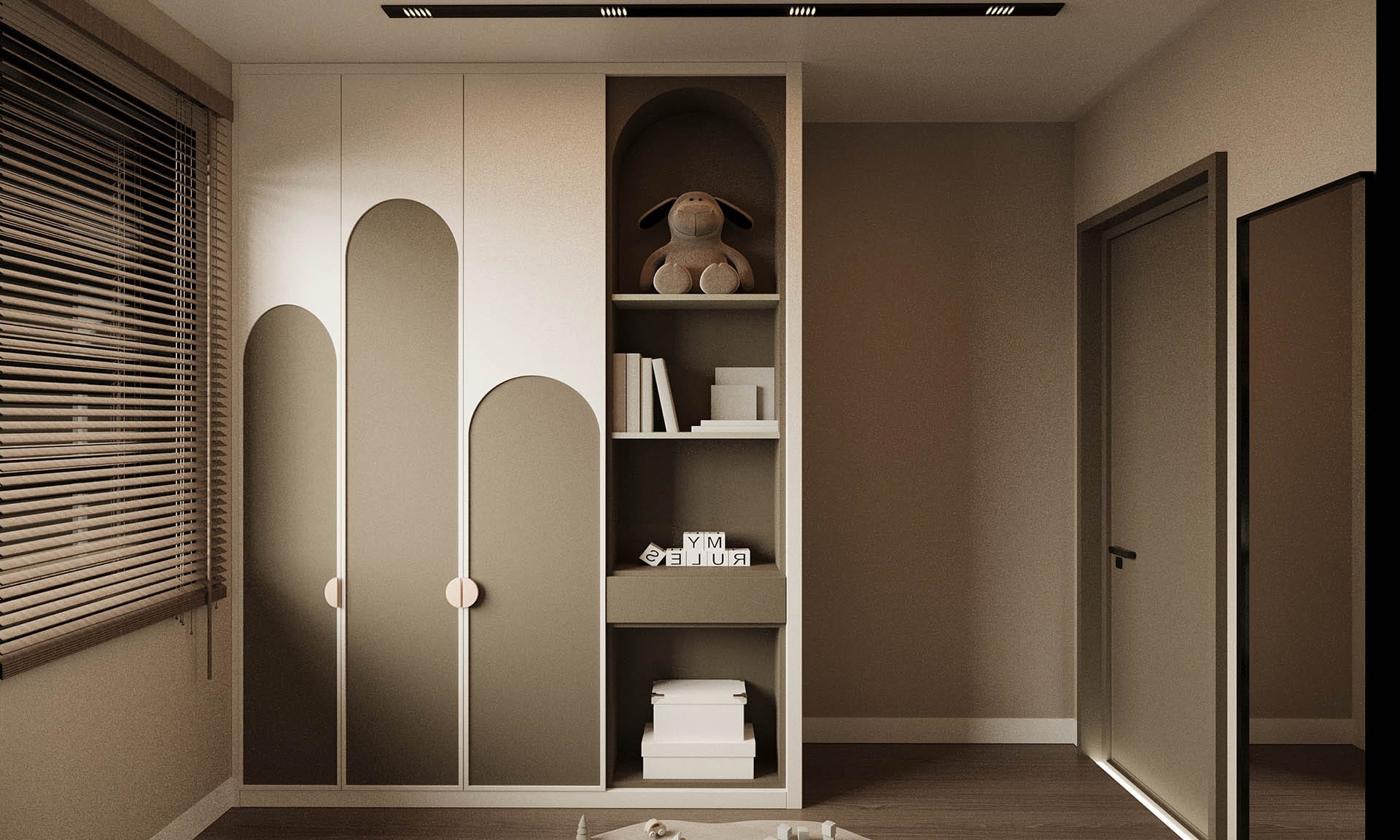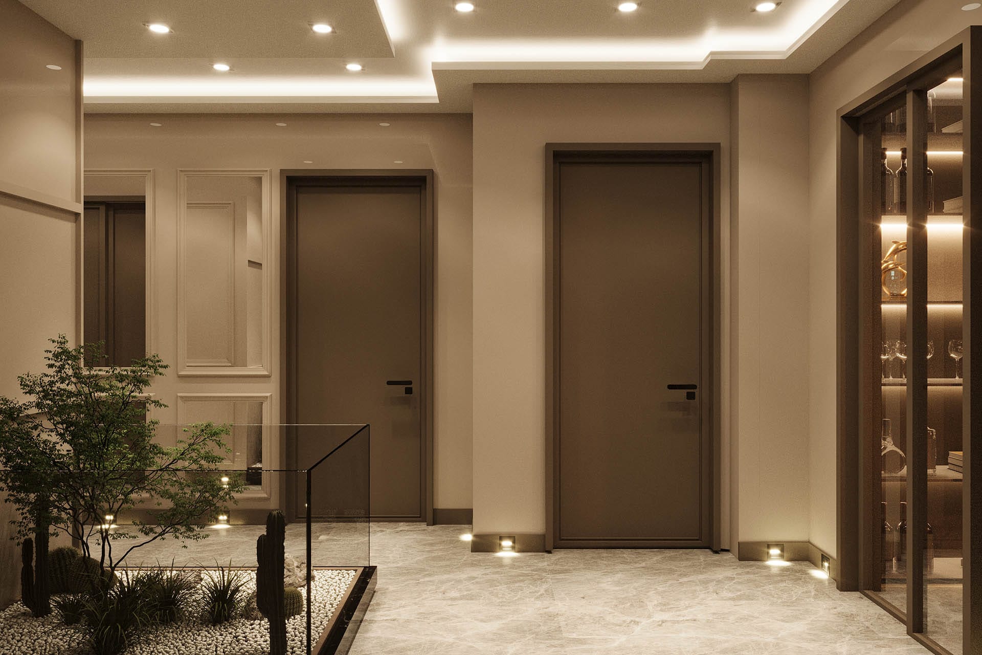 Mekan kurgusunda fonksiyonellik ön planda tutuldu; gömme dolaplar, nişler ve entegre çözümlerle düzenli ve akıcı bir yaşam alanı oluşturuldu. Aydınlatma, projeye özel olarak kurgulandı: gizli LED şeritler ve noktasal ışıklarla dengeli, huzurlu bir atmosfer yaratıldı. Geniş pencere açıklıkları ise doğal ışığı mekana maksimum verimle taşıyor.