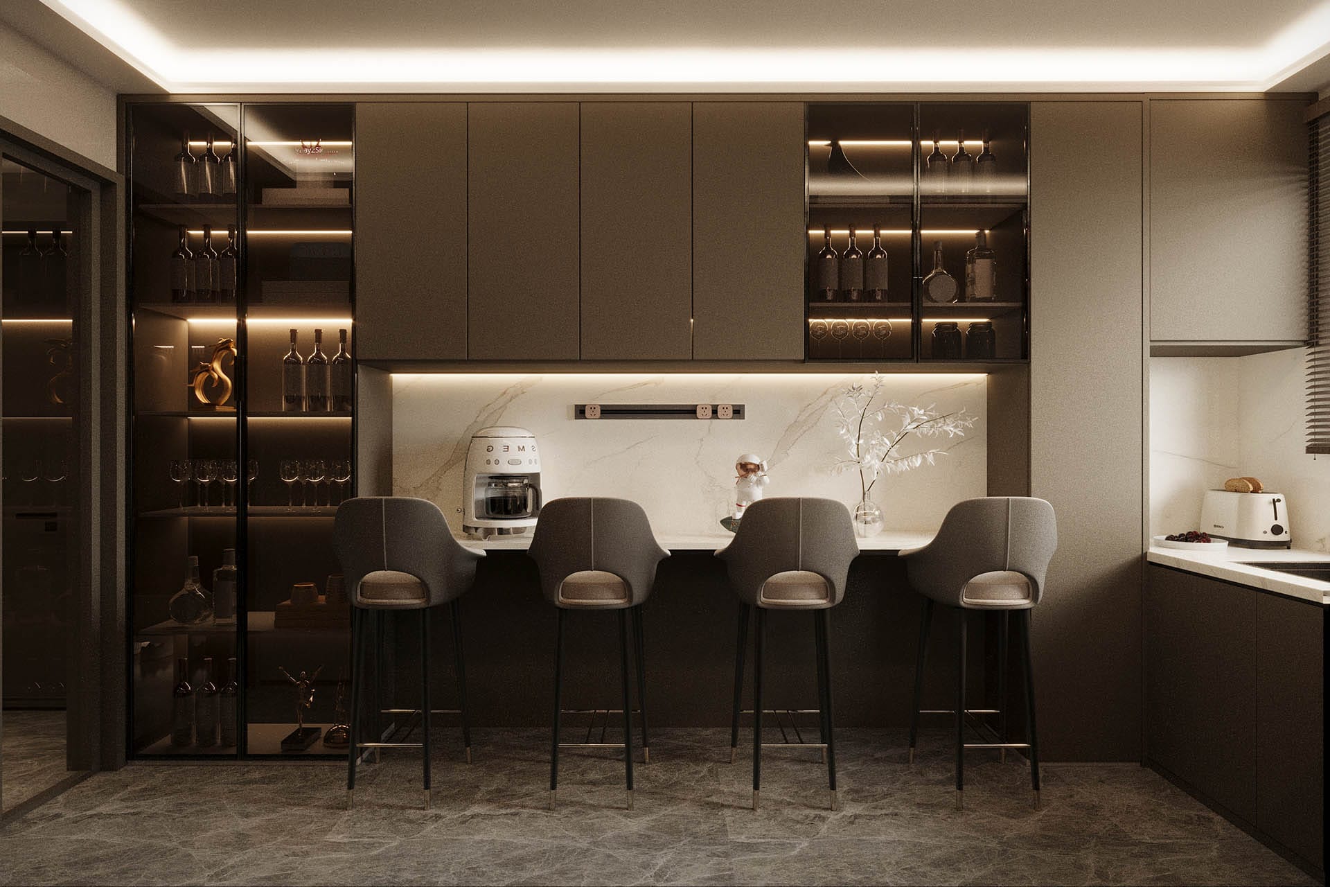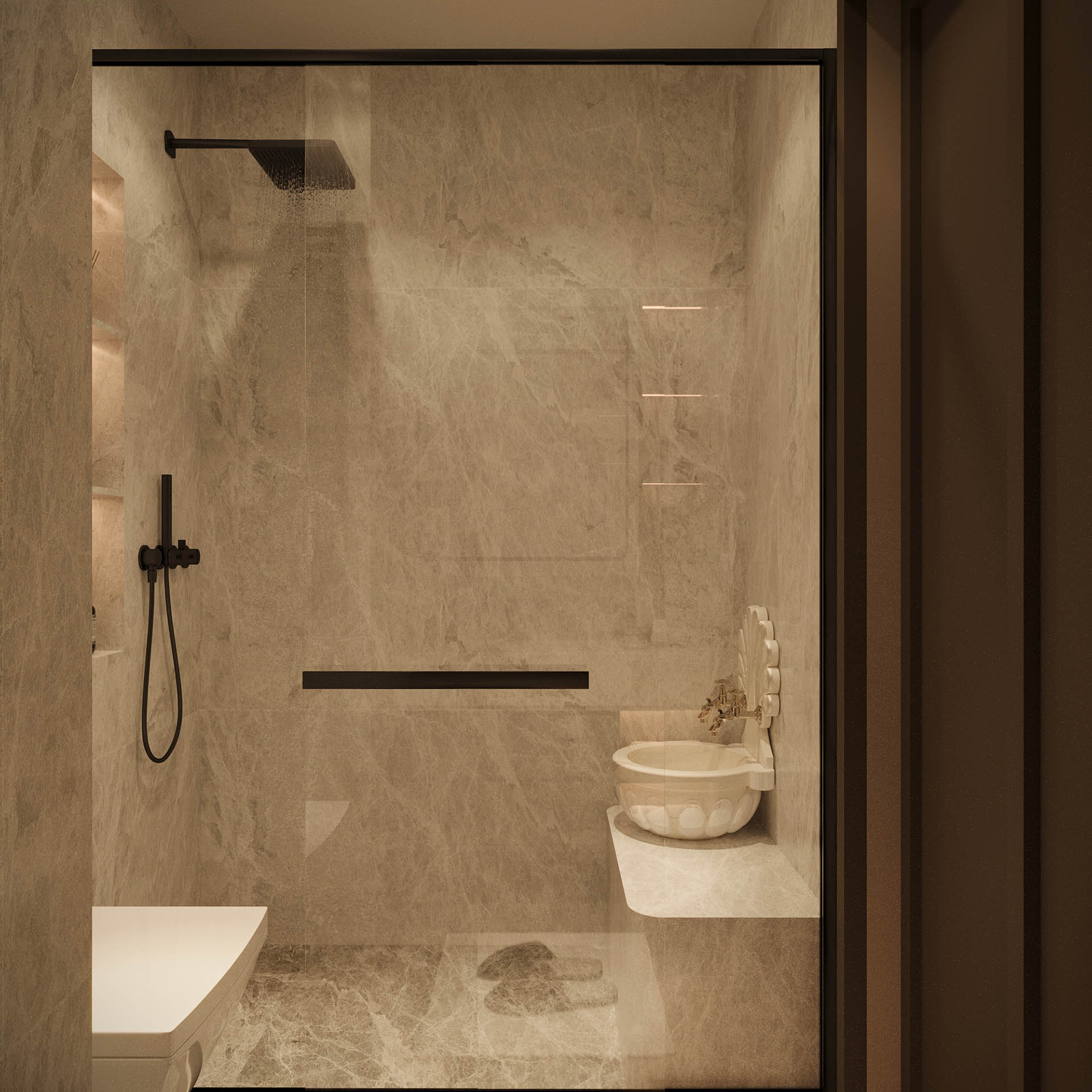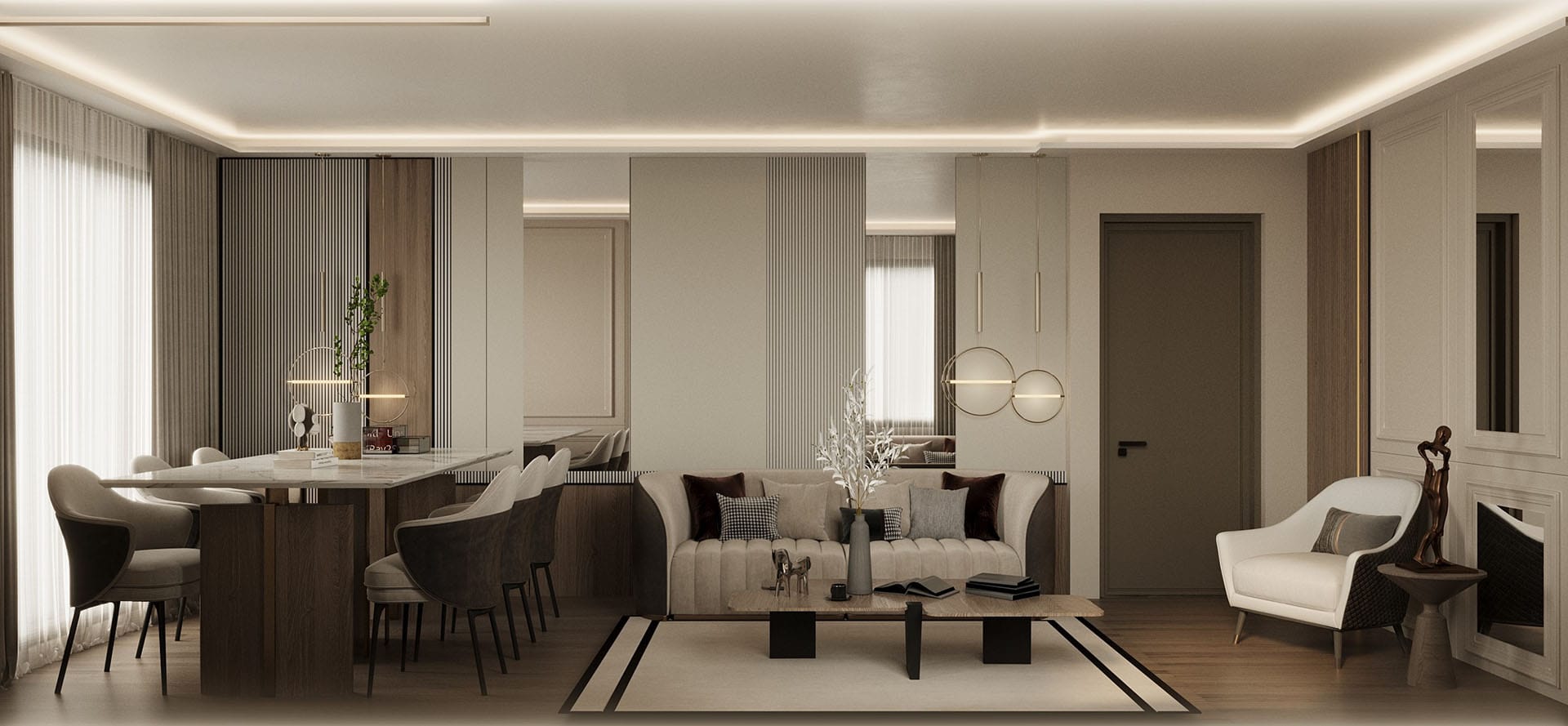 Mutfak ve banyo gibi ıslak hacimlerde ise doğal taş dokuları, mat yüzeyler ve sofistike metal detaylar öne çıkıyor. Genel olarak tasarım, alanlar arası geçişi yumuşak tutarak bütüncül bir akış sağlıyor. Bu proje, şıklığı abartıdan uzak bir estetikle yorumlayan, fonksiyonel ve yaşanabilir bir iç mekan deneyimi sunuyor.