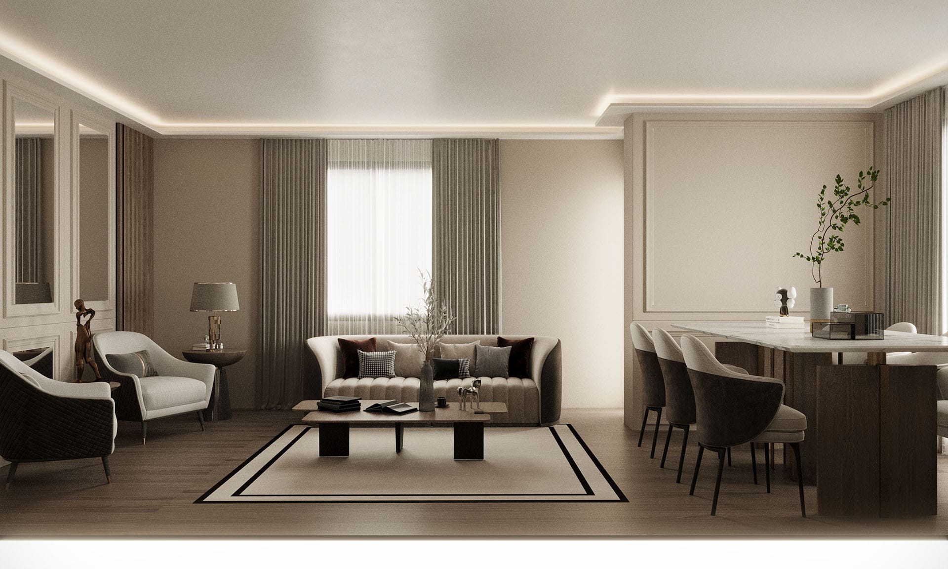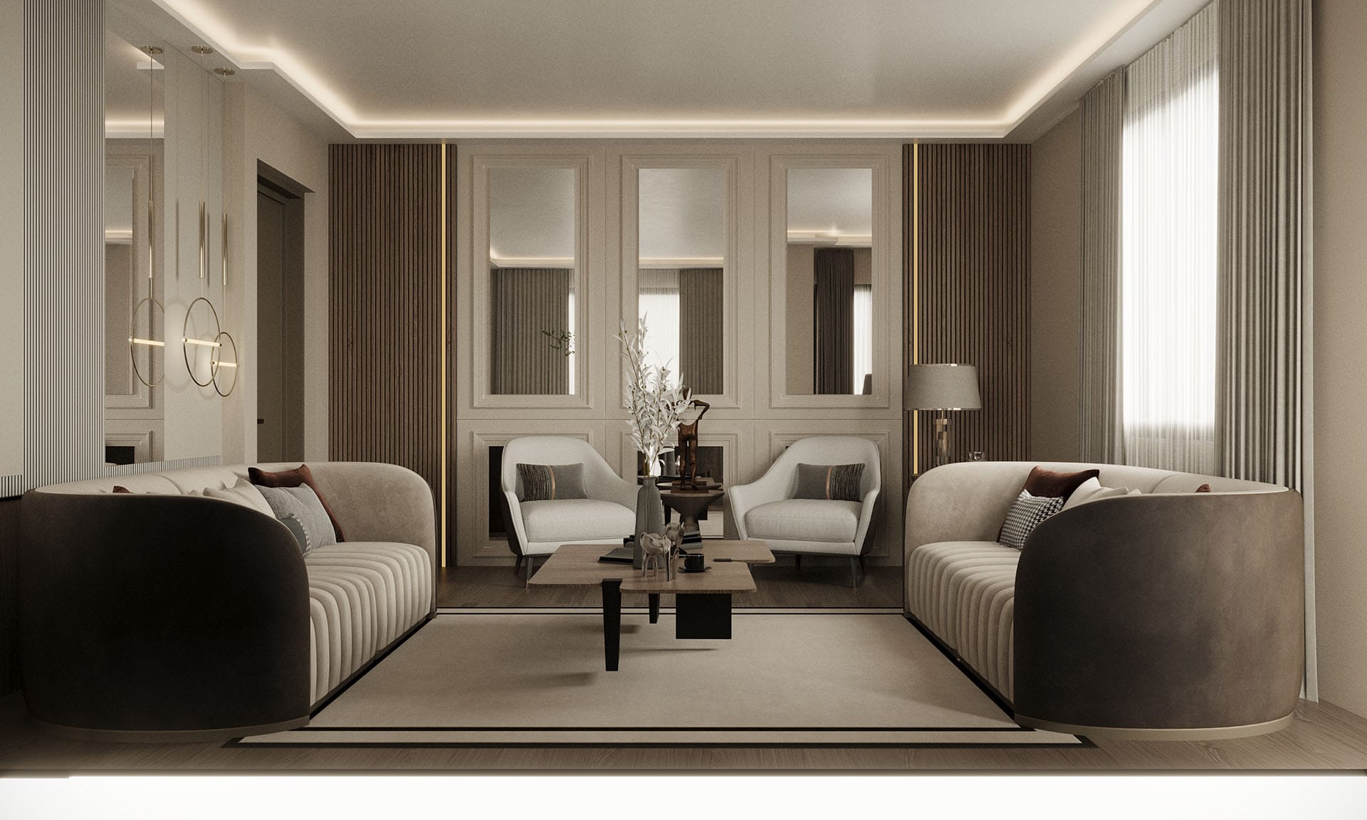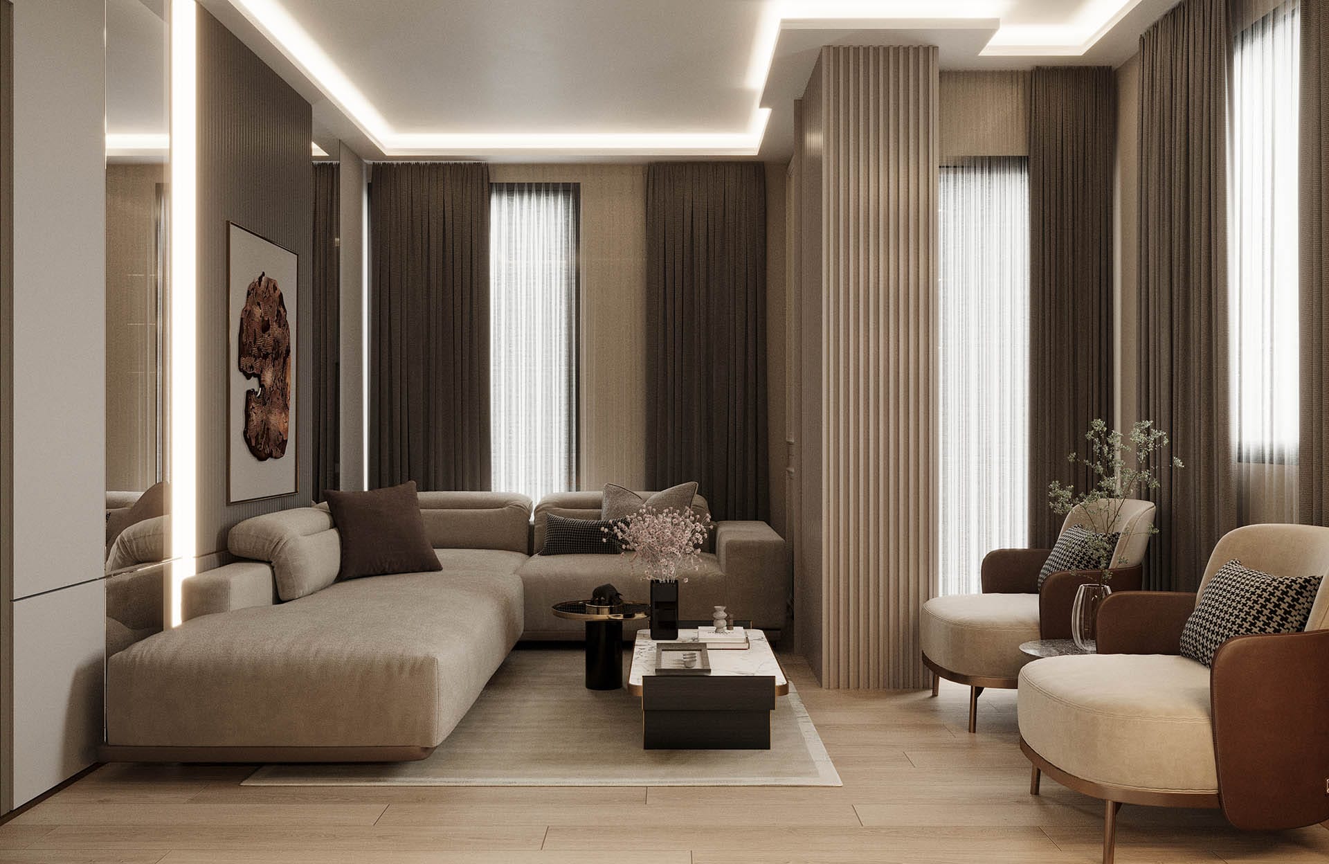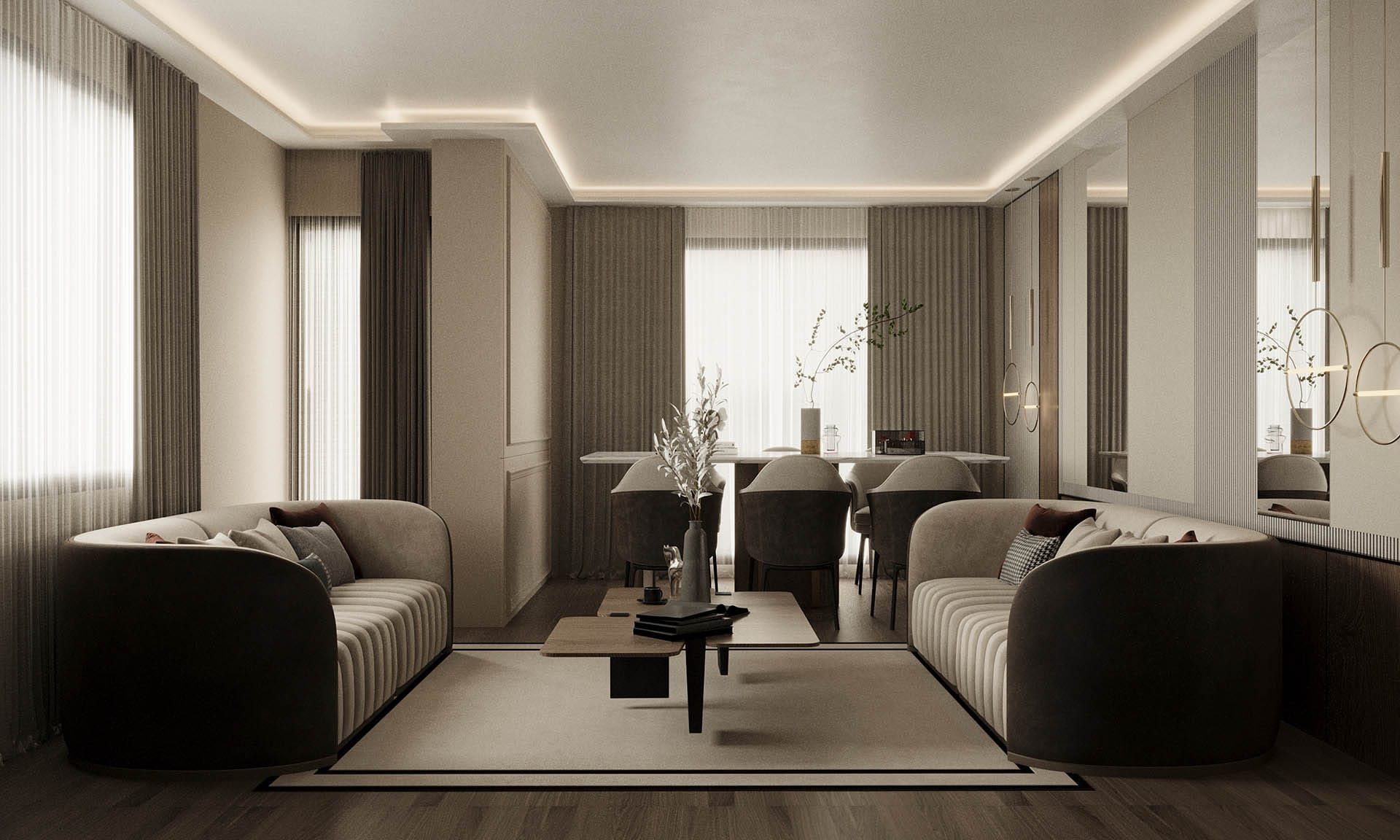 Modern yaşamın konforunu sade ve zarif bir tasarım diliyle buluşturuyor. Projede nötr renk paleti – bej, krem, gri ve doğal ahşap tonları – iç mekanlara sıcaklık ve dinginlik katıyor. Minimalist mobilya seçimleri ve yalın formlar sayesinde ferah, sade ama karakterli bir atmosfer elde edildi.
