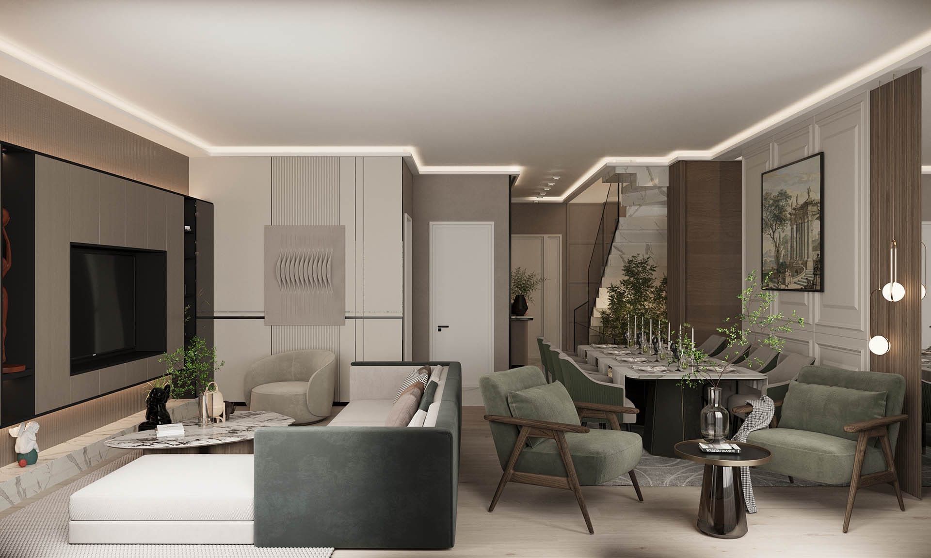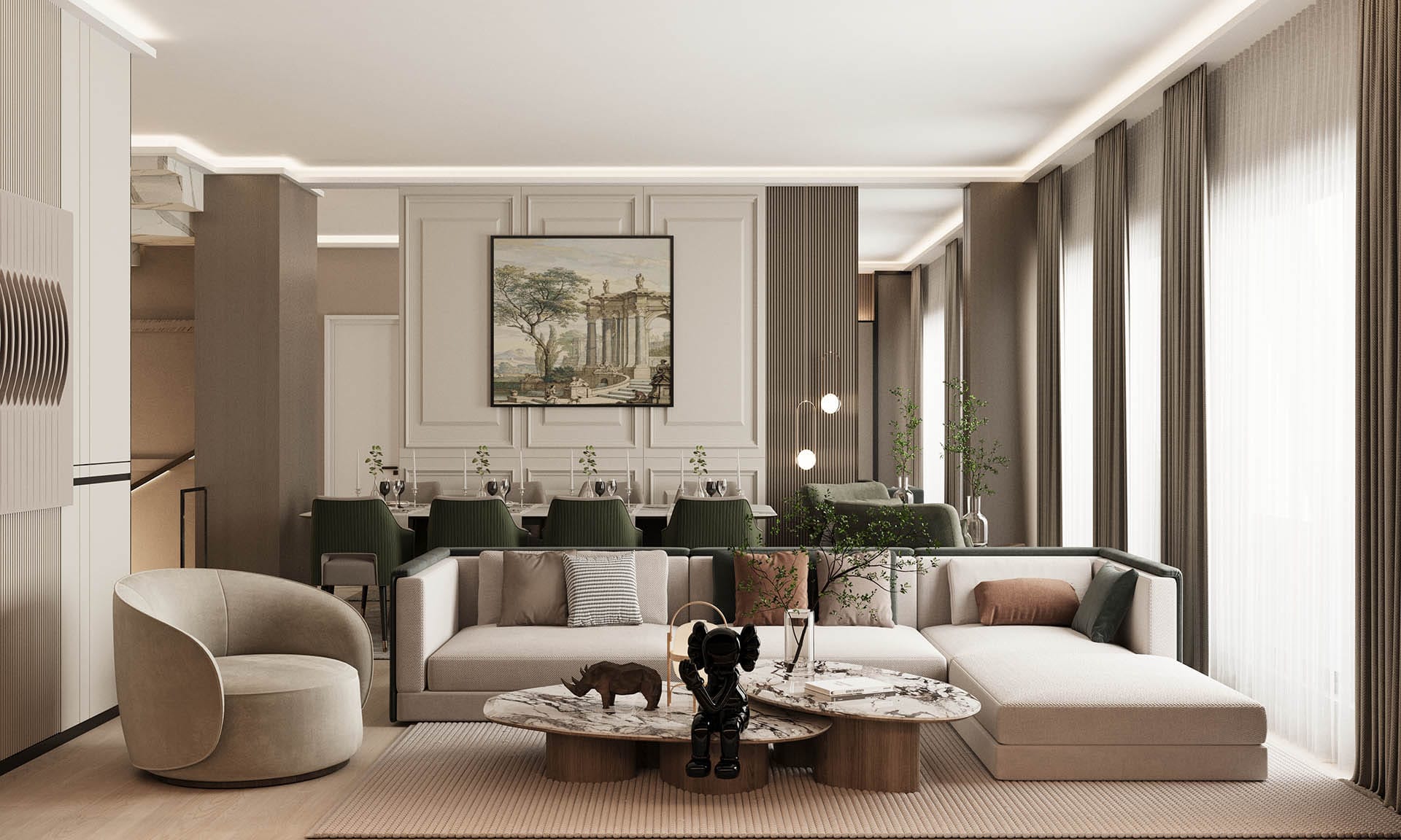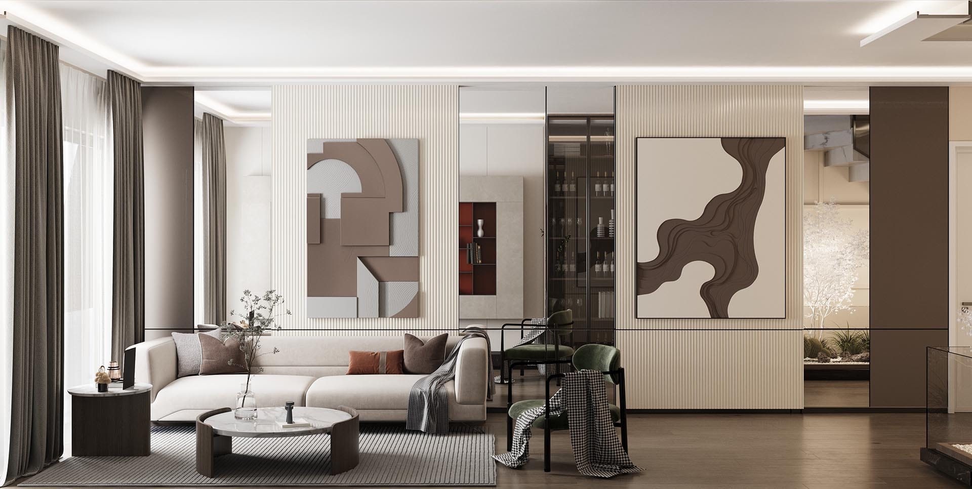 Bu proje için sadelik ve şıklığın uyumu yakalanarak kullanıcıların beklentilerini ve görsel zevklerini karşılayan tasarımlar geliştirildi. Salon ve yemek alanını ayıran şık şömine tasarımıyla ahşabın doğal sıcaklığı, mermerin zarif dokusuyla birleştirildi ve duvar dekorasyonlarıyla mekâna kimliği kazandırıldı. Cam vitrindeki Led ışık detayları ile modern dokunuşlar yapıldı.