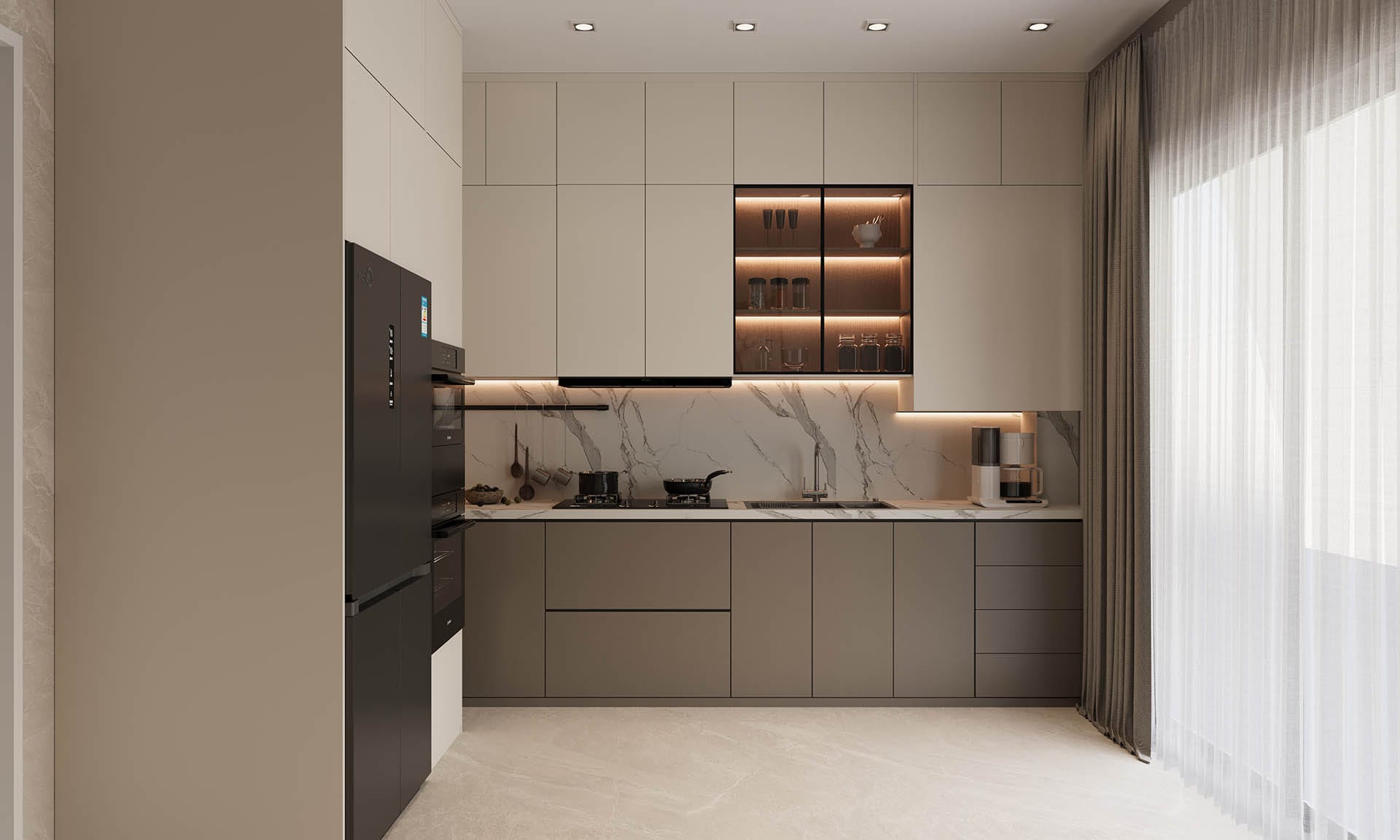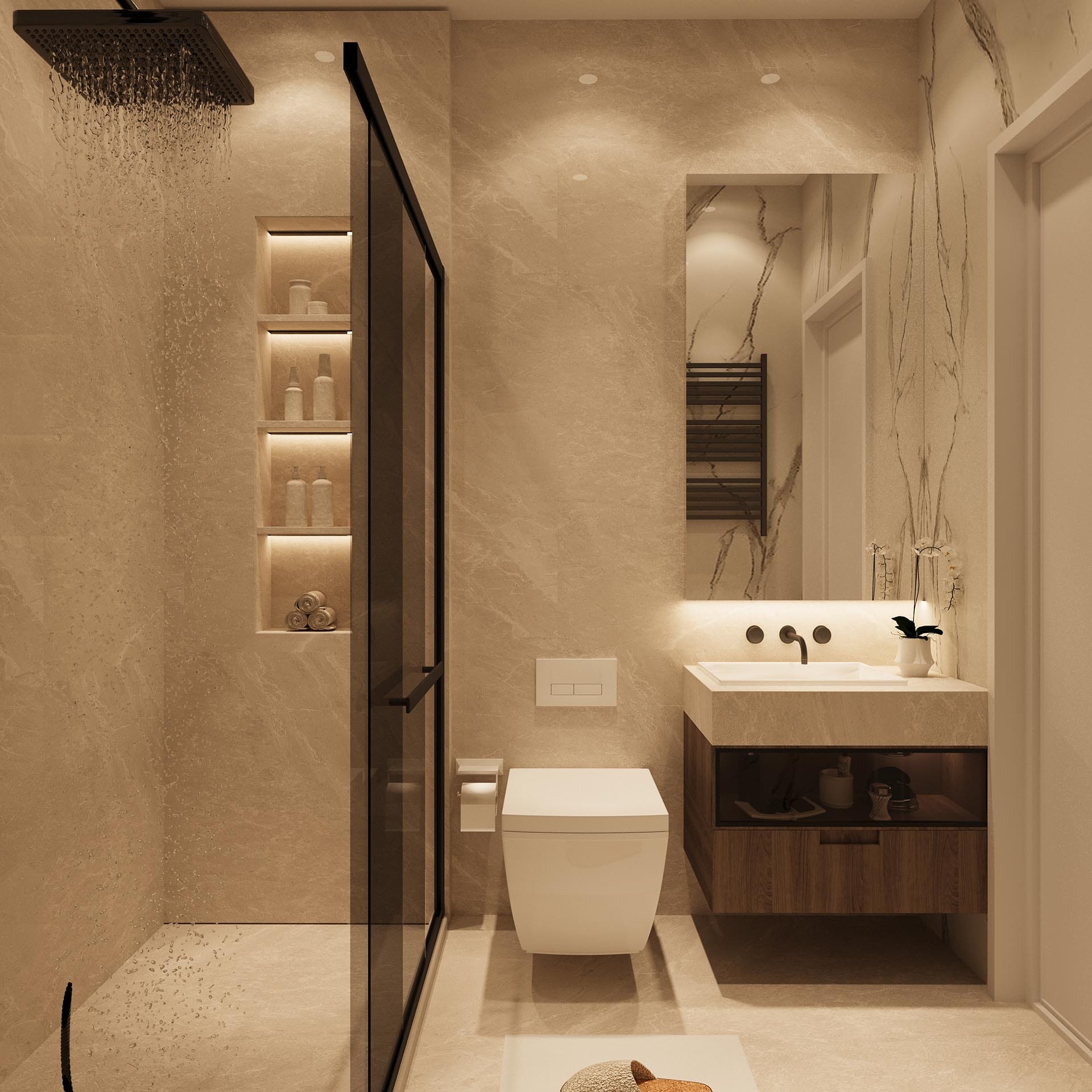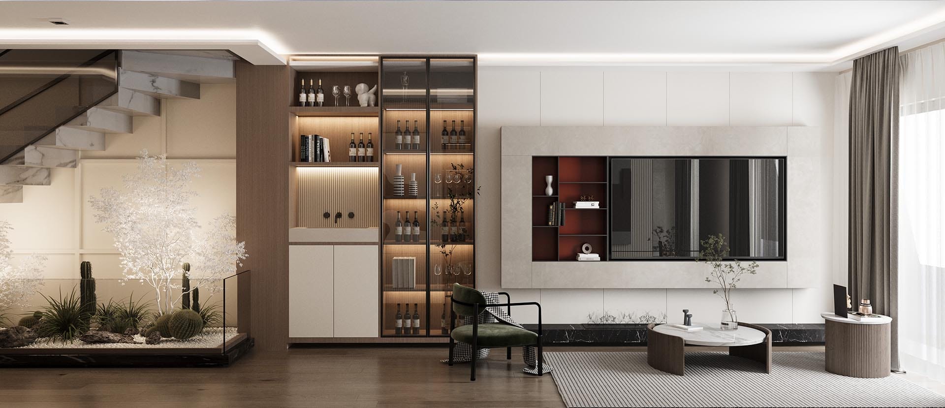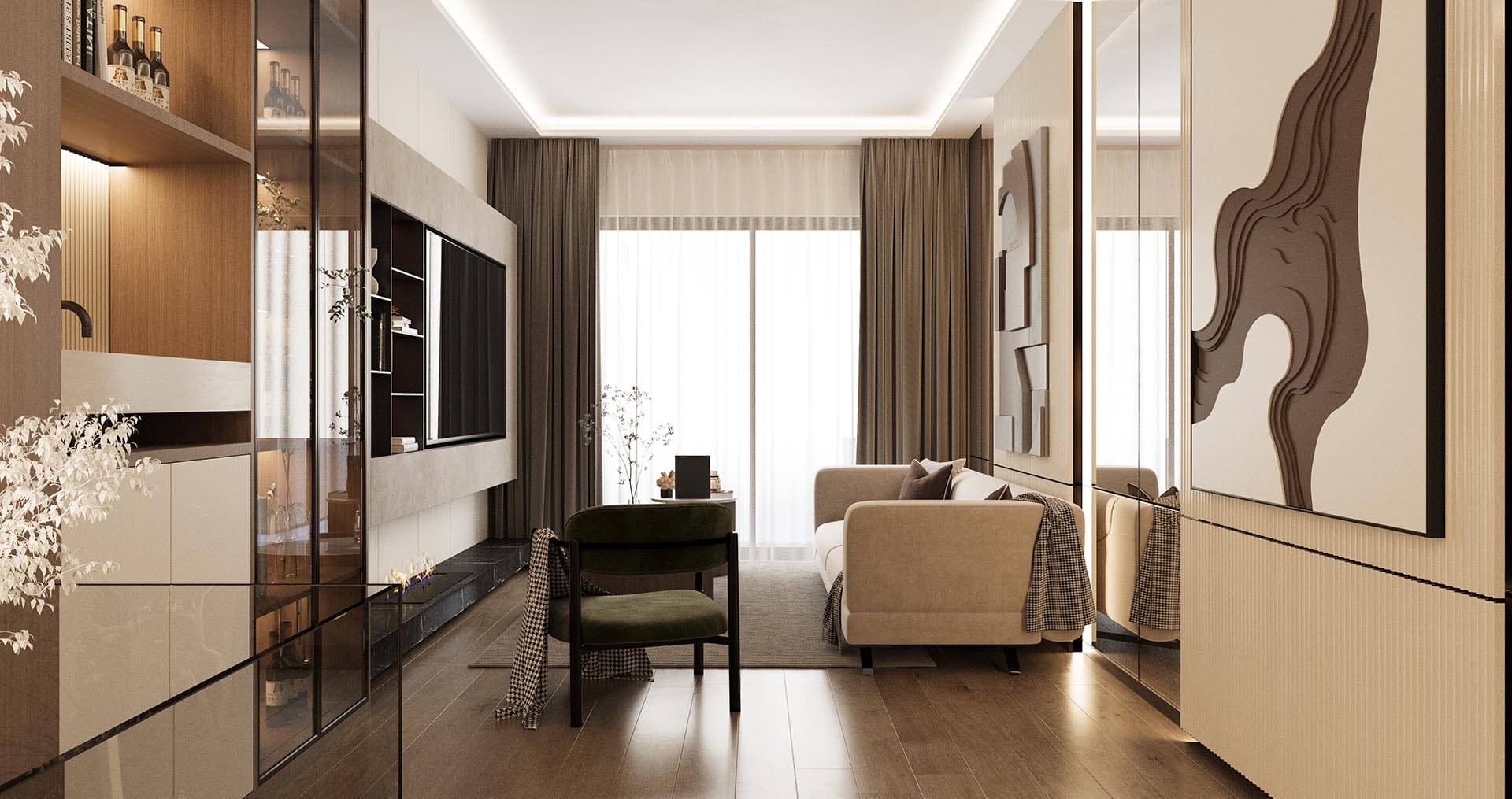 Bu proje için sadelik ve şıklığın uyumu yakalanarak kullanıcıların beklentilerini ve görsel zevklerini karşılayan tasarımlar geliştirildi. Salon ve yemek alanını ayıran şık şömine tasarımıyla ahşabın doğal sıcaklığı, mermerin zarif dokusuyla birleştirildi ve duvar dekorasyonlarıyla mekâna kimliği kazandırıldı. Cam vitrindeki Led ışık detayları ile modern dokunuşlar yapıldı.