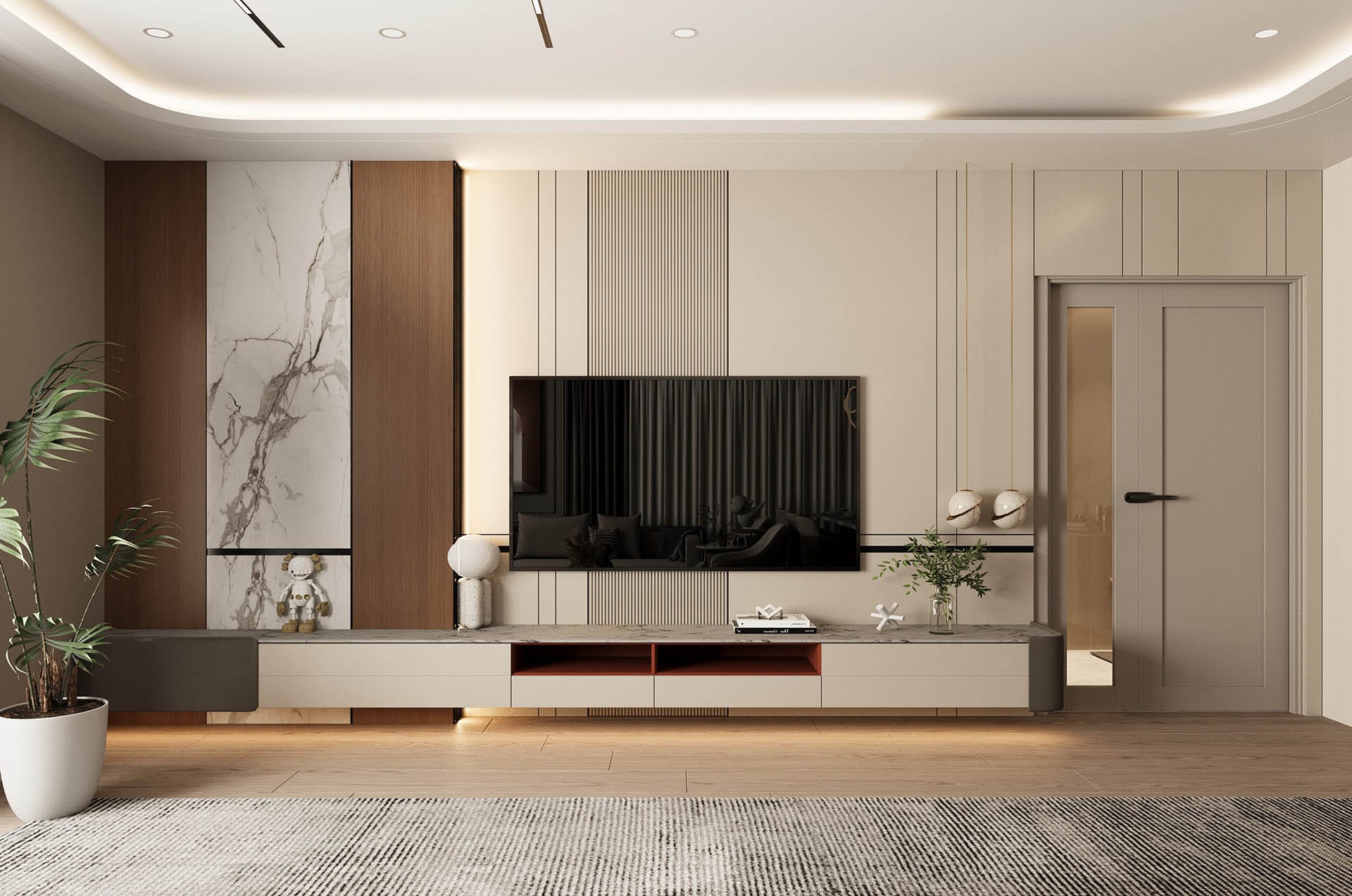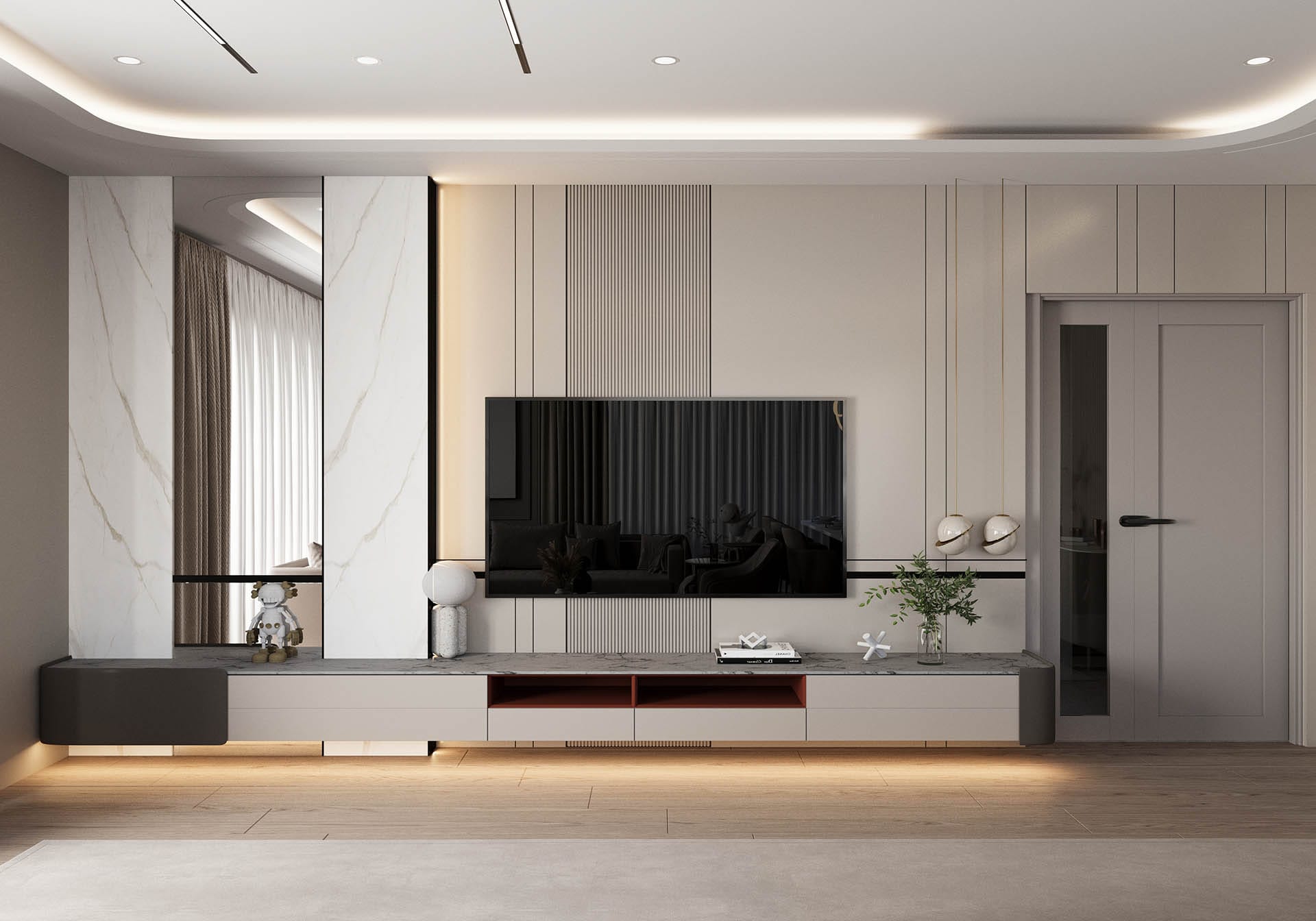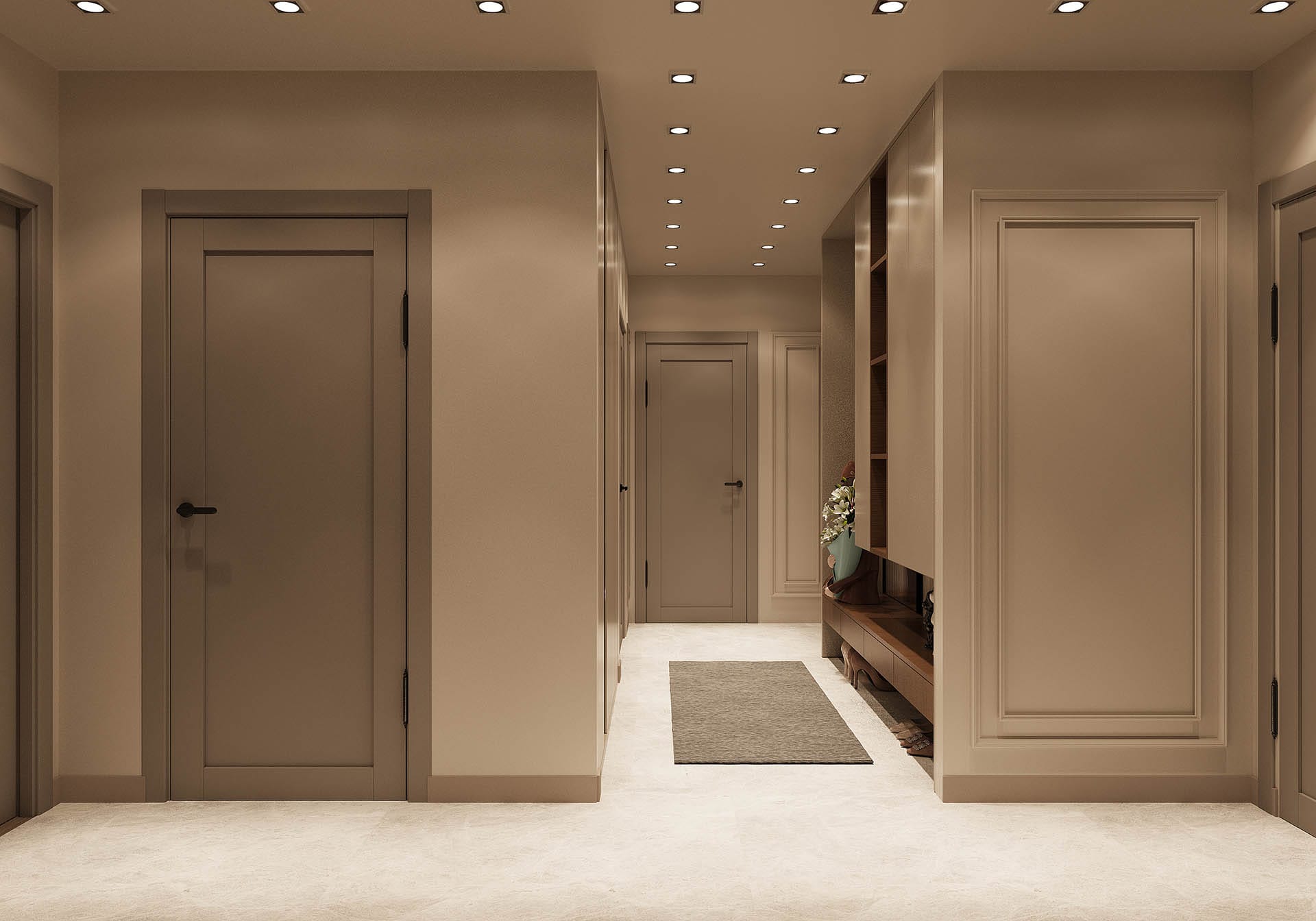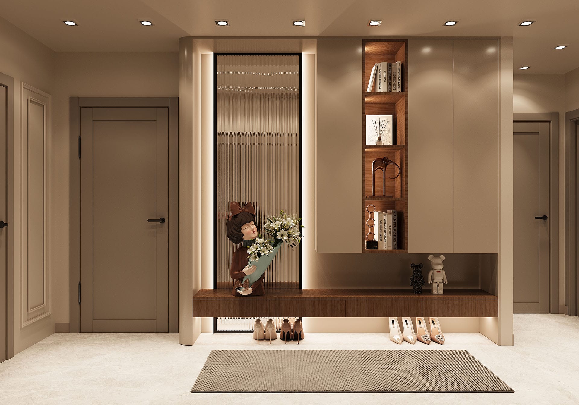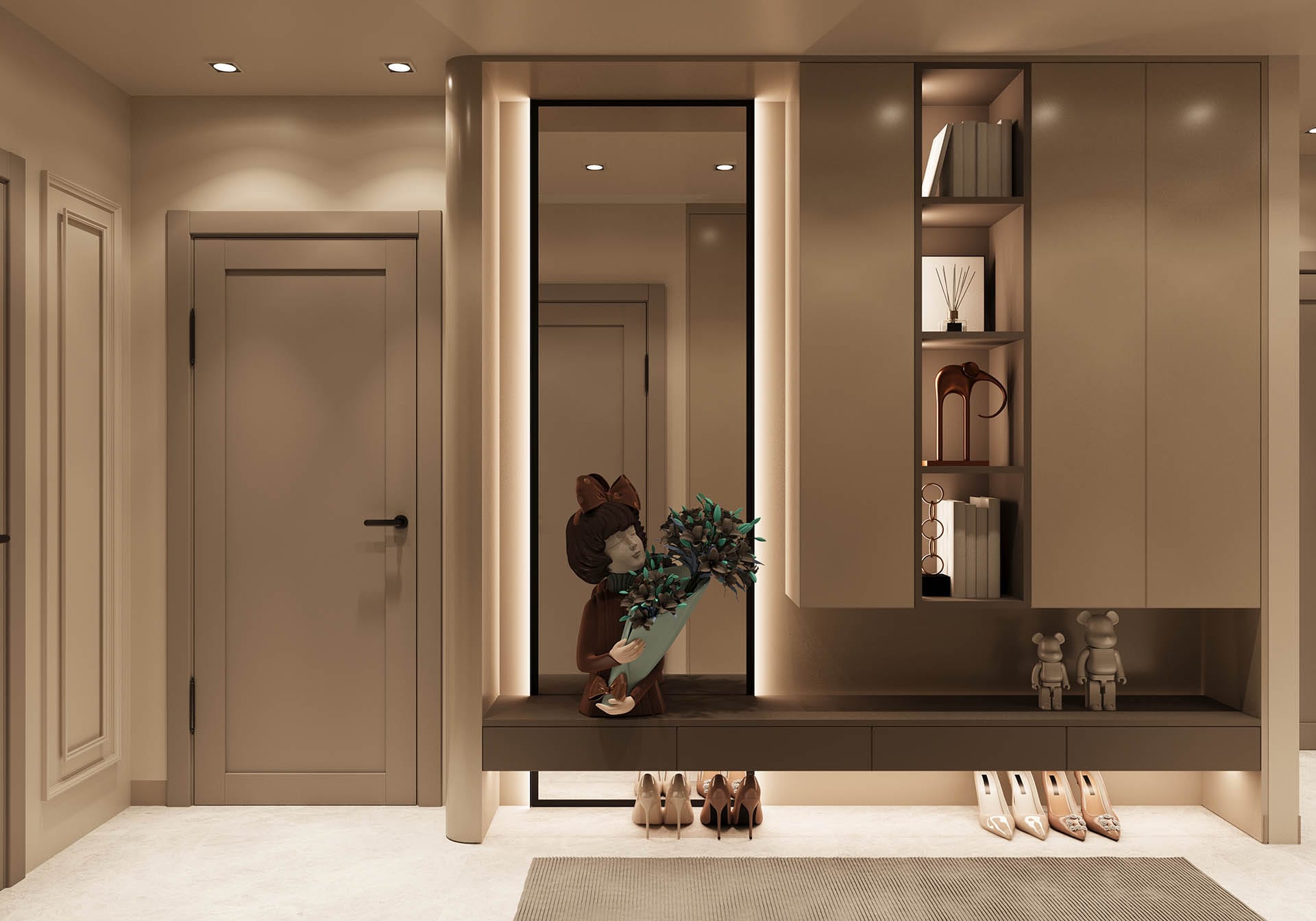 Y.D. Florya Konut Projesi'nin Modern yaşamın her yönünü tasarımla birleştirerek zarif ve fonksiyonel yaşam alanları yaratıyor. İlk görselde, minimalist bir antre tasarımı öne çıkıyor; düzgün hatlara sahip dolaplar, ışıklandırmalar ve ince detaylar modern bir atmosfer oluşturuyor. Tasarımda kullanılan sıcak tonlar, ahşap detaylar ve zarif dekoratif objeler, mekâna samimi ve davetkâr bir hava katıyor.