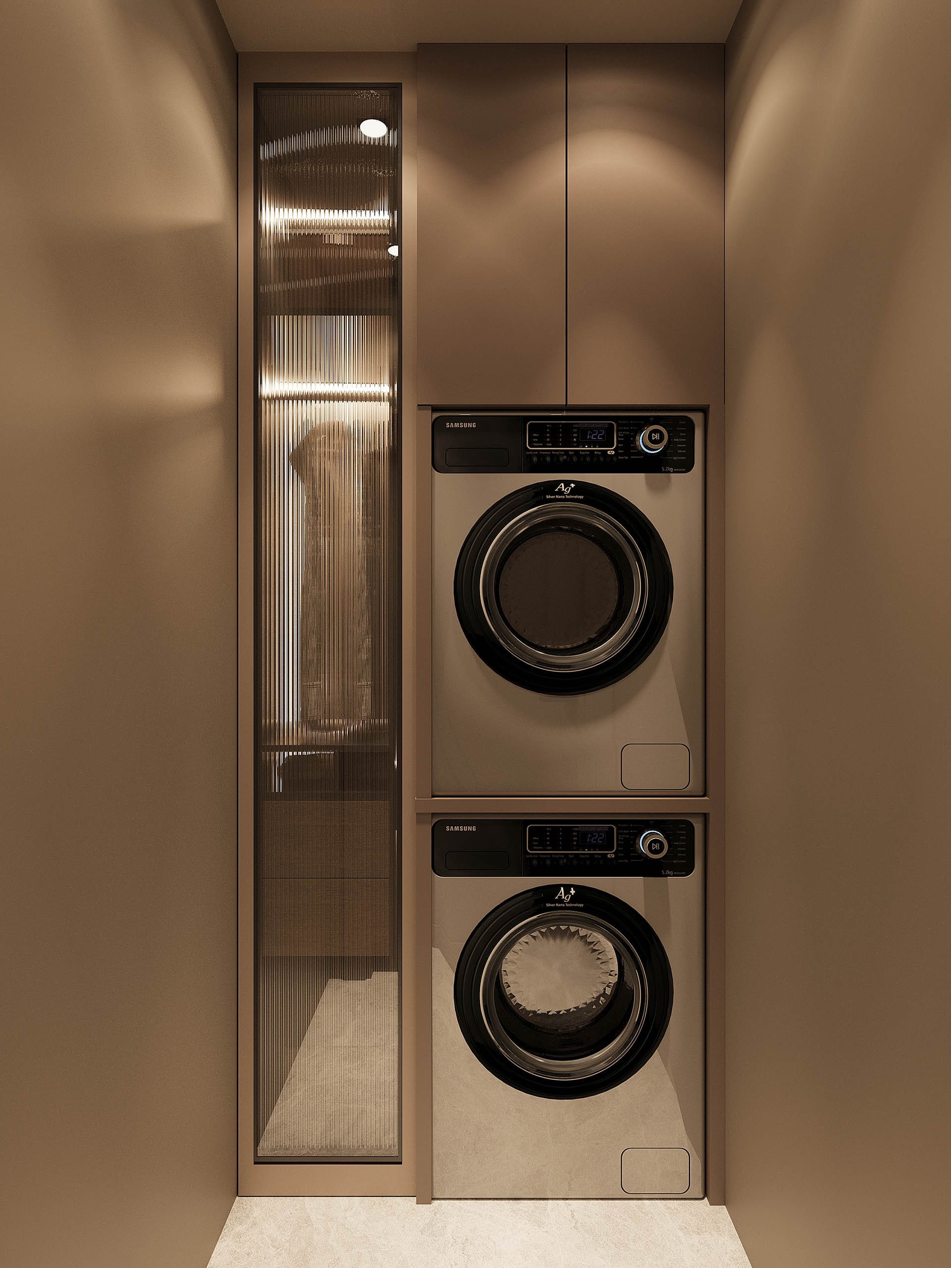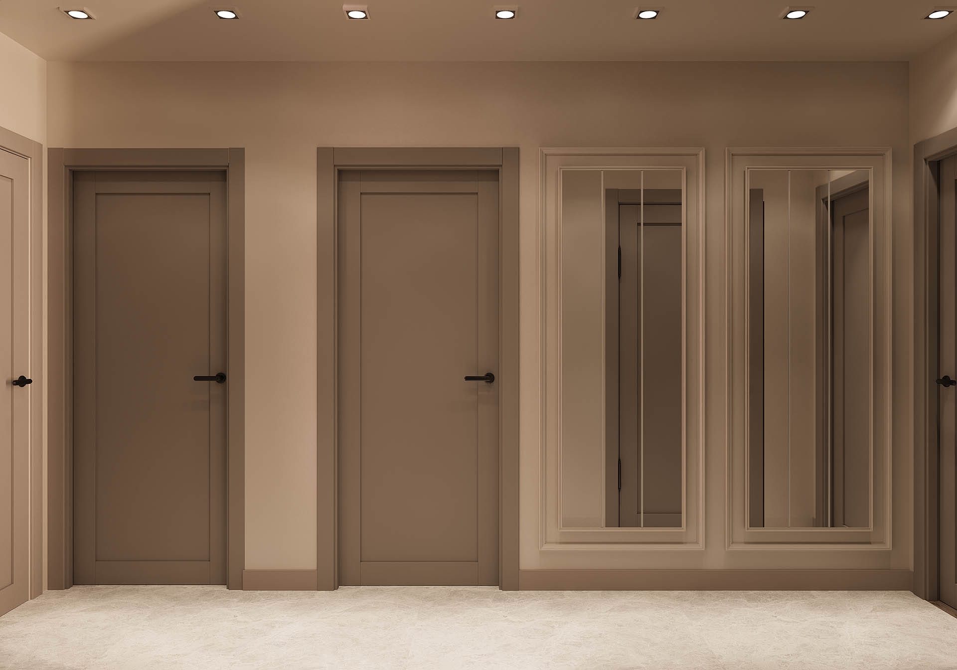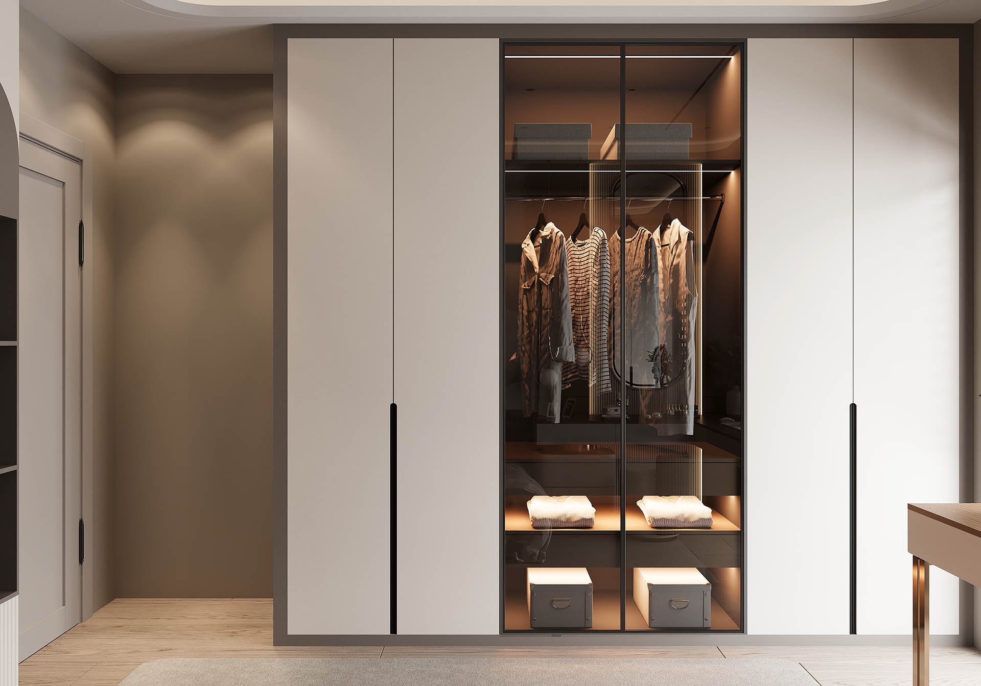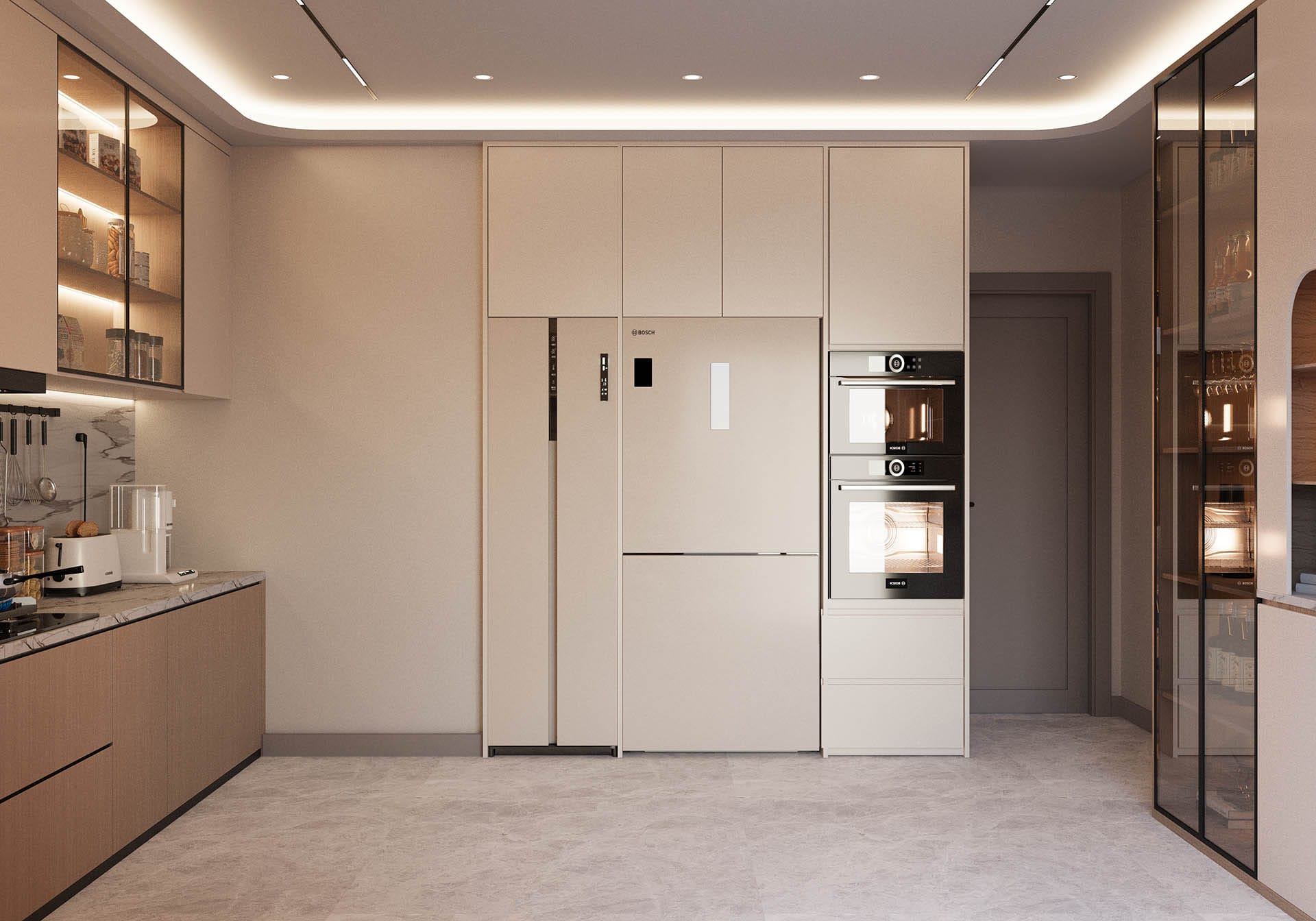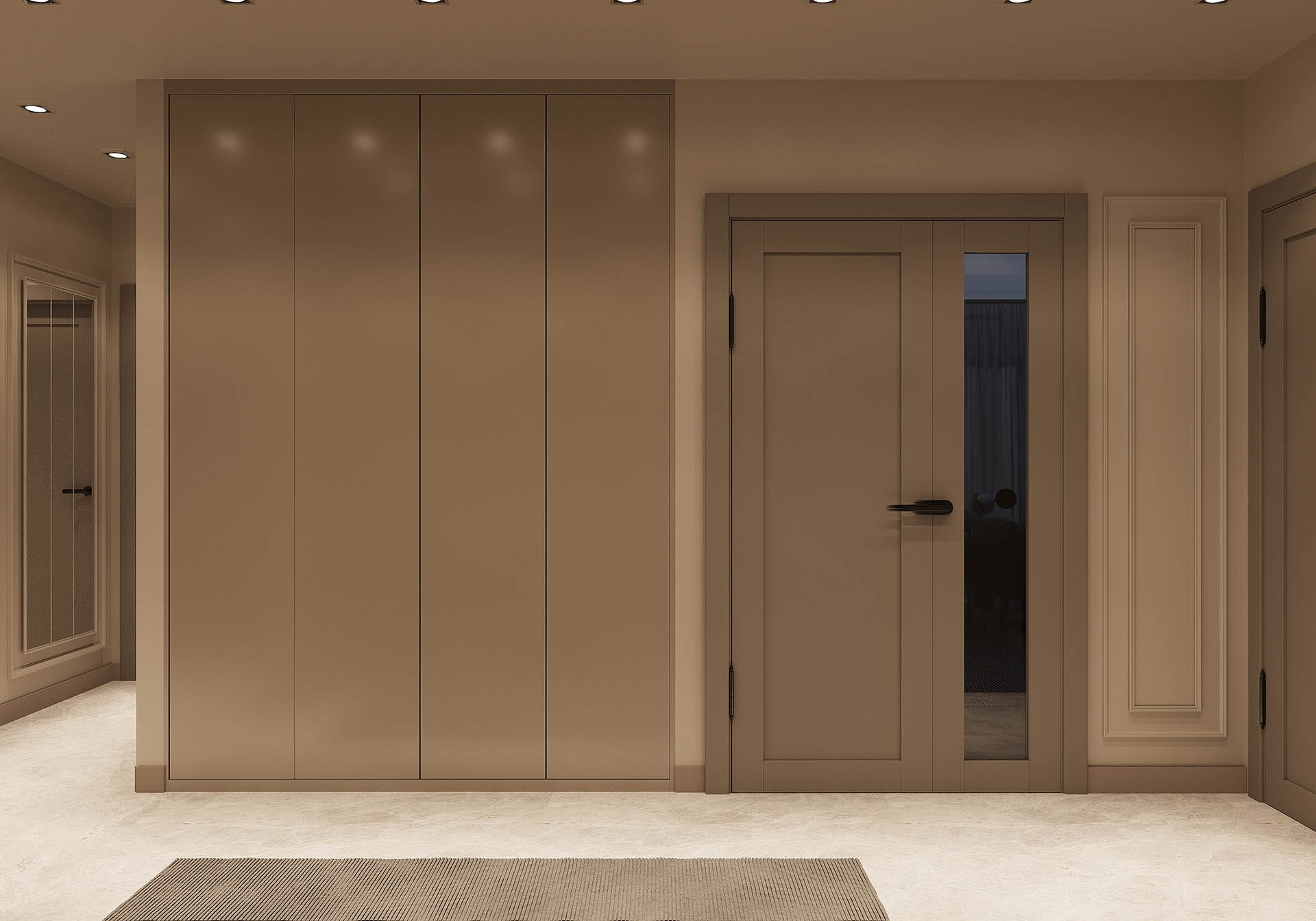 Y.D. Florya Konut Projesi'nin Modern yaşamın her yönünü tasarımla birleştirerek zarif ve fonksiyonel yaşam alanları yaratıyor. İlk görselde, minimalist bir antre tasarımı öne çıkıyor; düzgün hatlara sahip dolaplar, ışıklandırmalar ve ince detaylar modern bir atmosfer oluşturuyor. Tasarımda kullanılan sıcak tonlar, ahşap detaylar ve zarif dekoratif objeler, mekâna samimi ve davetkâr bir hava katıyor.