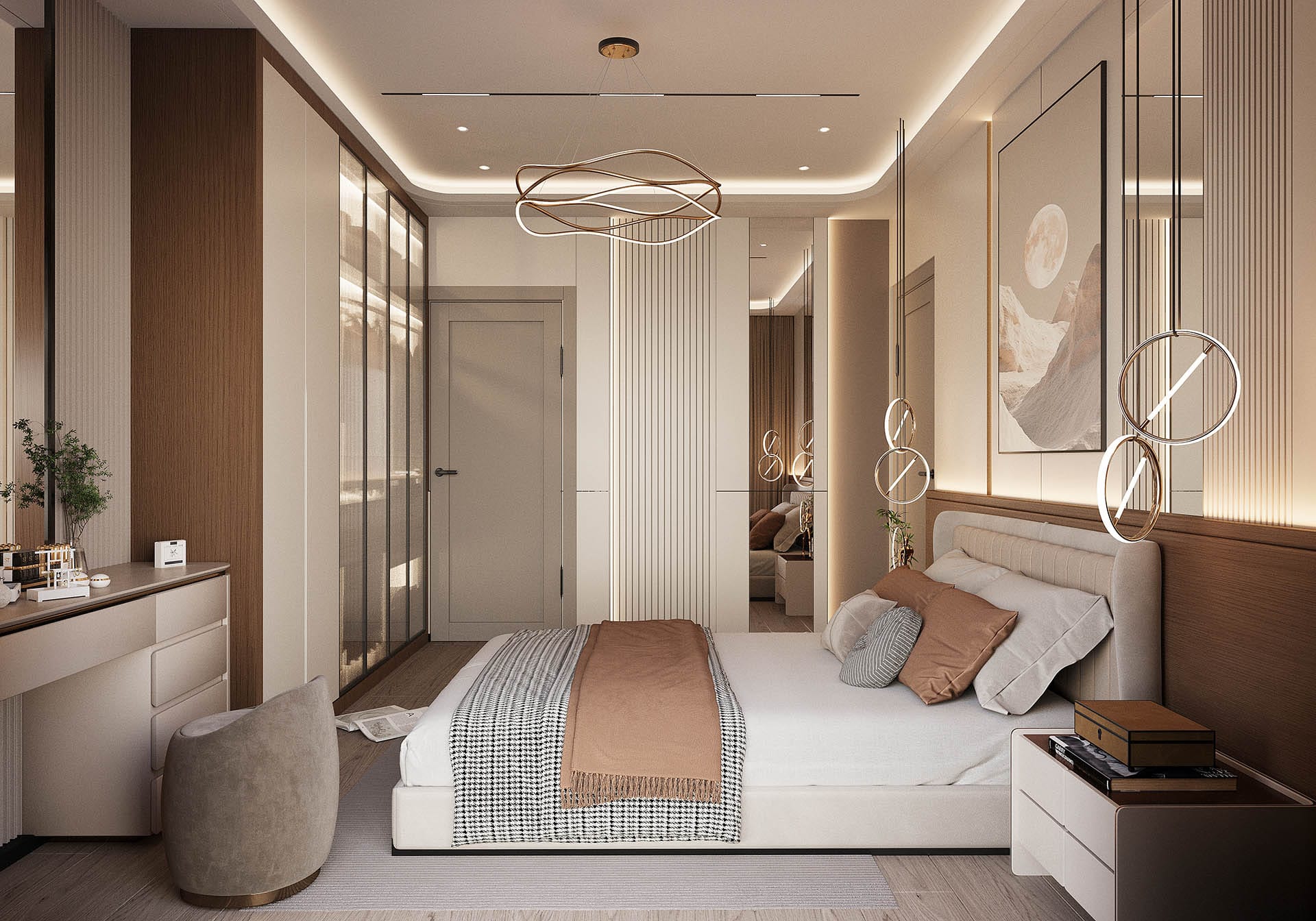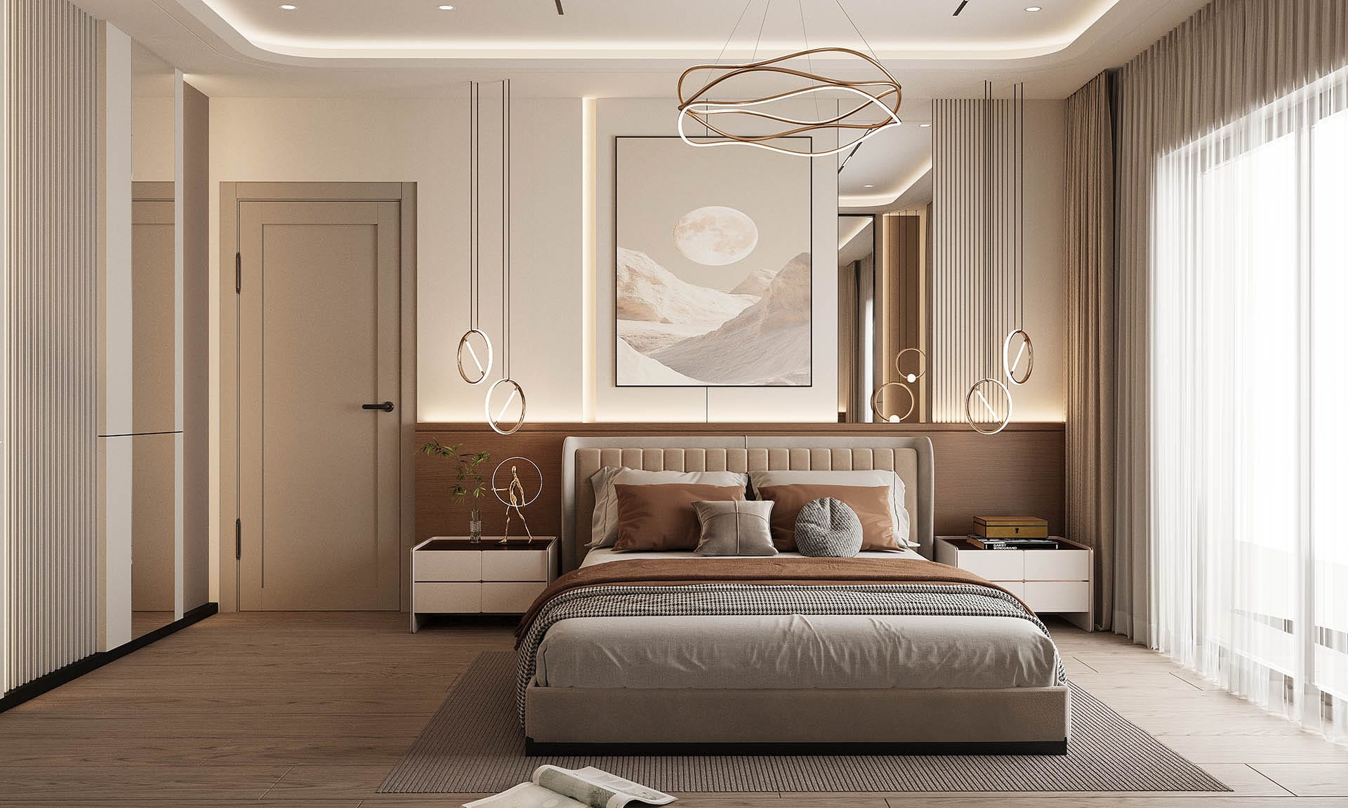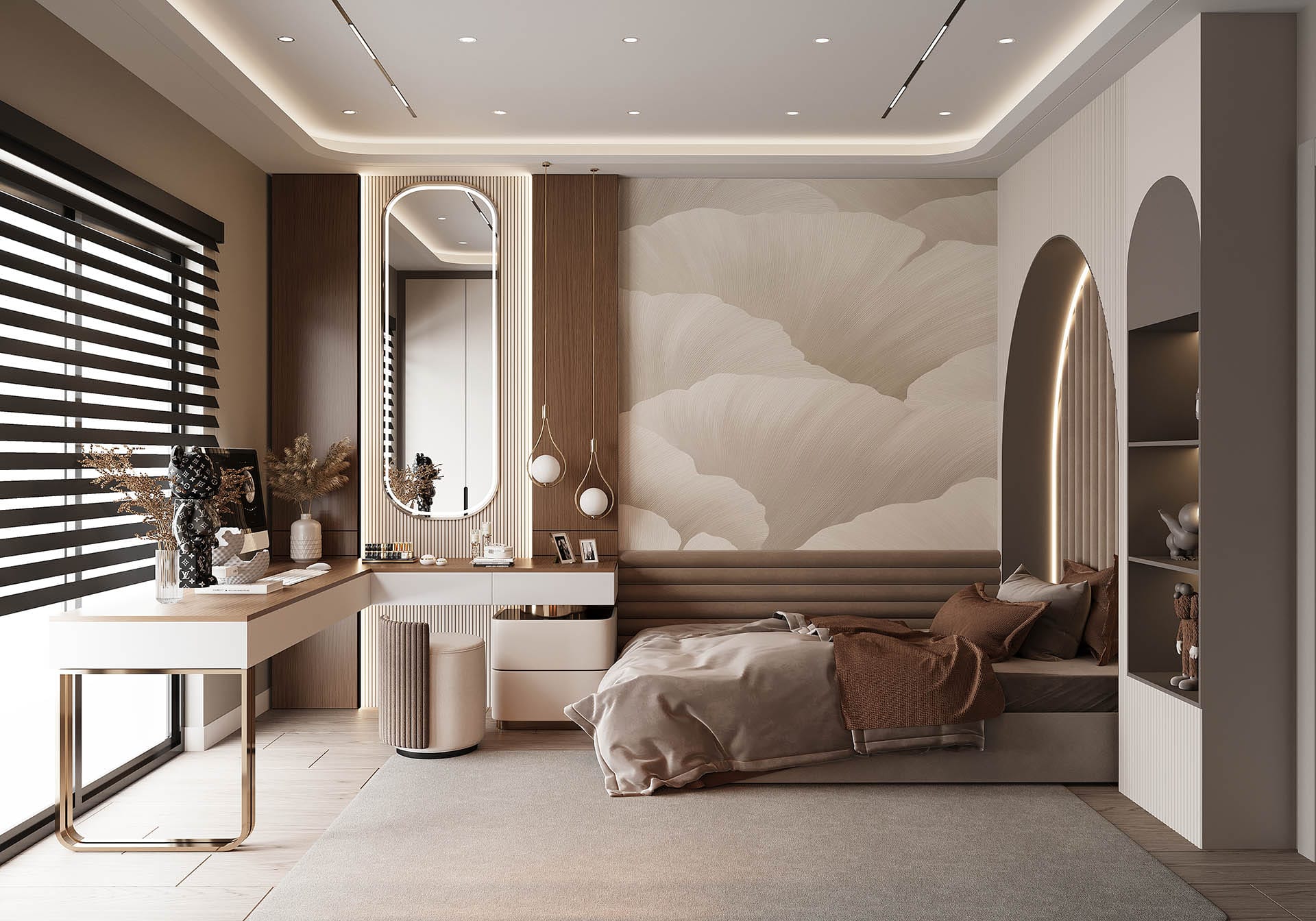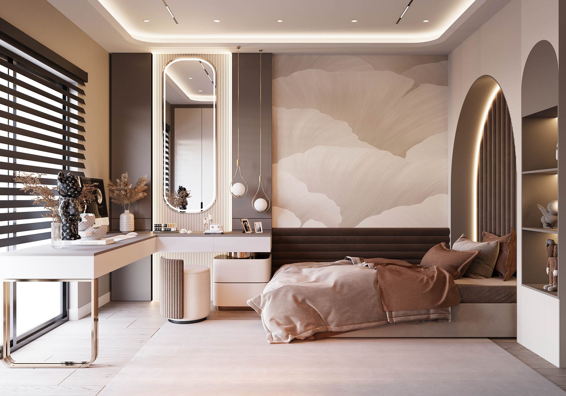 İkinci görselde, yatak odasında rahatlık ve estetik bir arada sunuluyor. Yumuşak renkler, şık bir yatak başlığı ve duvarda yer alan büyük, organik desenli bir duvar kağıdı, odanın sakinleştirici atmosferini pekiştiriyor. Ayrıca, büyük aydınlatma elemanları ve modern aksesuarlarla oda, zarafetten ödün vermeyen bir tasarıma sahip.