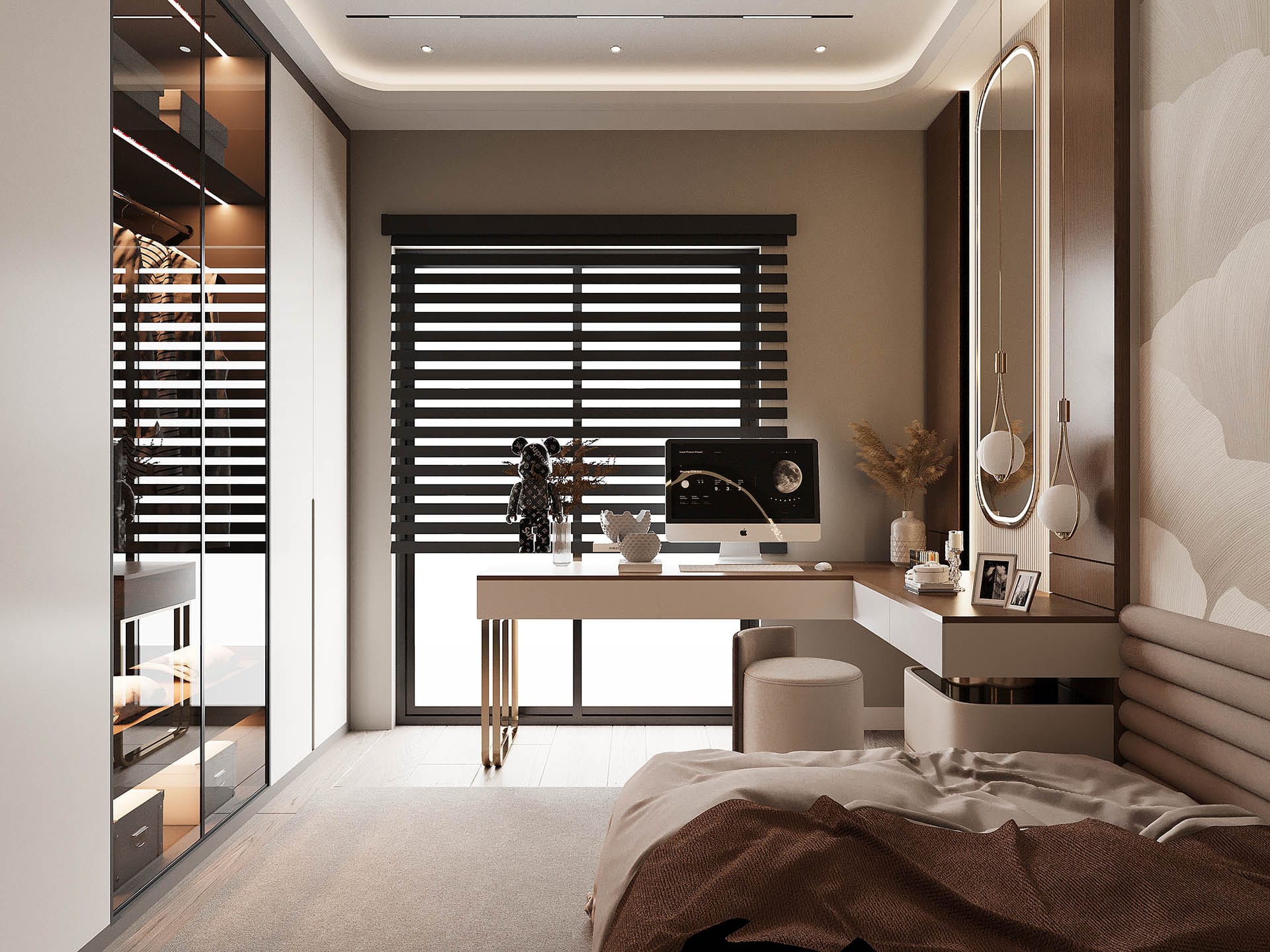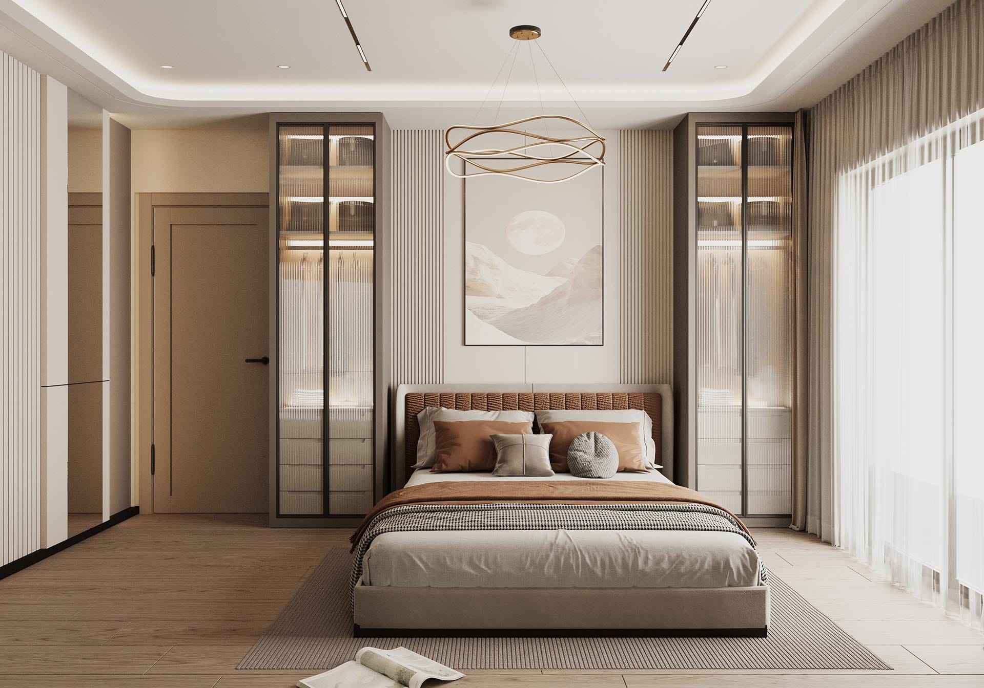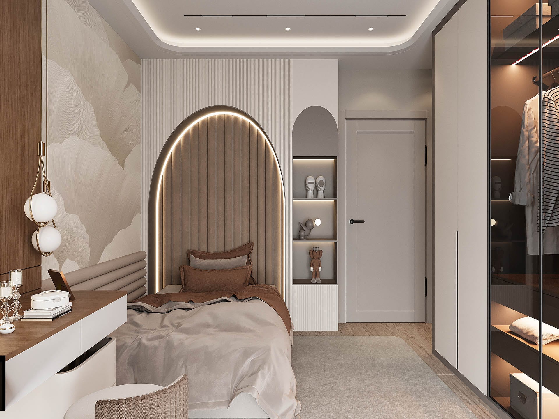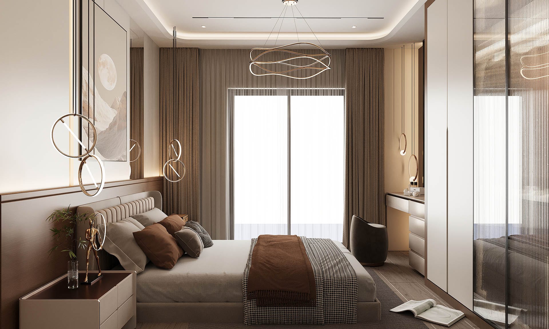 İkinci görselde, yatak odasında rahatlık ve estetik bir arada sunuluyor. Yumuşak renkler, şık bir yatak başlığı ve duvarda yer alan büyük, organik desenli bir duvar kağıdı, odanın sakinleştirici atmosferini pekiştiriyor. Ayrıca, büyük aydınlatma elemanları ve modern aksesuarlarla oda, zarafetten ödün vermeyen bir tasarıma sahip.