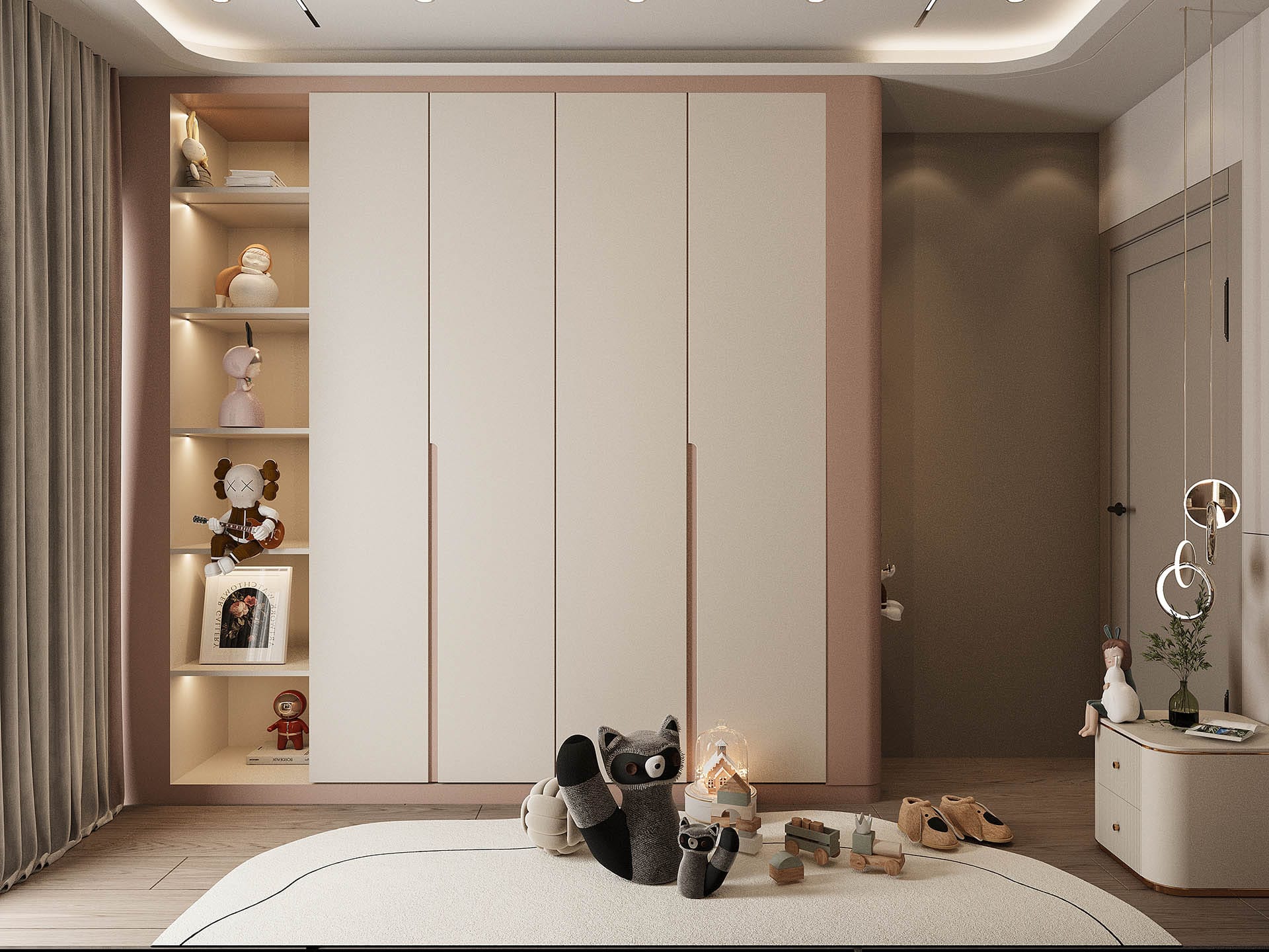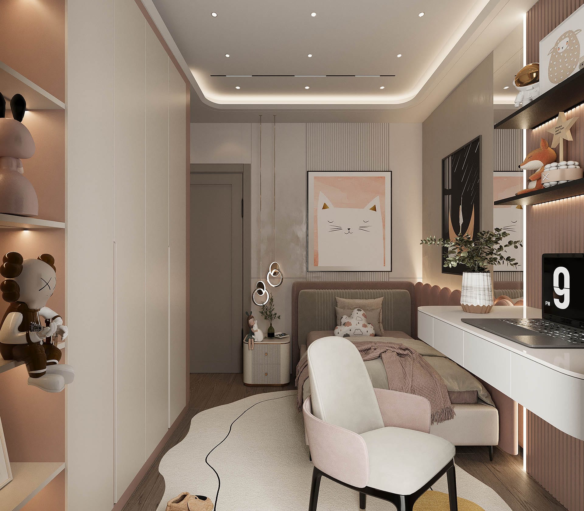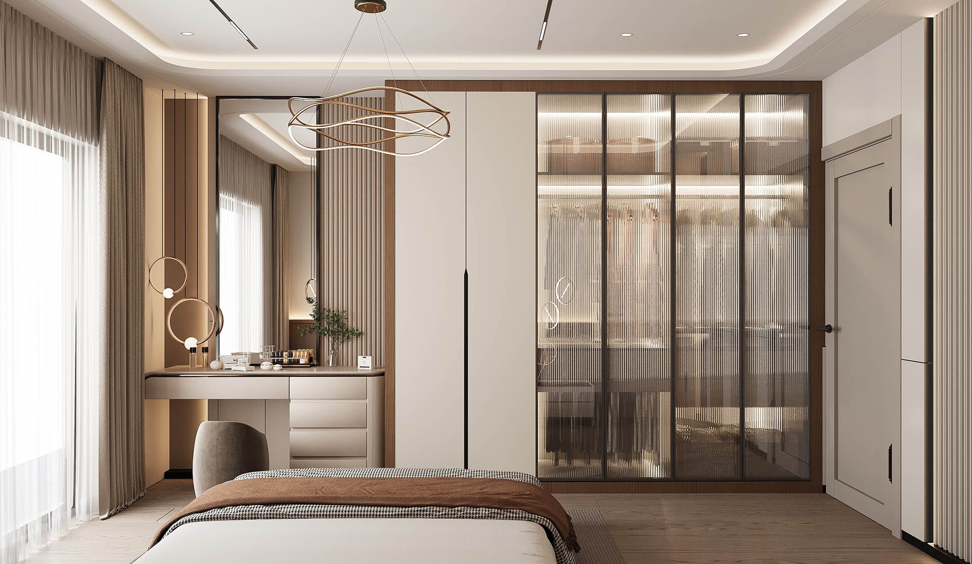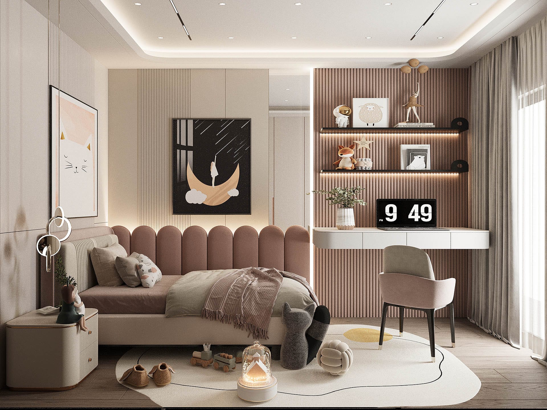 İkinci görselde, yatak odasında rahatlık ve estetik bir arada sunuluyor. Yumuşak renkler, şık bir yatak başlığı ve duvarda yer alan büyük, organik desenli bir duvar kağıdı, odanın sakinleştirici atmosferini pekiştiriyor. Ayrıca, büyük aydınlatma elemanları ve modern aksesuarlarla oda, zarafetten ödün vermeyen bir tasarıma sahip.
