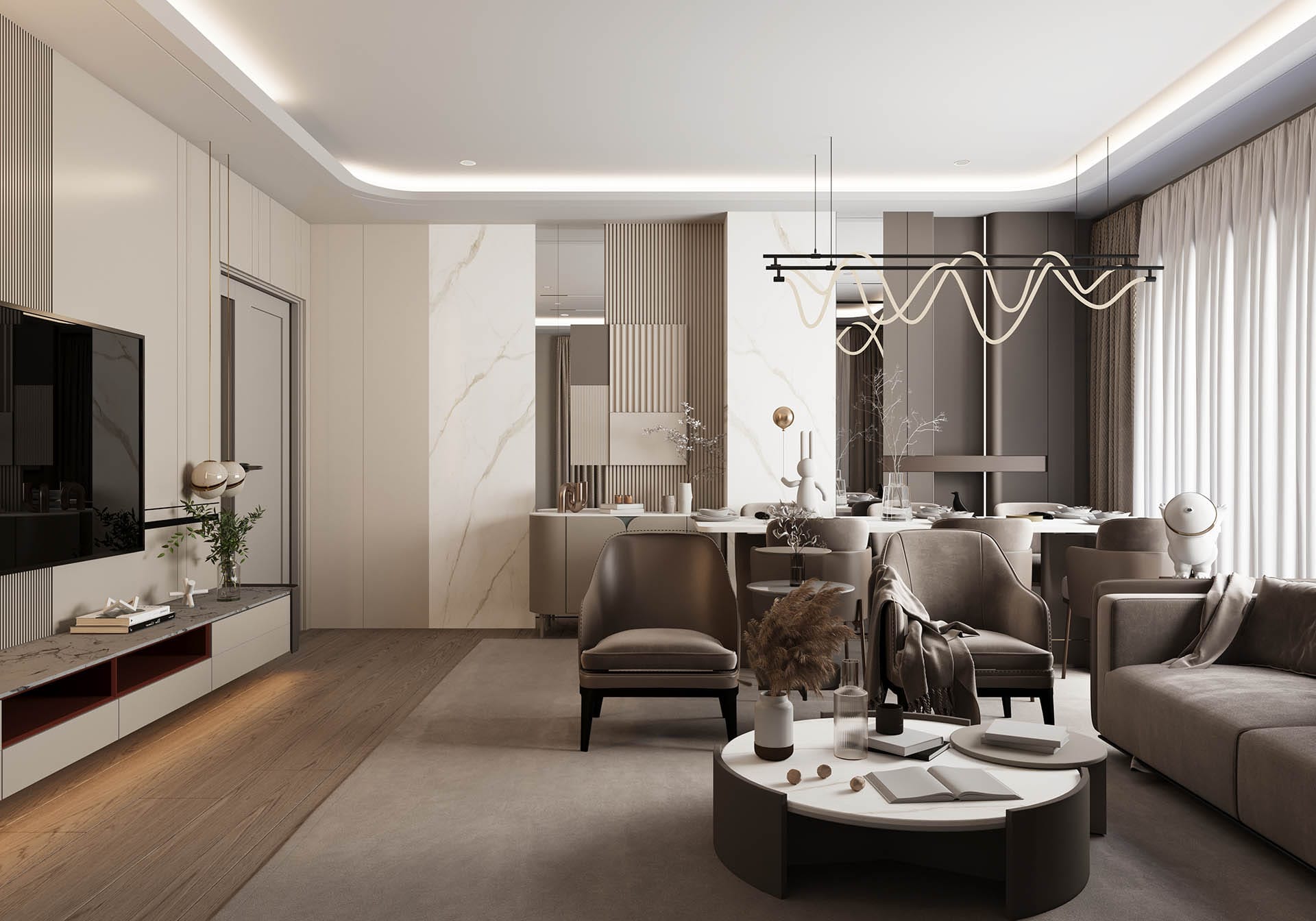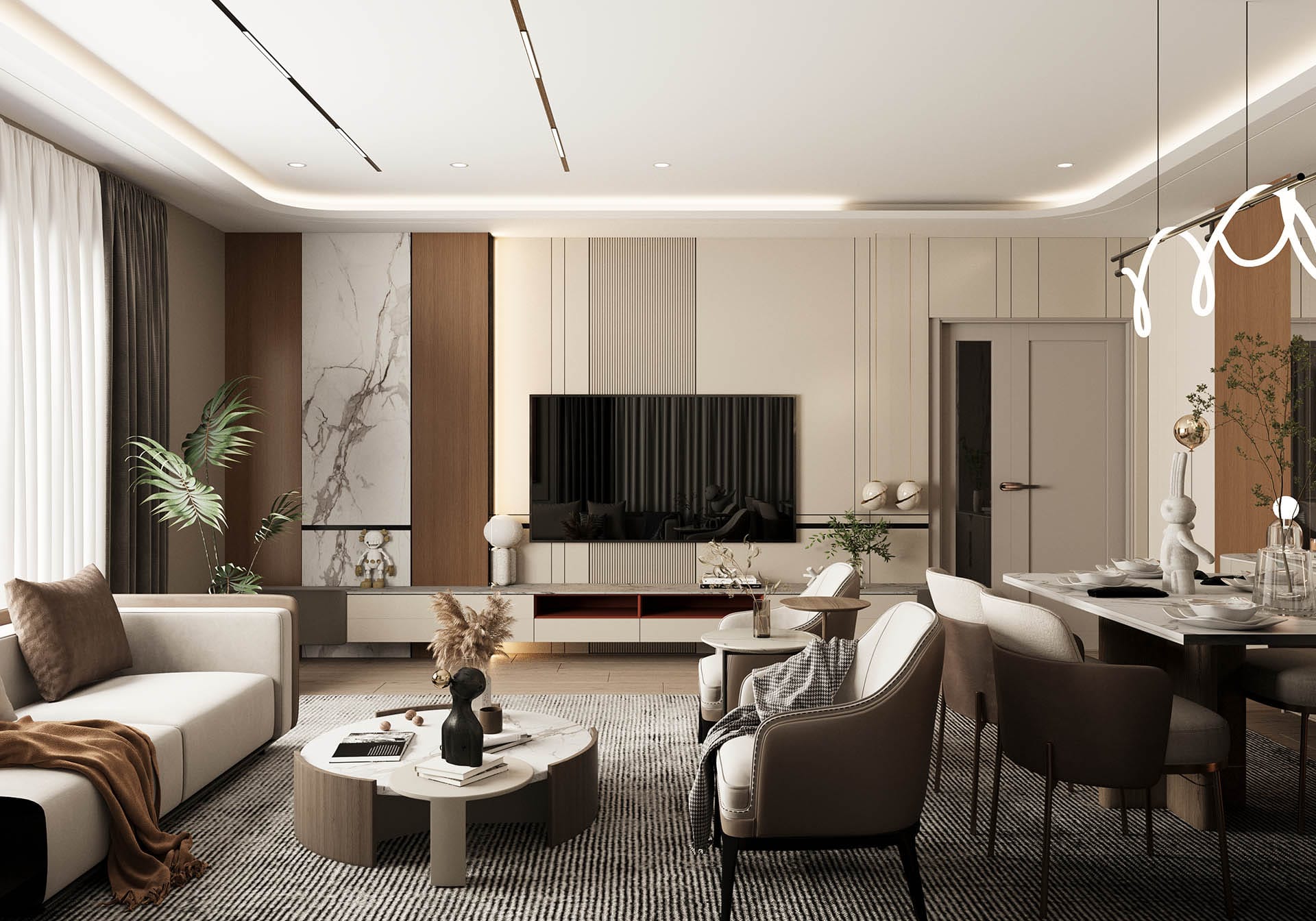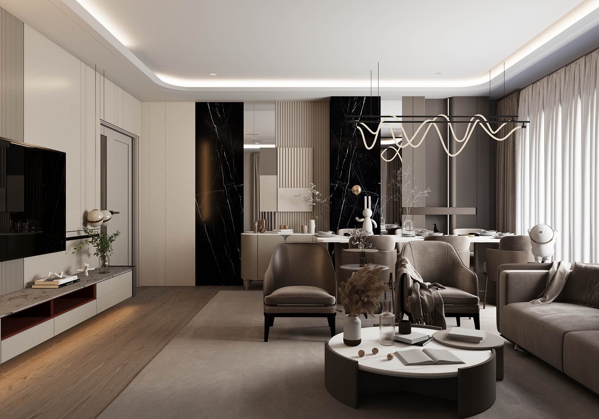 Üçüncü görselde ise oturma odası ve yemek alanı arasındaki geçişler, ferah ve fonksiyonel bir yaşam alanı sunuyor. Yüksek kaliteli malzemelerle tasarlanmış mobilyalar, zarif aydınlatmalar ve şık dekorasyon, mekanı hem estetik hem de konforlu hale getiriyor. Siyah mermer ve doğal taş yüzeyler, lüks bir dokunuş katarken, ahşap detaylar sıcaklık ve doğallık sağlıyor.