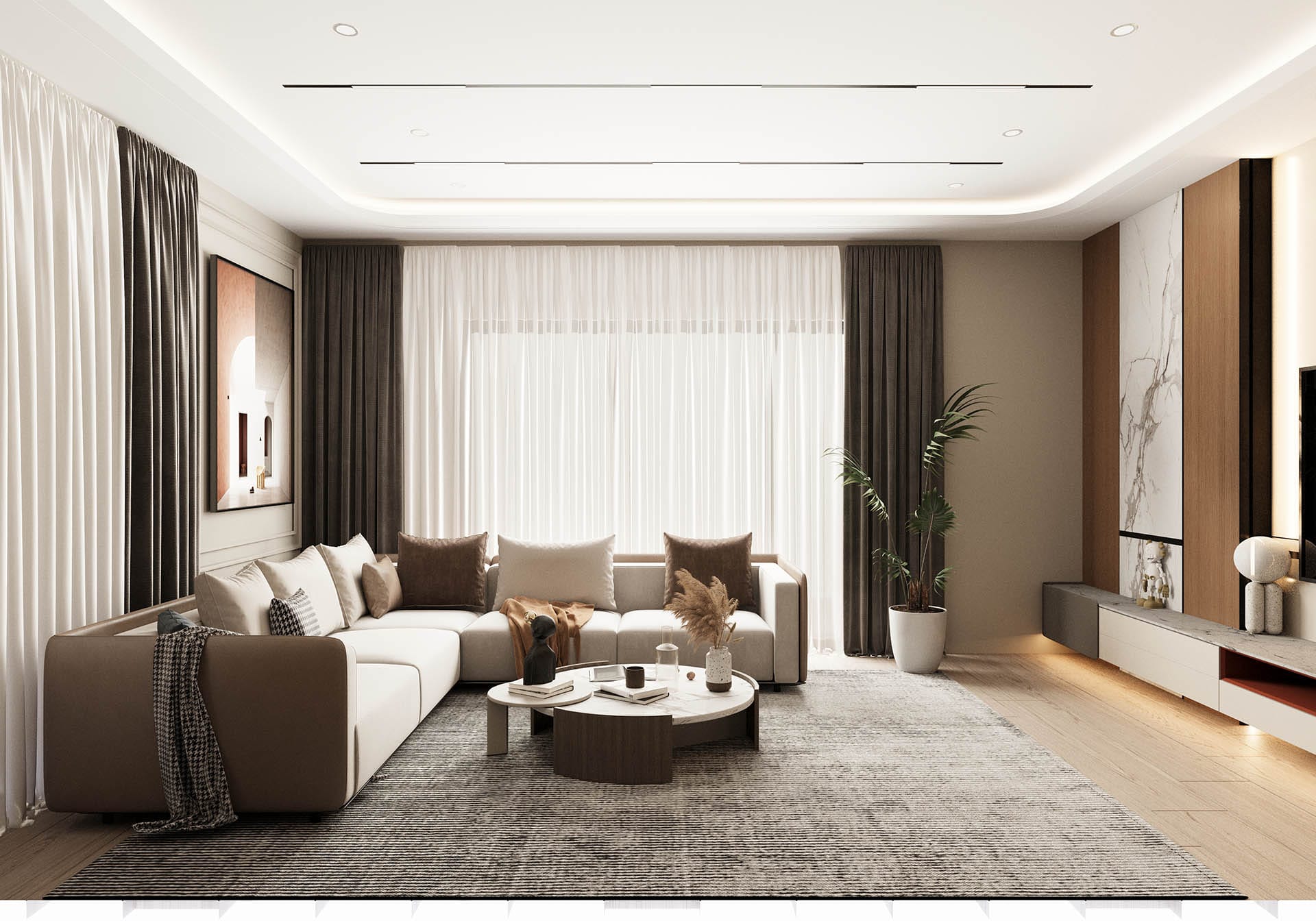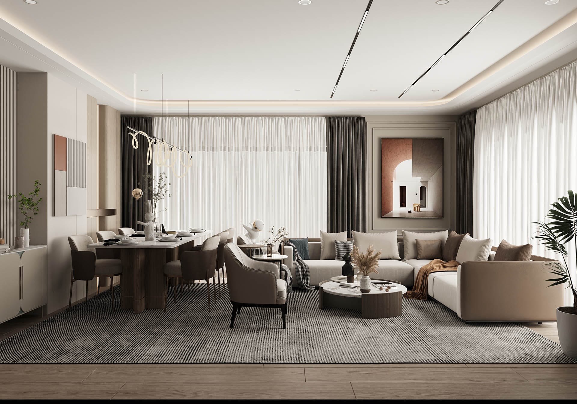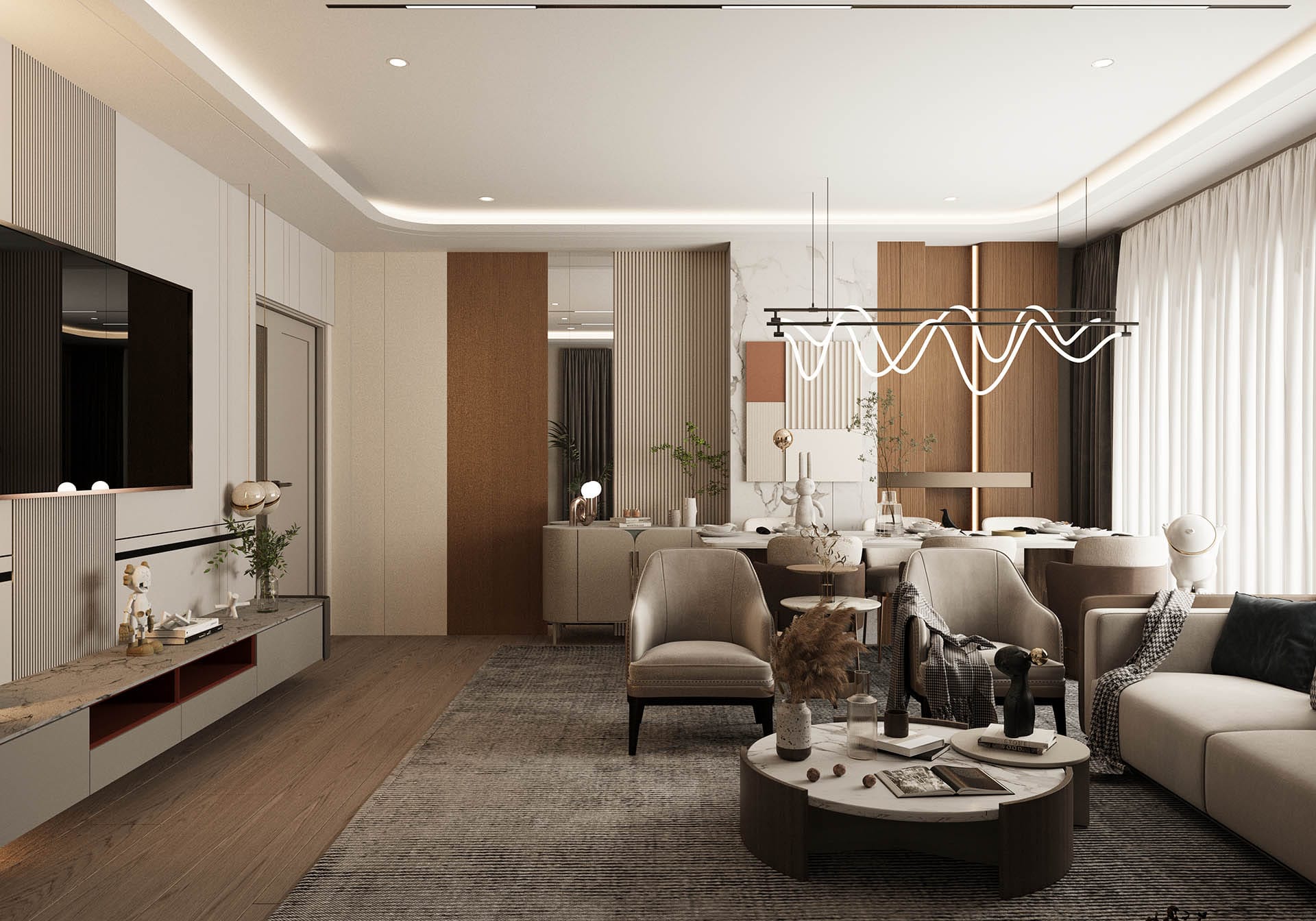 Üçüncü görselde ise oturma odası ve yemek alanı arasındaki geçişler, ferah ve fonksiyonel bir yaşam alanı sunuyor. Yüksek kaliteli malzemelerle tasarlanmış mobilyalar, zarif aydınlatmalar ve şık dekorasyon, mekanı hem estetik hem de konforlu hale getiriyor. Siyah mermer ve doğal taş yüzeyler, lüks bir dokunuş katarken, ahşap detaylar sıcaklık ve doğallık sağlıyor.